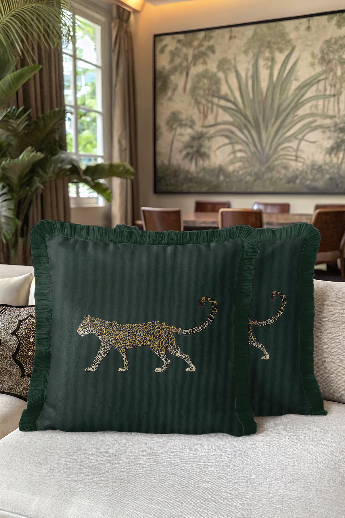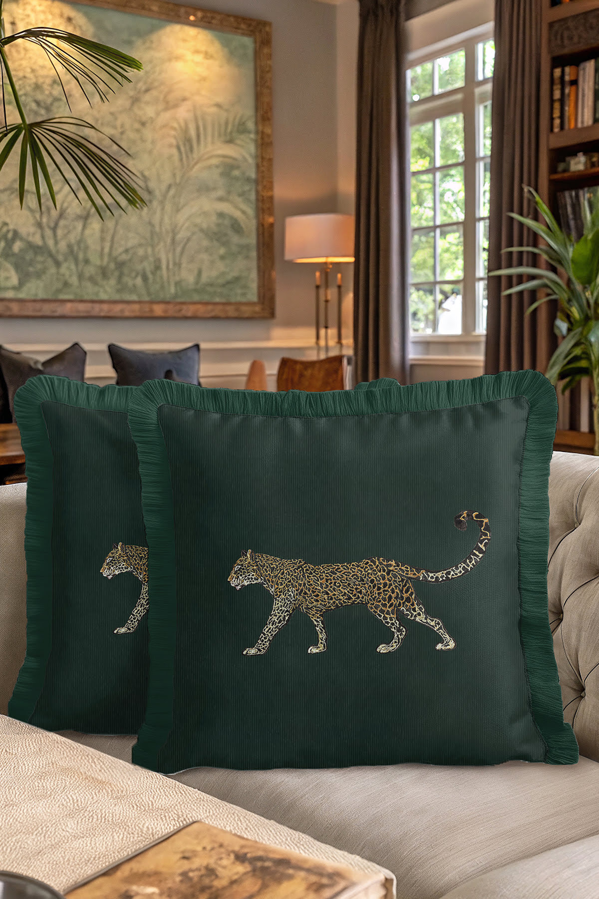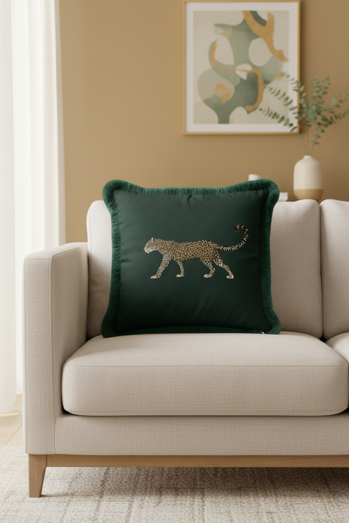 Evimde Bambaşka Luxury Leopard Pattern Fringed Pillowcase - Sapphire Green Elegant Bohemian Tassel Pillowcase | ByTR