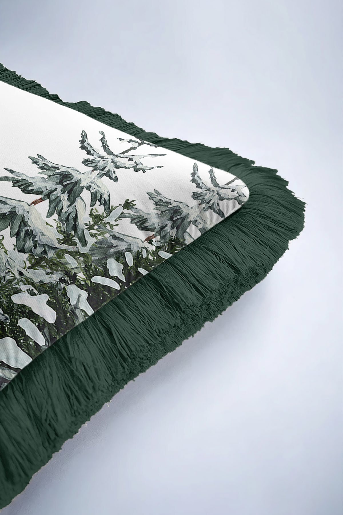 Christmas Pine Tree Themed Dark Green Tasseled Pillowcase Made of60% Cotton + 40% Polyester fabric with a soft velvet texture.