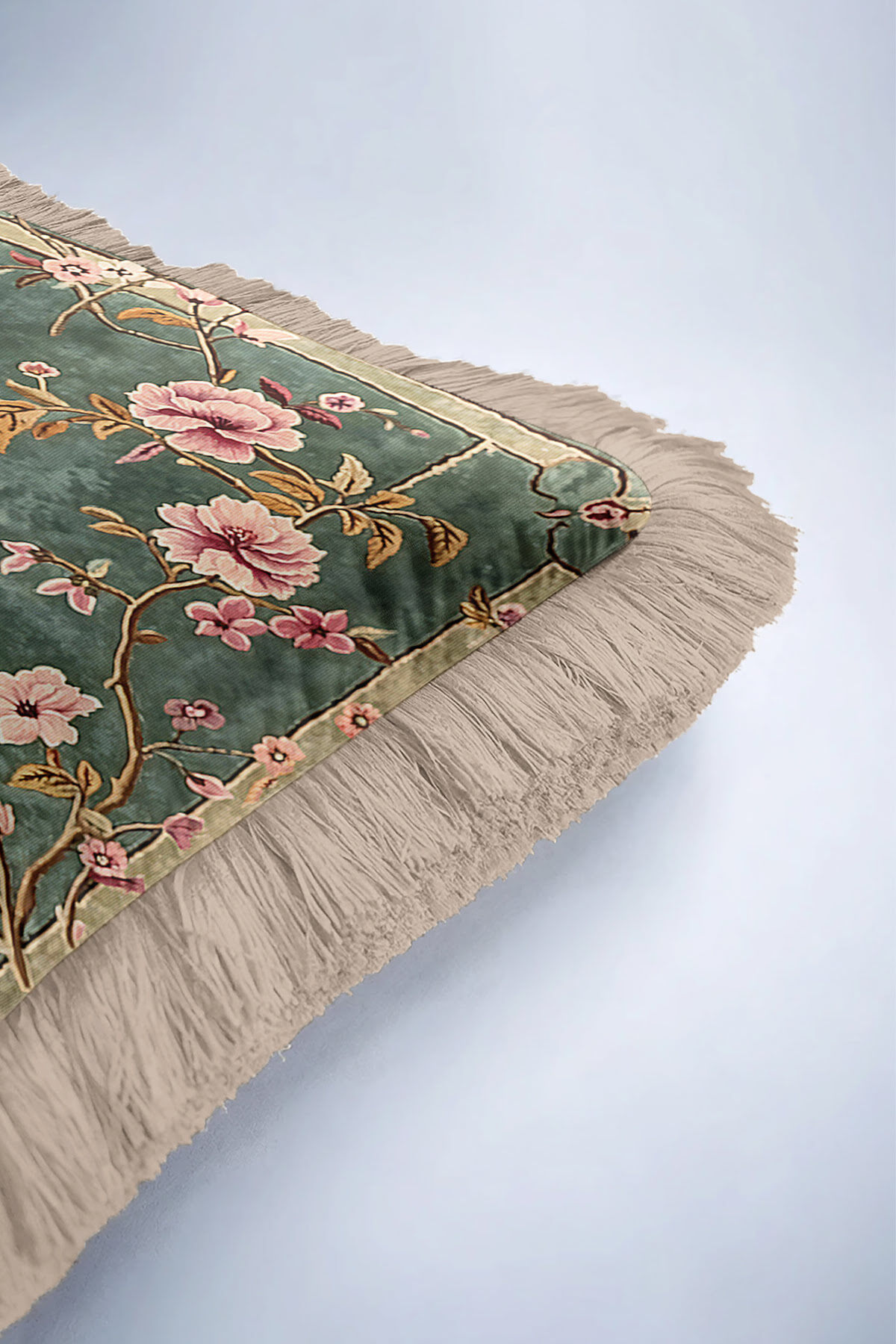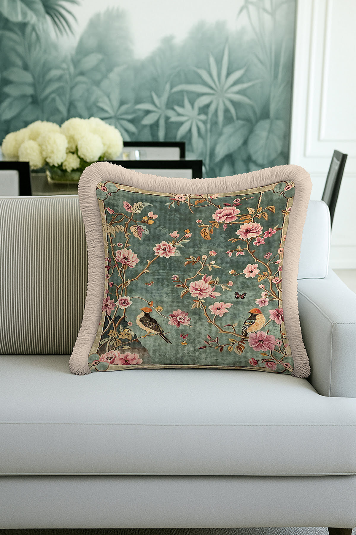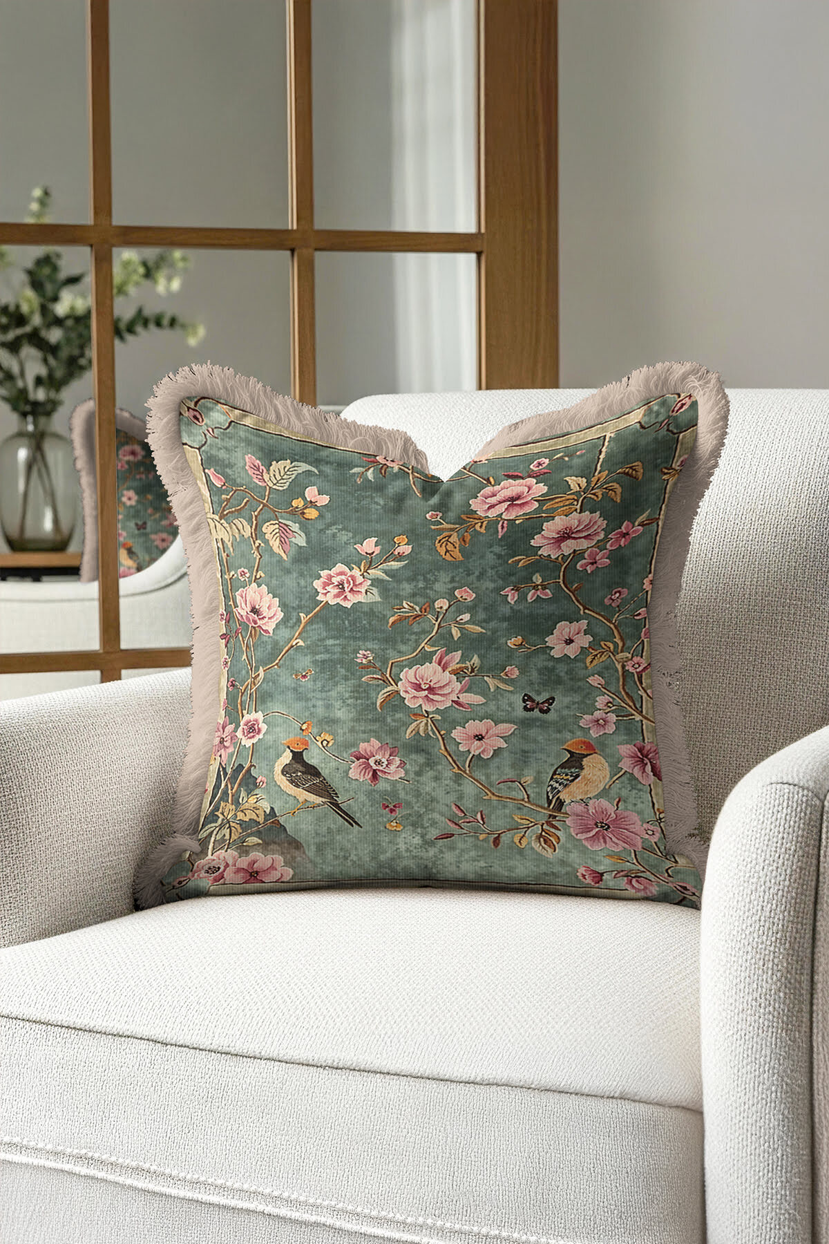Evimde Bambaşka Luxury Floral Bird Pattern Fringed Pillowcase - Vintage Green Powder Rustic Tassel Pillowcase | ByTR