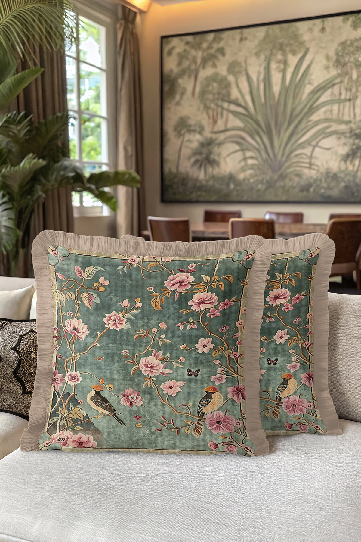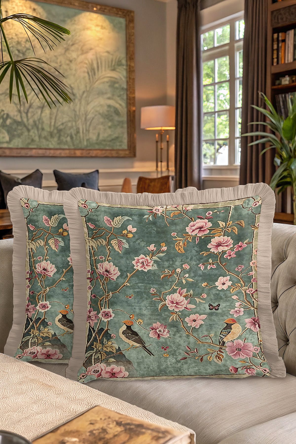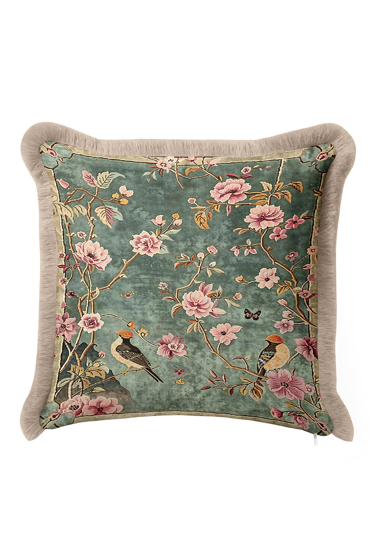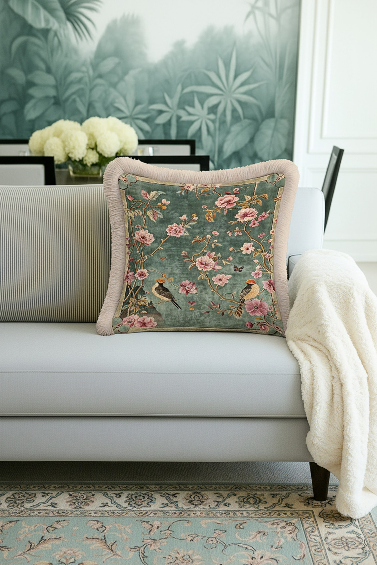 Evimde Bambaşka Luxury Floral Bird Pattern Fringed Pillowcase - Vintage Green Powder Rustic Tassel Pillowcase | ByTR