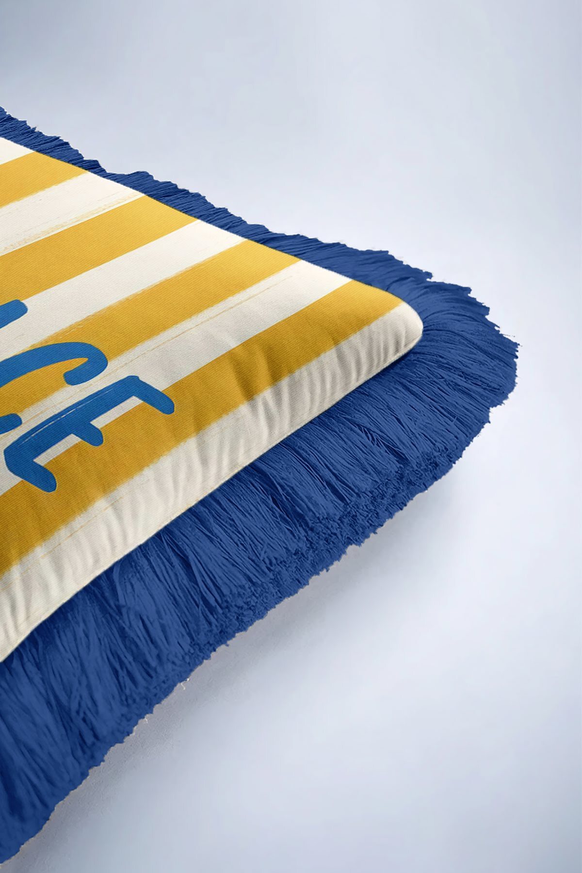 Striped Blue Yellow Modern Navy Blue Tasseled Pillowcase Made of60% Cotton + 40% Polyester fabric with a soft velvet texture.