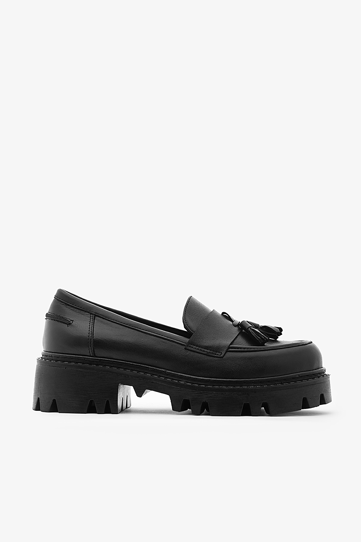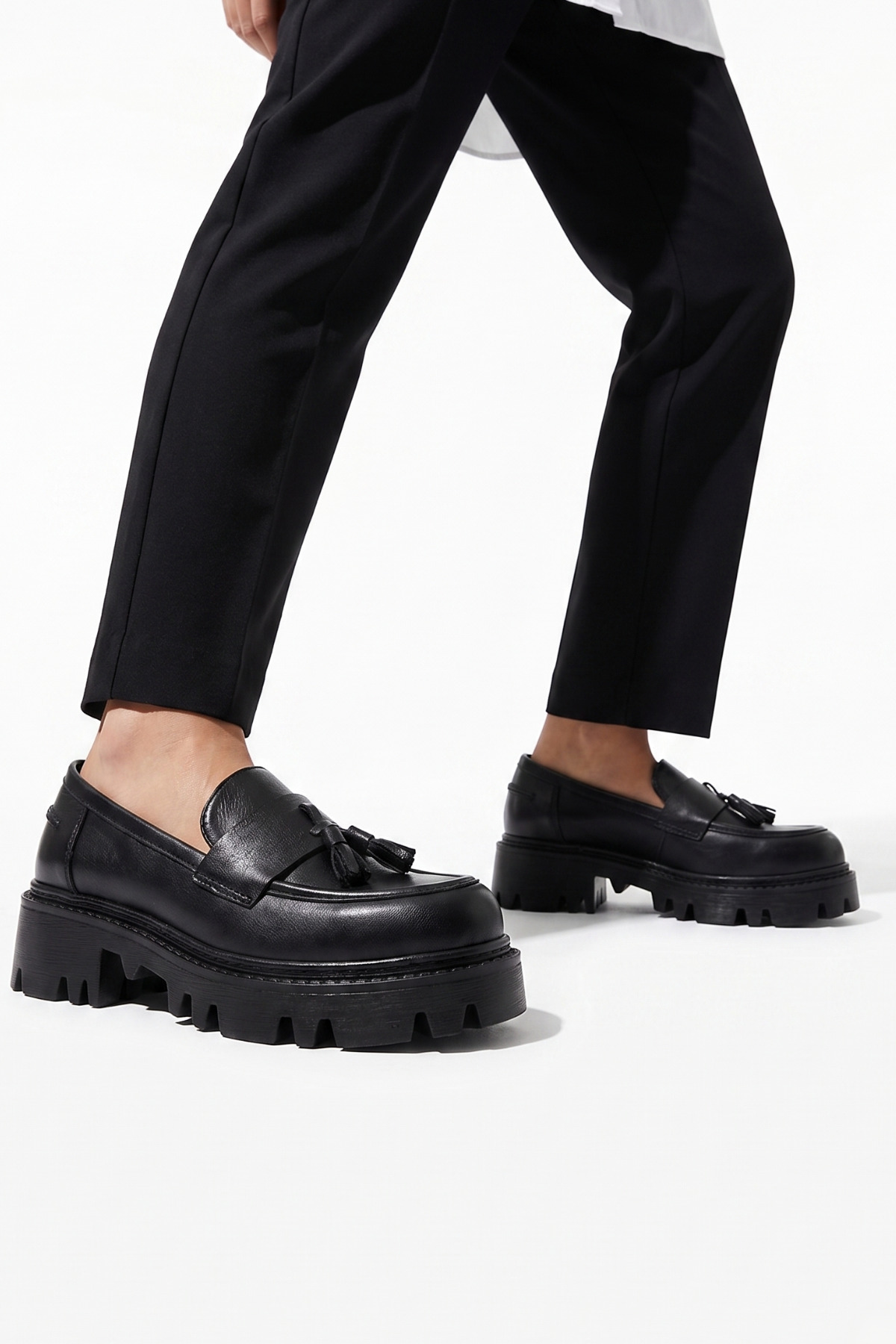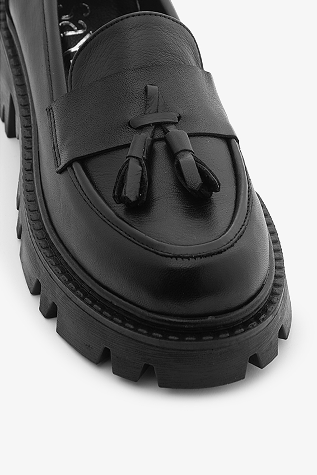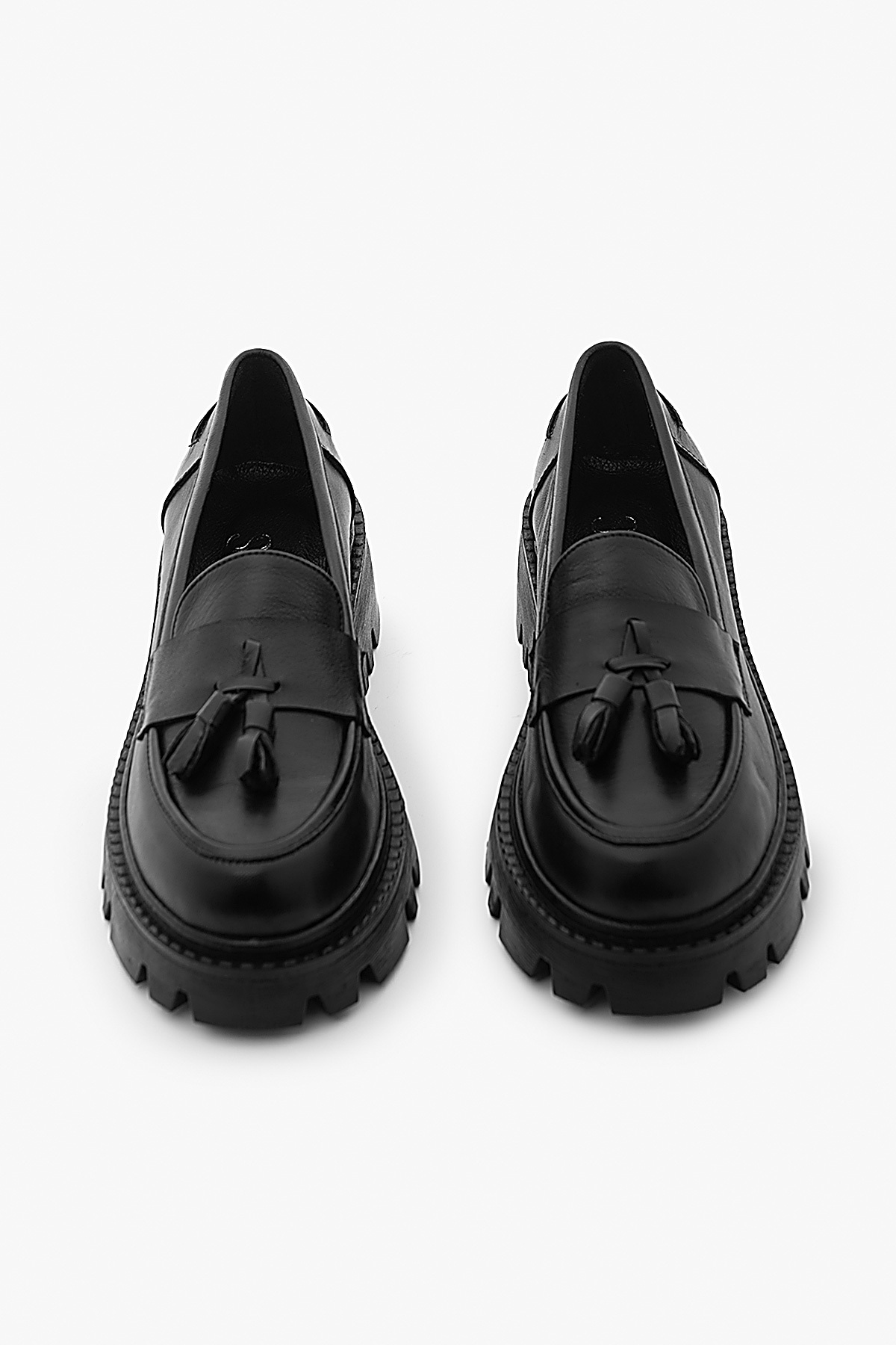 Black Genuine Leather Fringed Thick Sole Women's Loafer Shoes