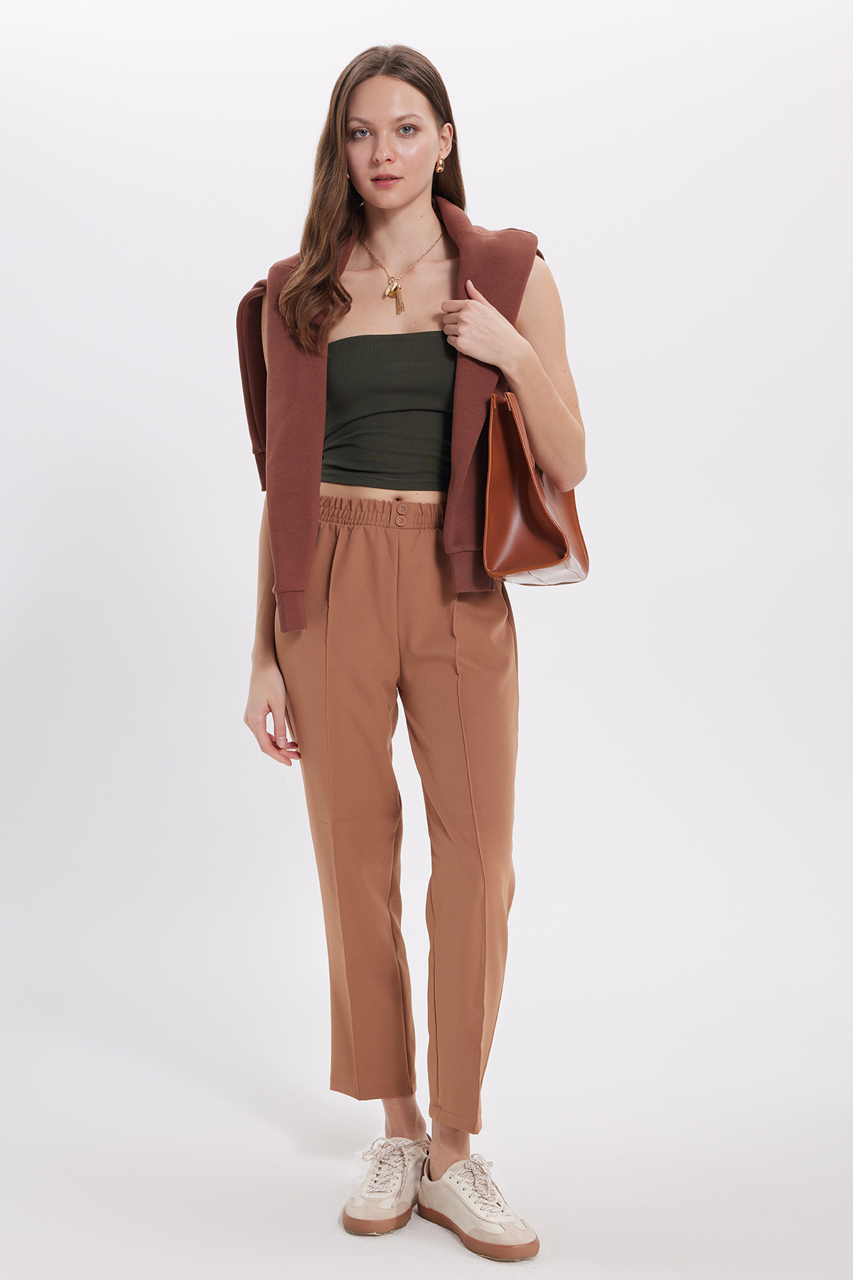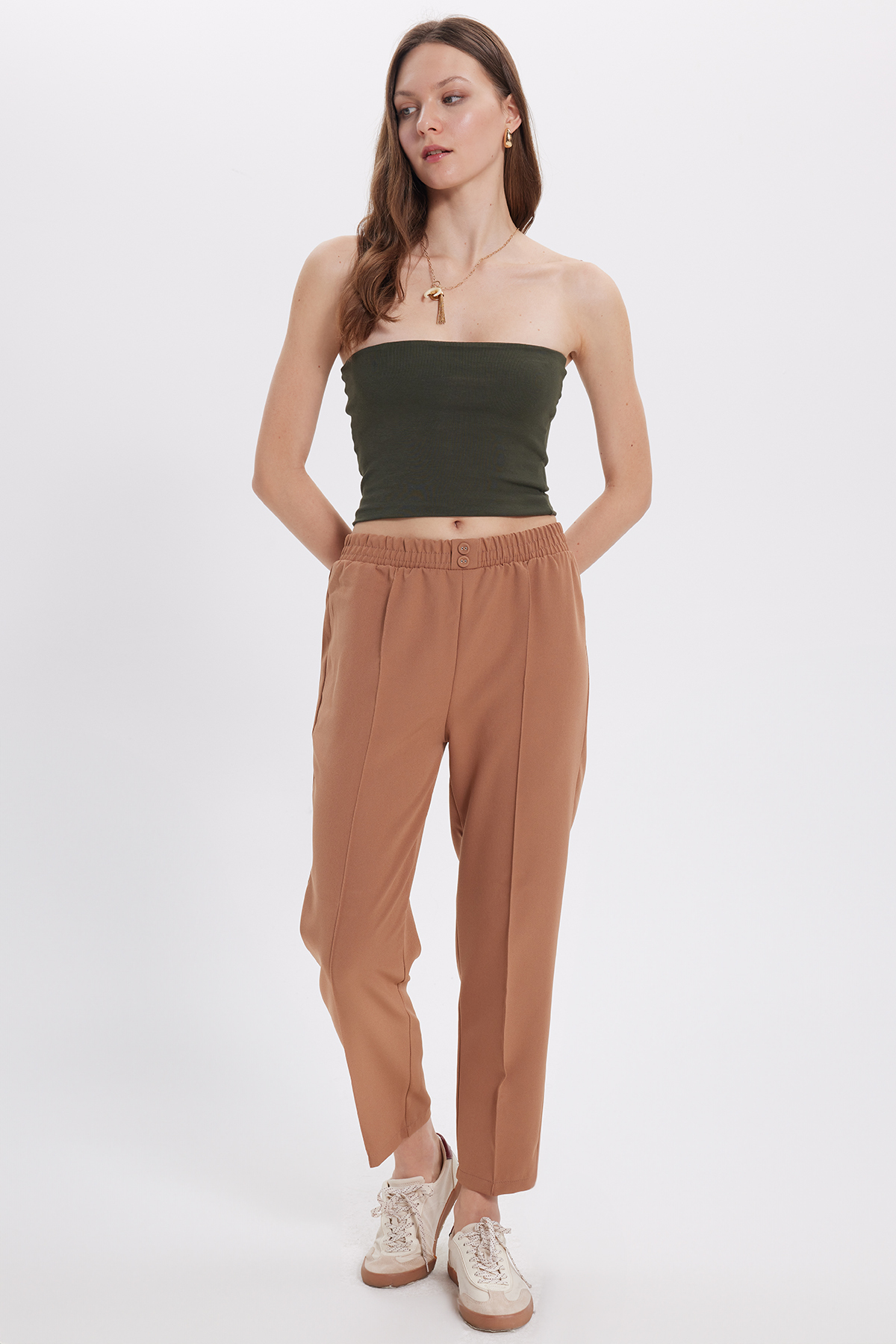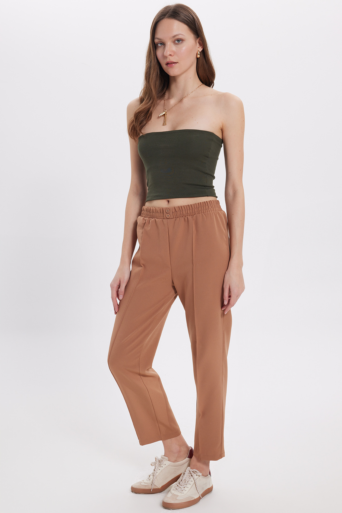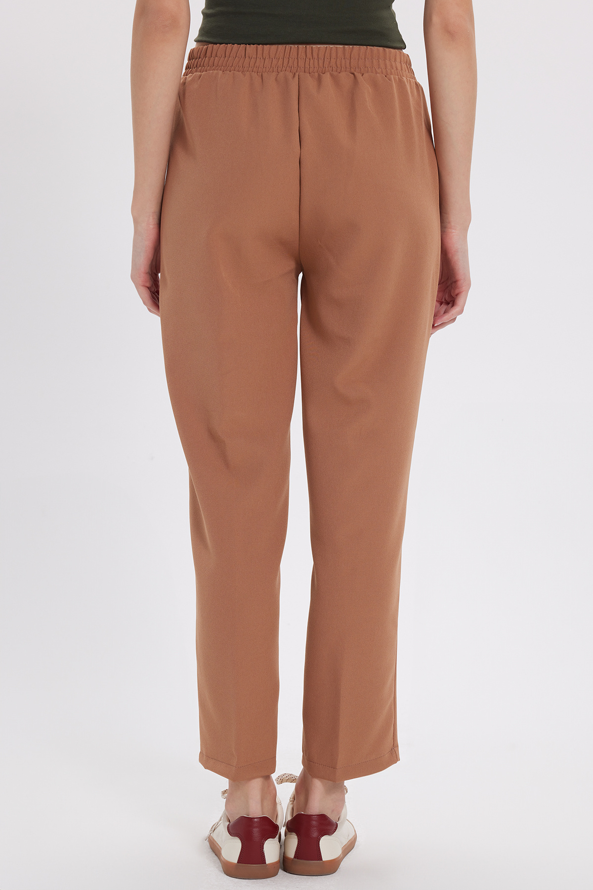 Tudors Women's Relax Fit Casual Fit High Waist Straight Leg Elastic Waist Beige Pants | ByTR