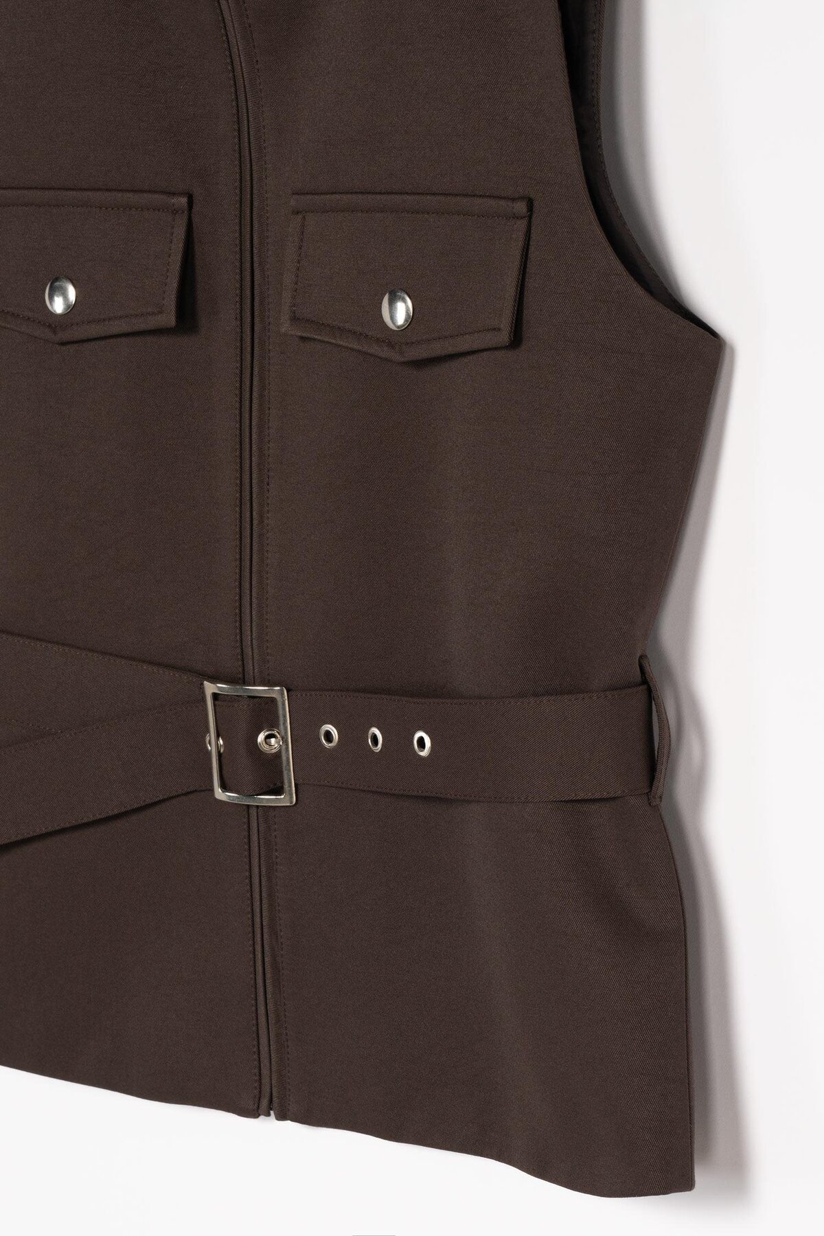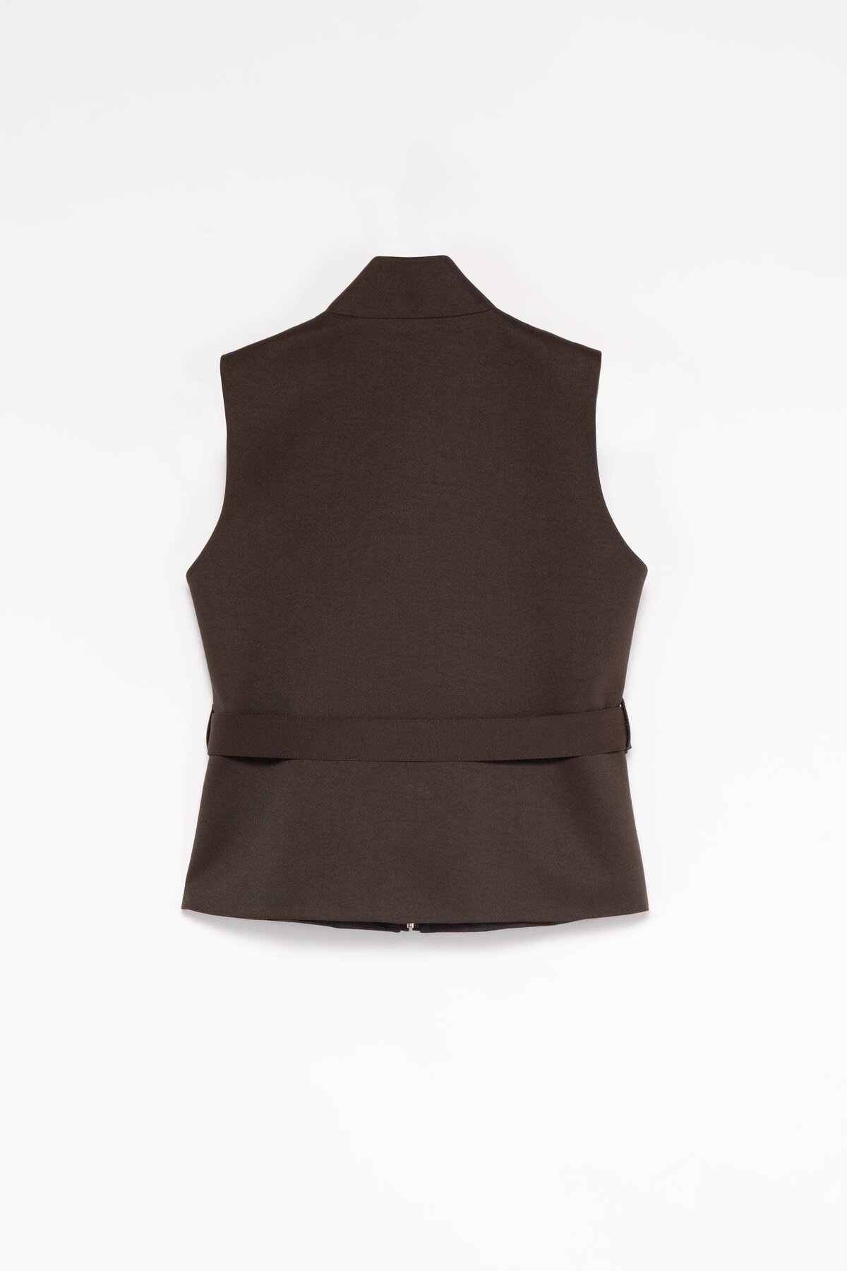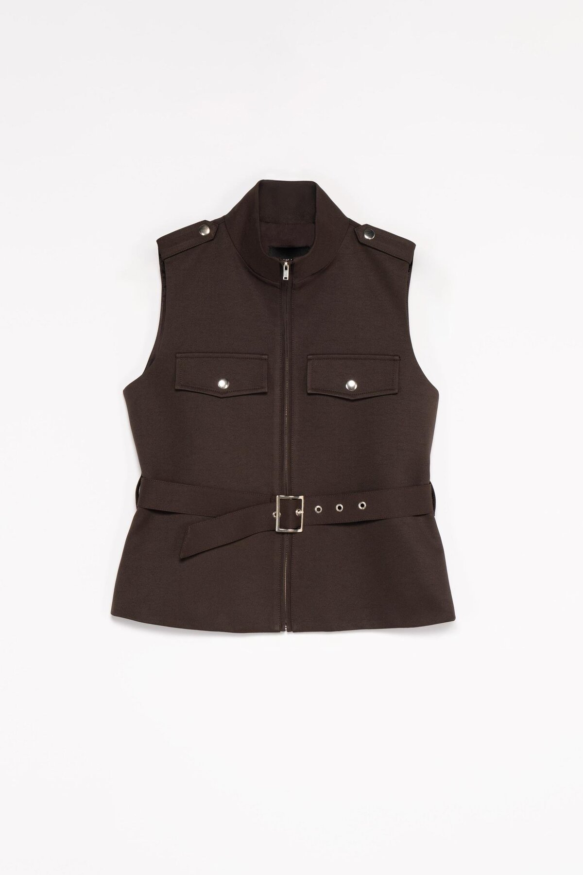 Vest with Dark Brown Upright Collar Epaulette Functional city-safari style: strong silhouette with upright collar, epaulette and adjustable belt.