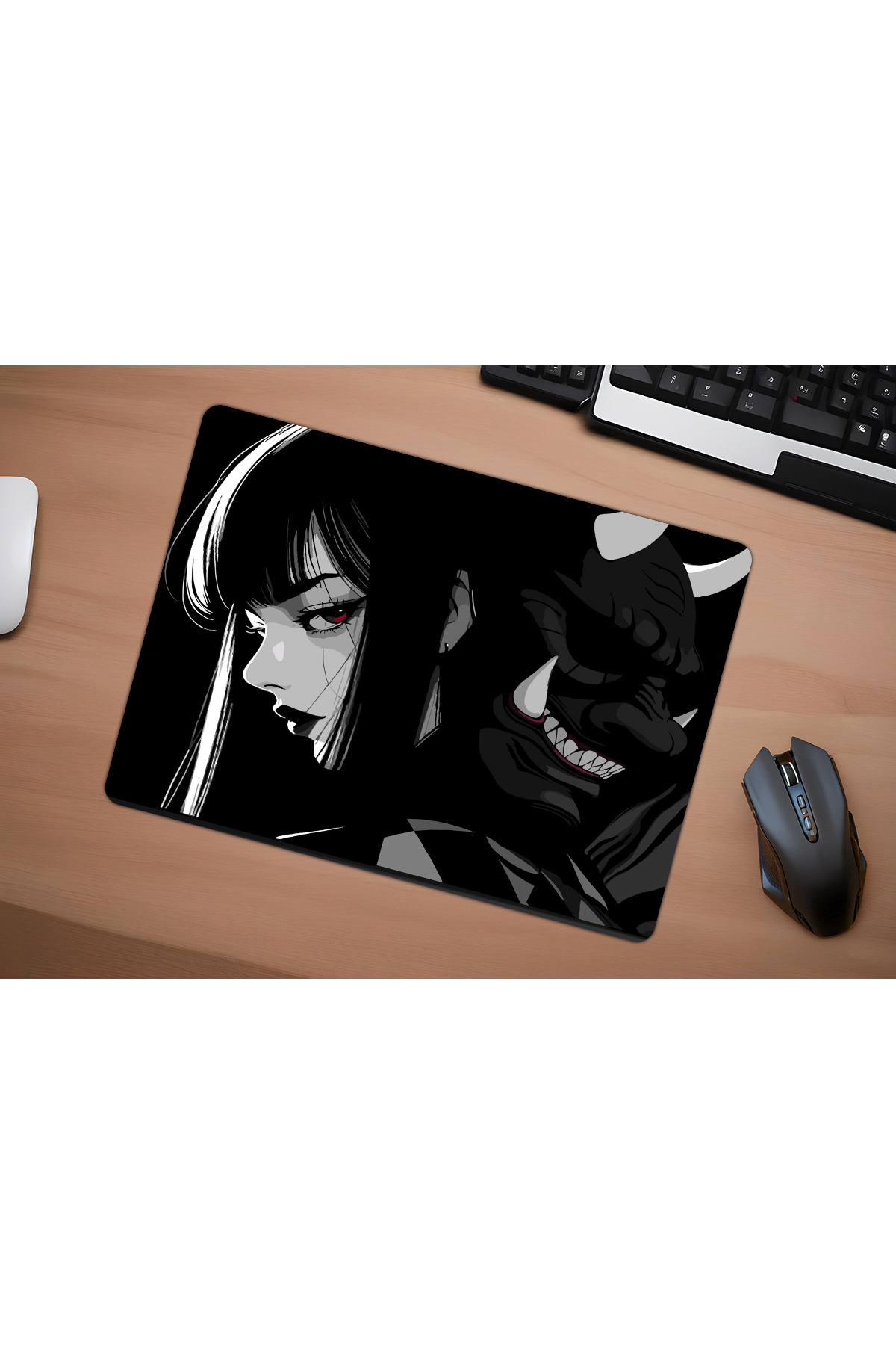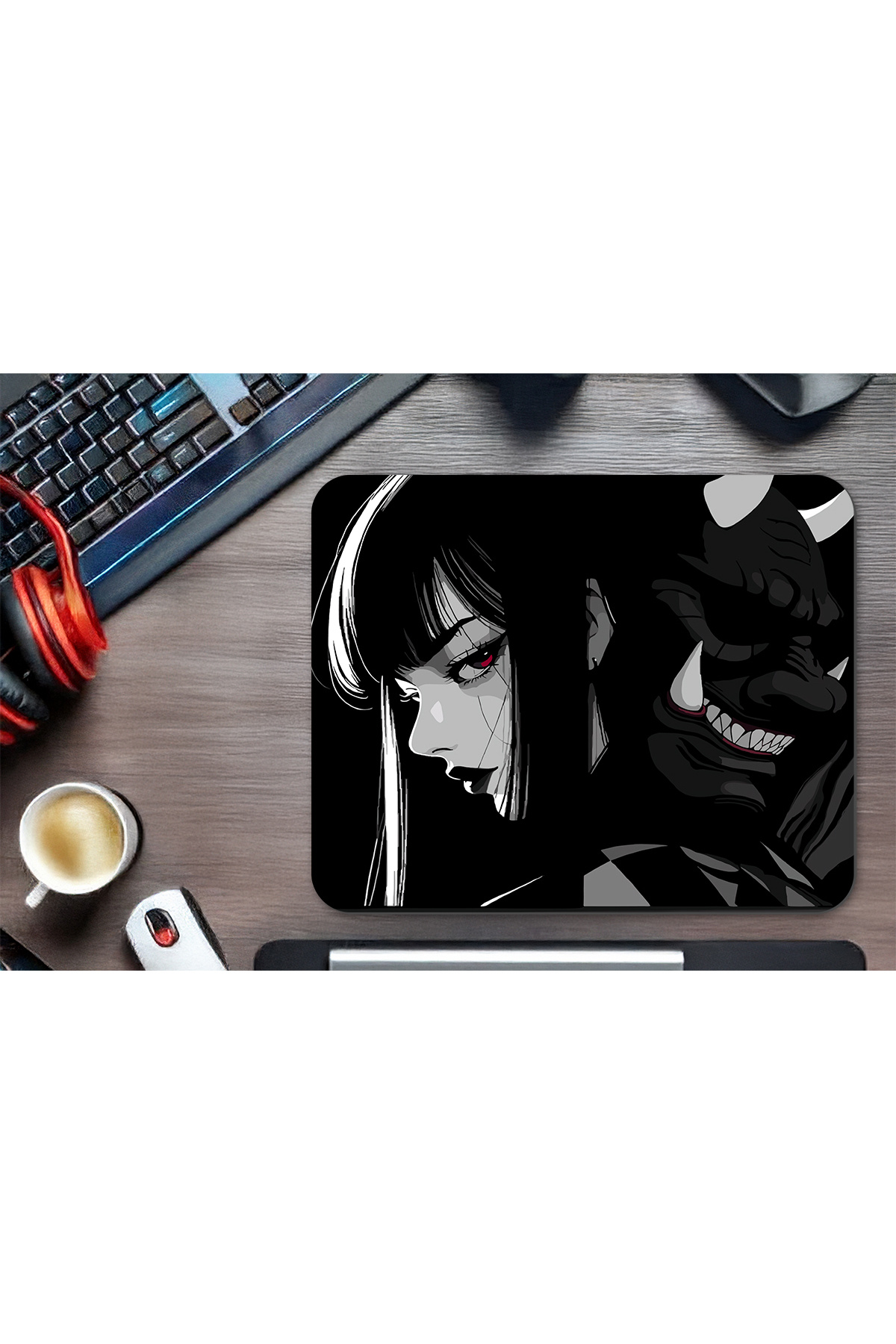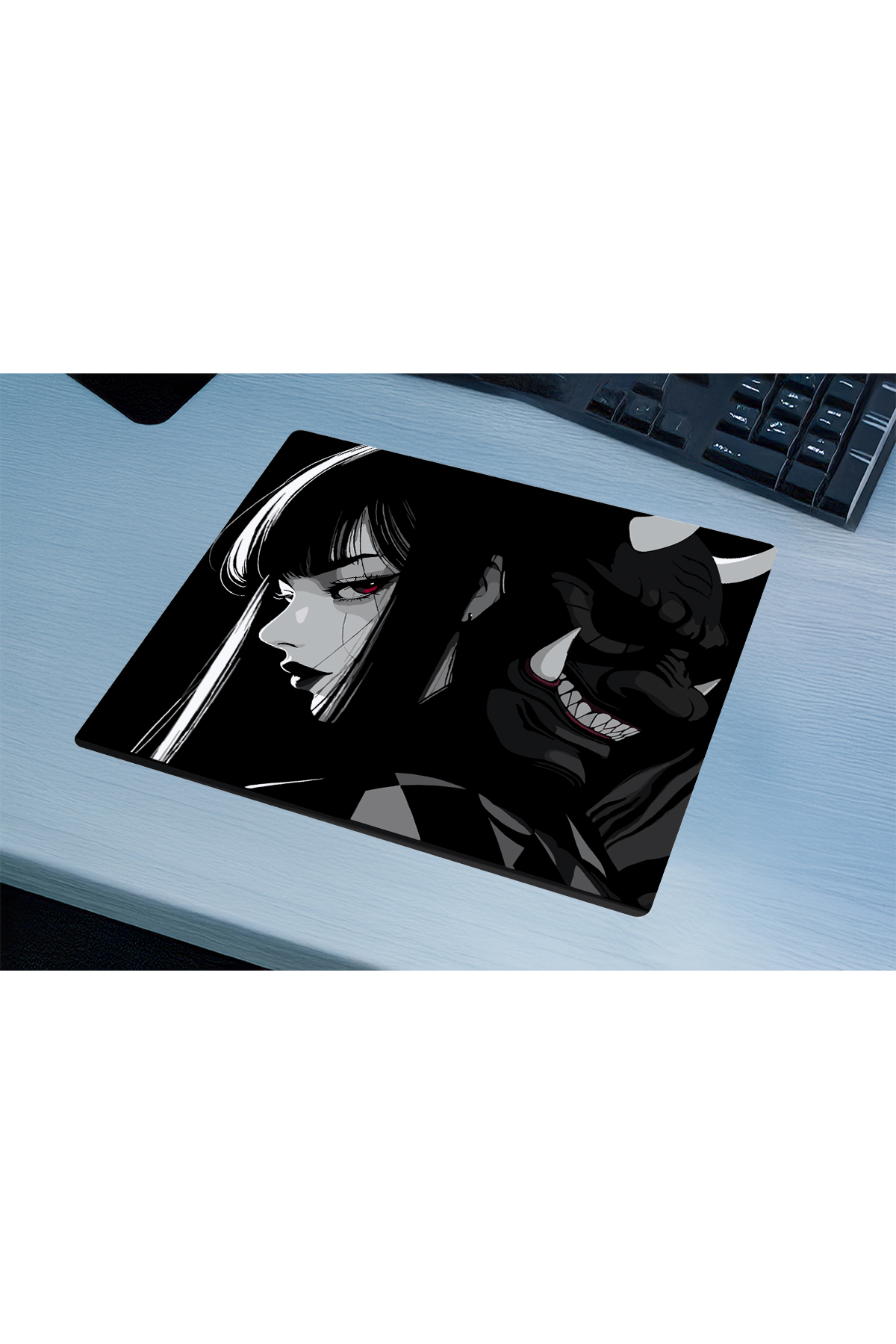 In the design, the female figure and the Oni mask, combined with a dark atmosphere, are highlighted with a strong contrast.