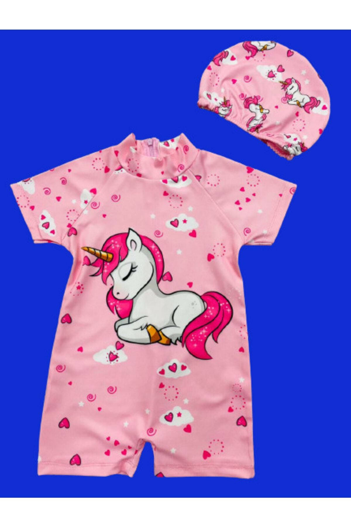 You can easily use it on the beach or by the pool with this powder pink swimsuit, shorts and bonnet set designed for the sensitive skin of children.