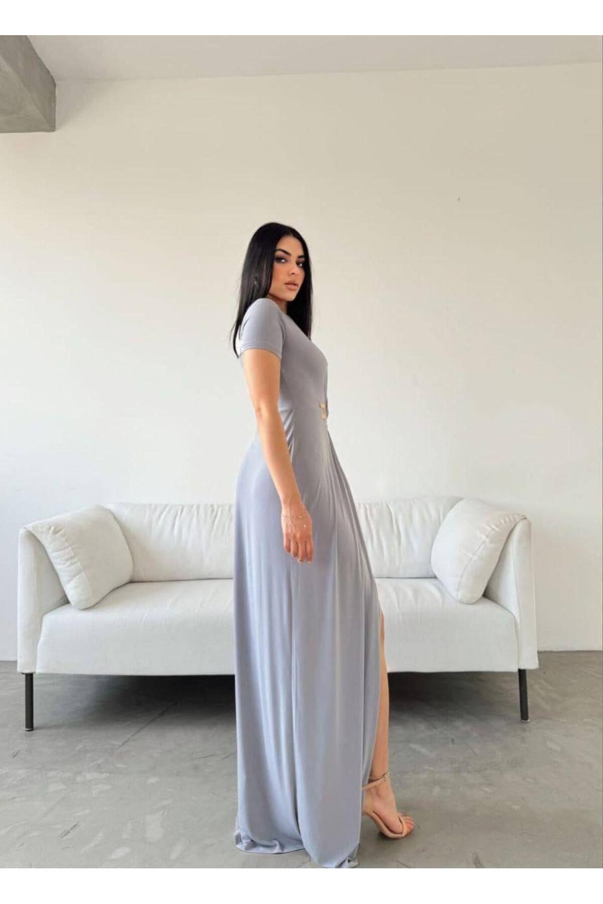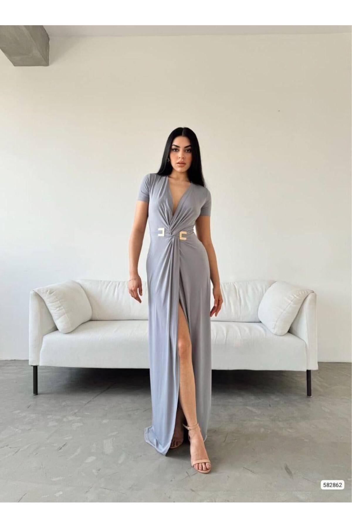 Modafeminen Stretchy Sandy Fabric Deep V-Neck Slit Short Sleeve Maxi Evening Dress GREY 582862 | ByTR
