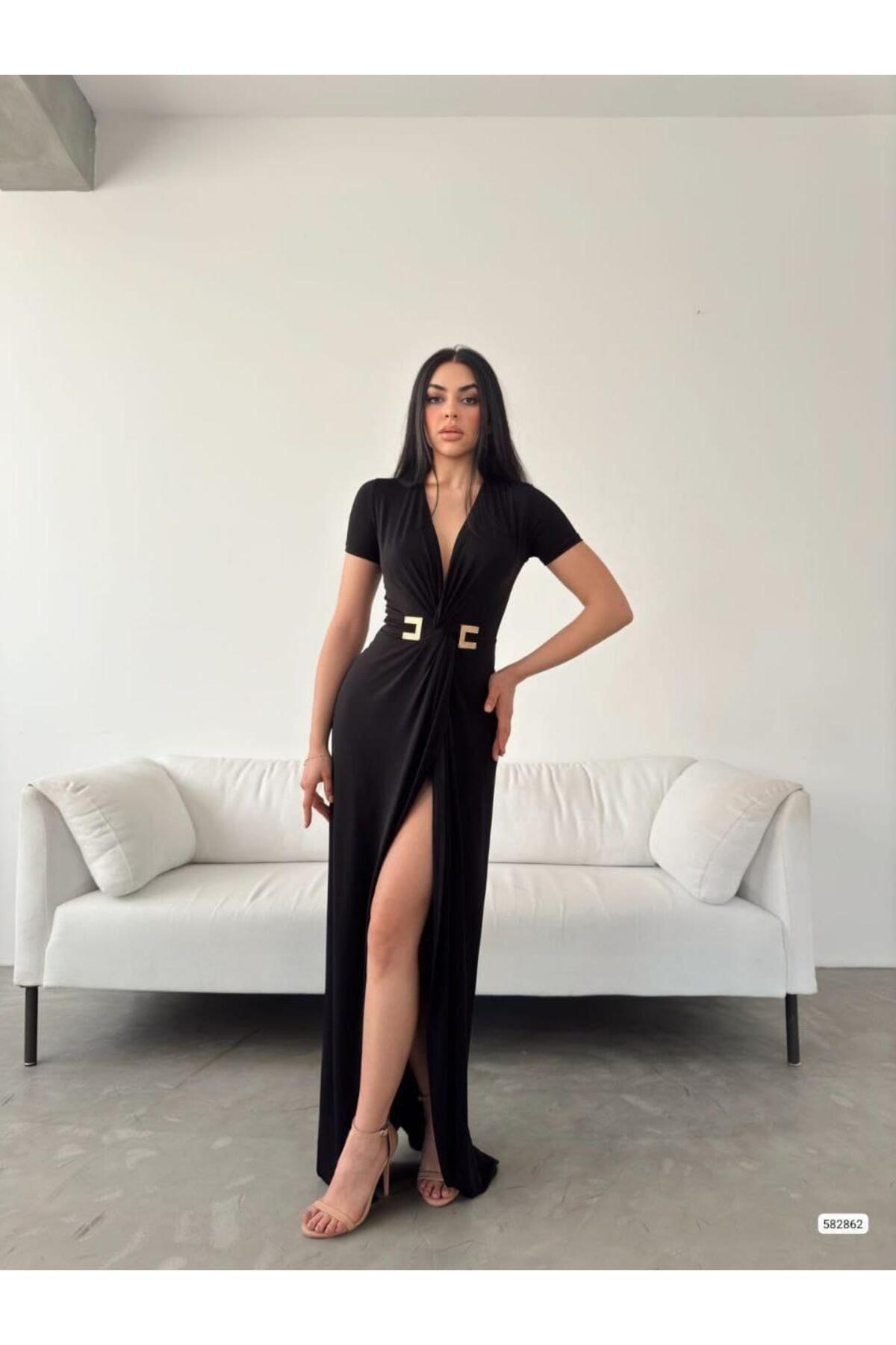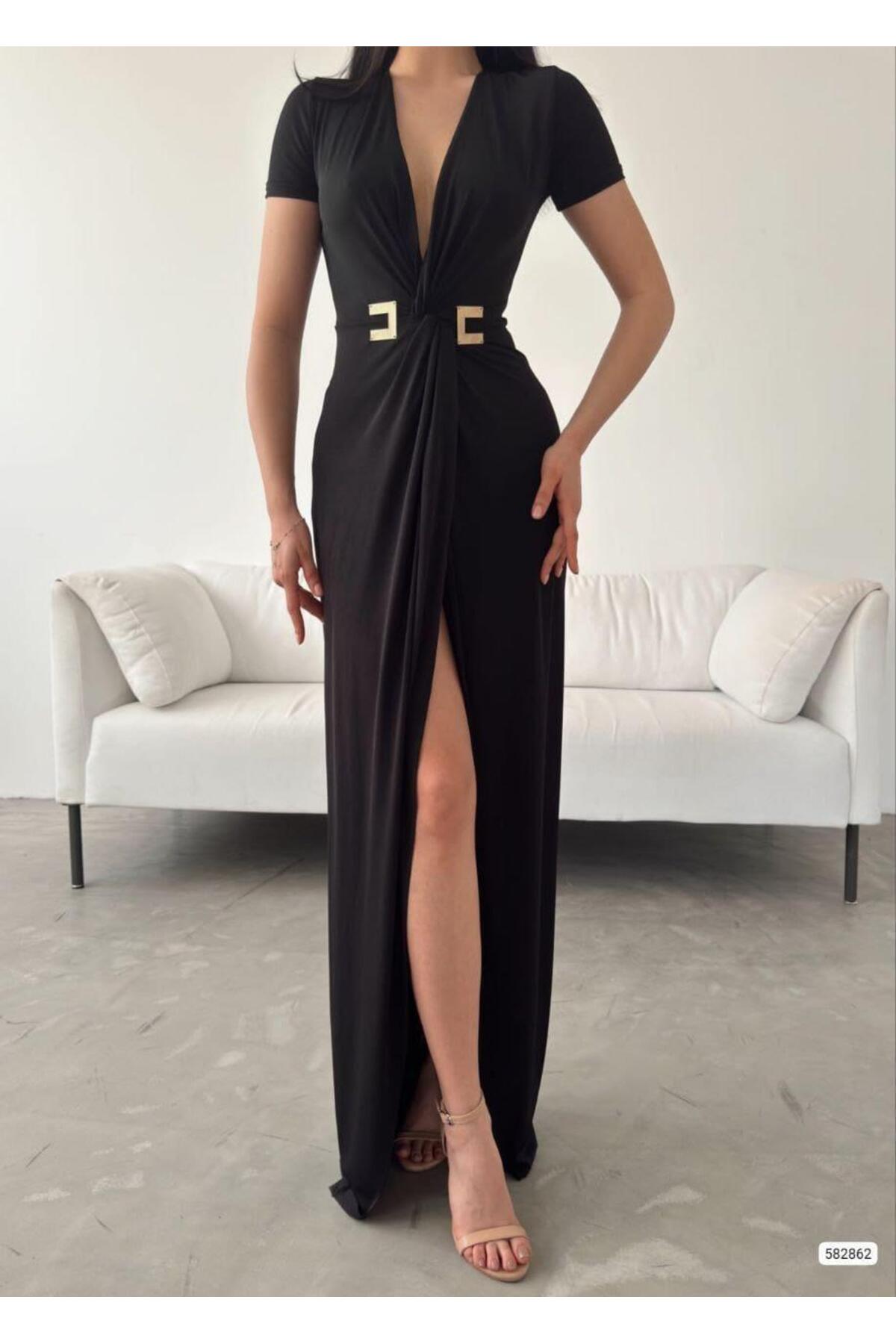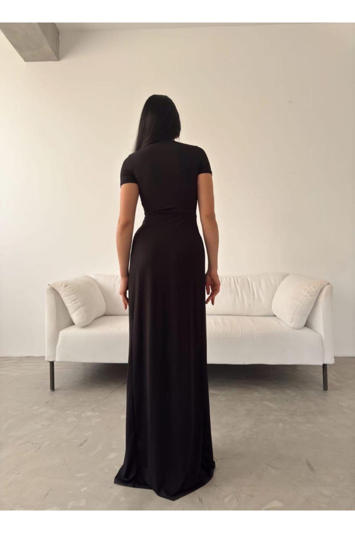 Modafeminen Stretchy Sandy Fabric Deep V-Neck Slit Short Sleeve Maxi Evening Dress BLACK 582862 | ByTR