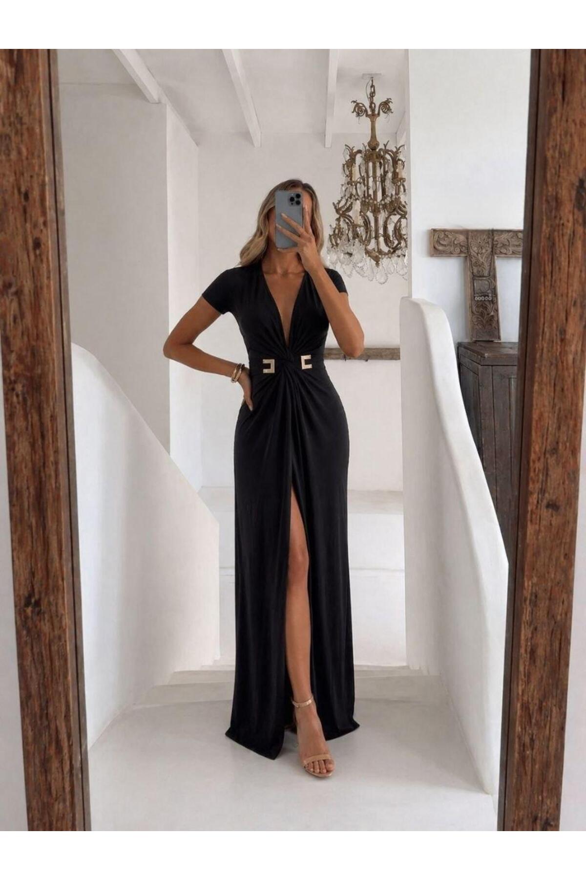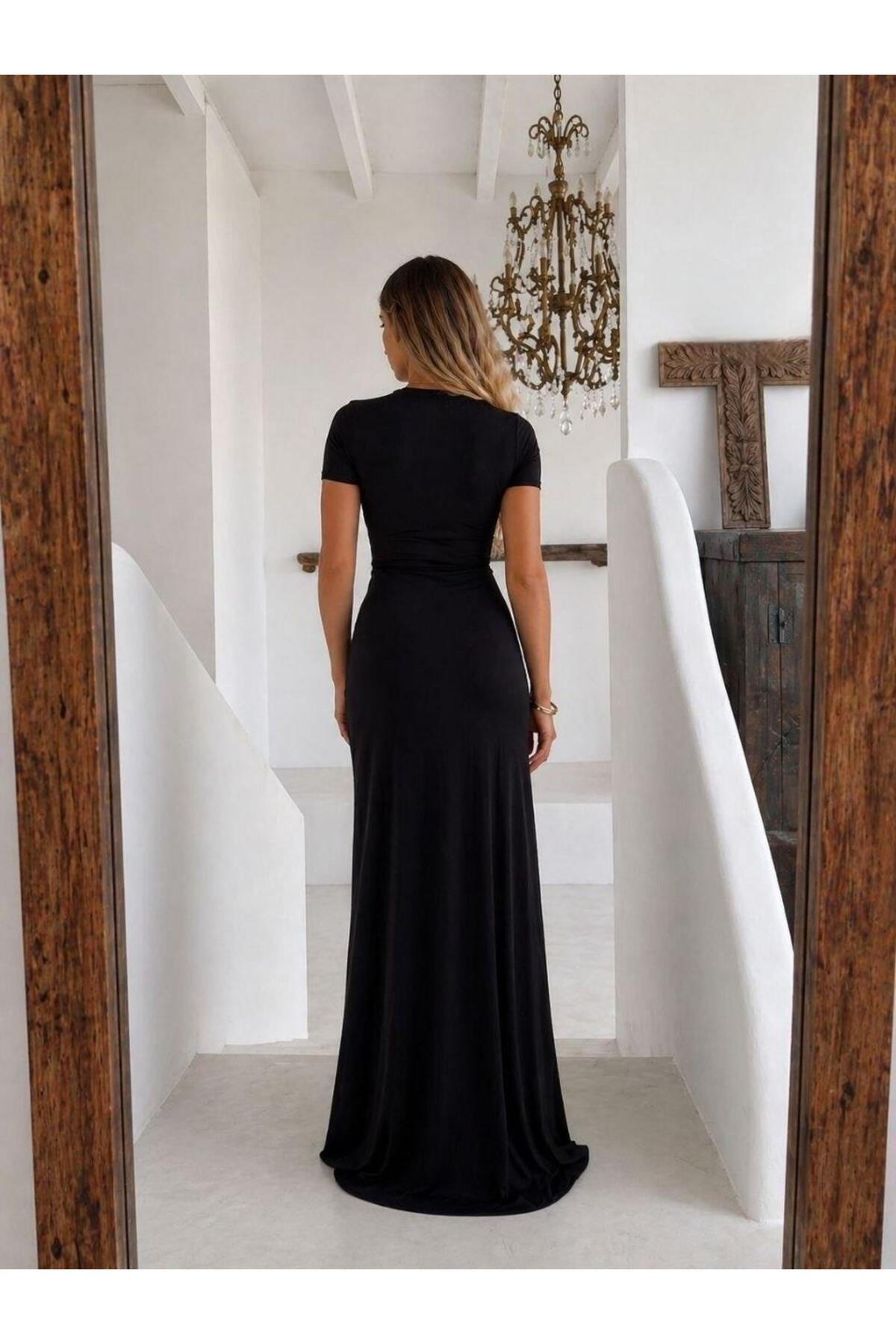 Modafeminen Stretchy Sandy Fabric Deep V-Neck Slit Short Sleeve Maxi Evening Dress BLACK 582862 | ByTR