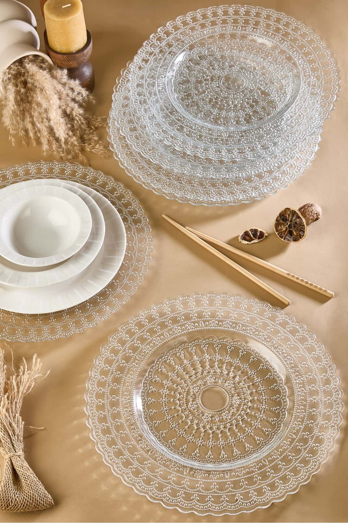 Lora Bianca Pizzo 6-Piece Transparent Glass Underplate Plate Set – Sparkle of Pure Elegance to your tables The Lora Bianca Pizzo 6-Piece Transparent Glass Underplate Plate Set, where simple elegance meets the most elegant form, brings elegance, shine and aesthetic balance to your tables.