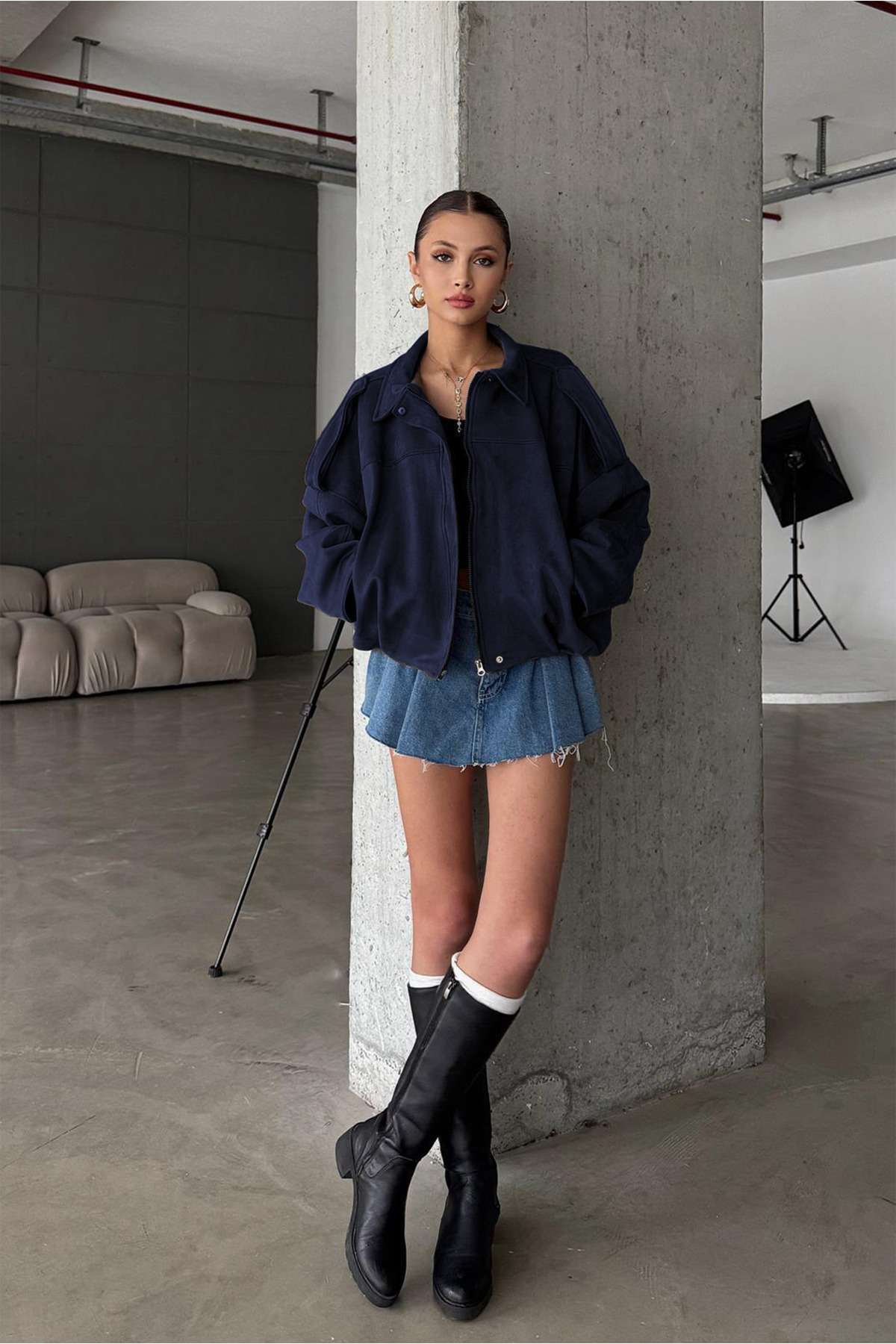 Creates a timeless look with its bomber silhouette.