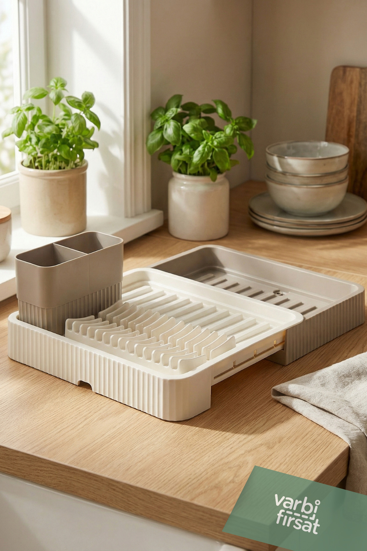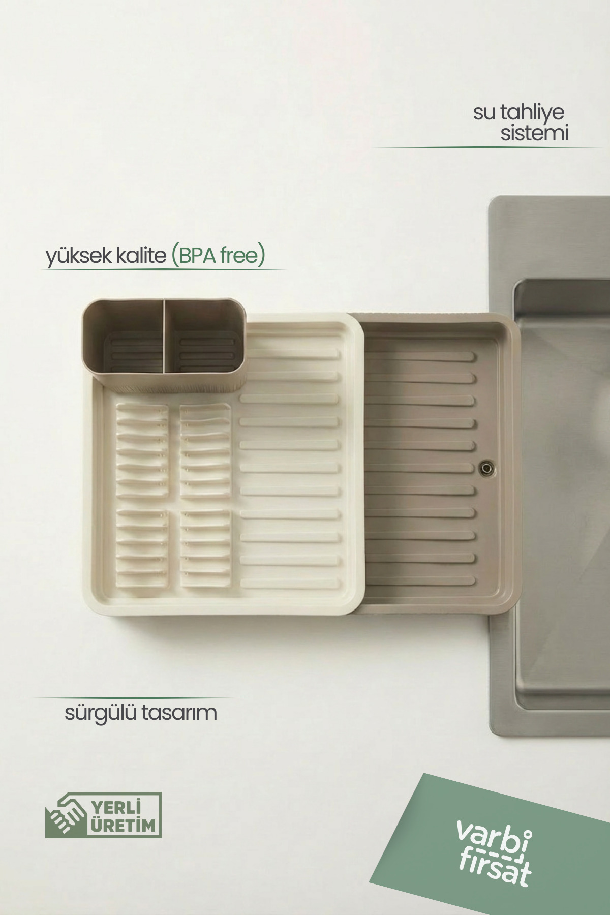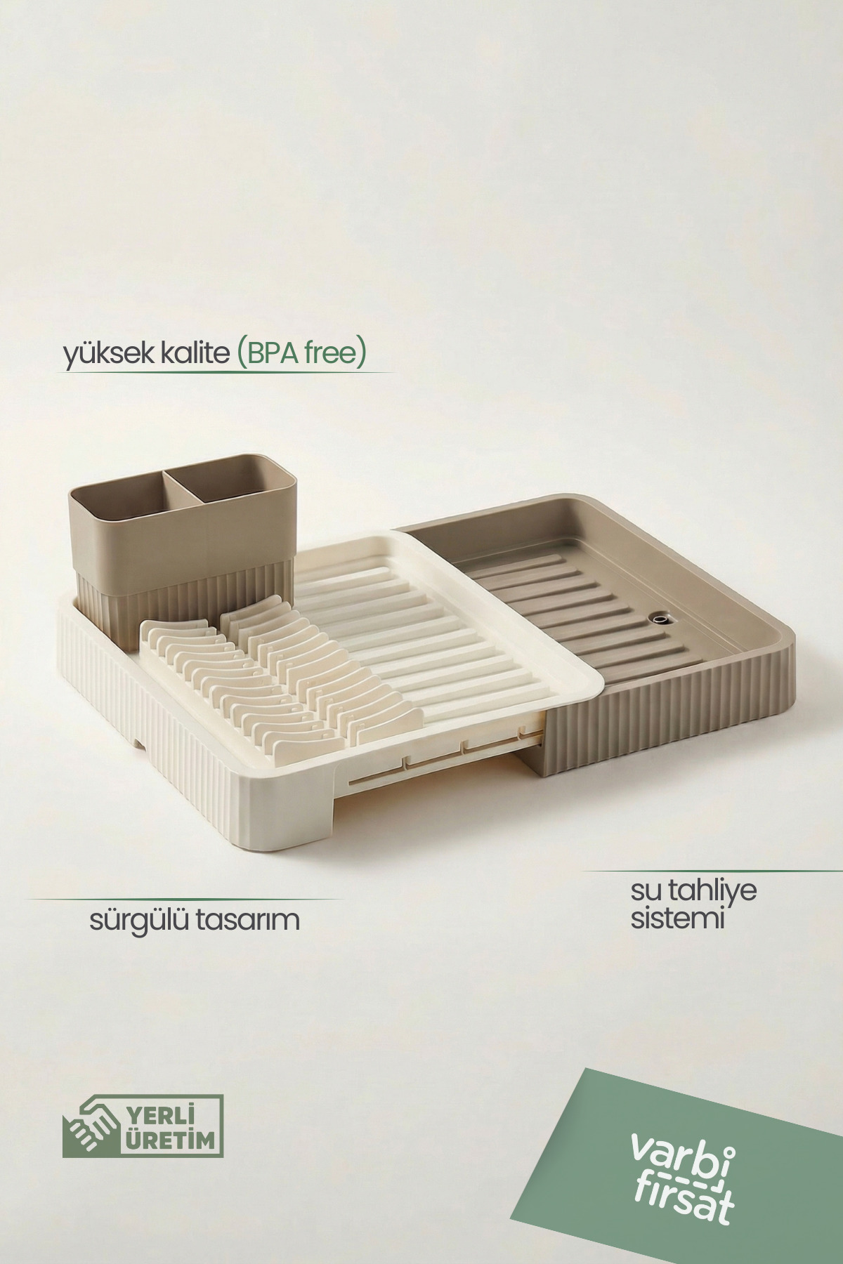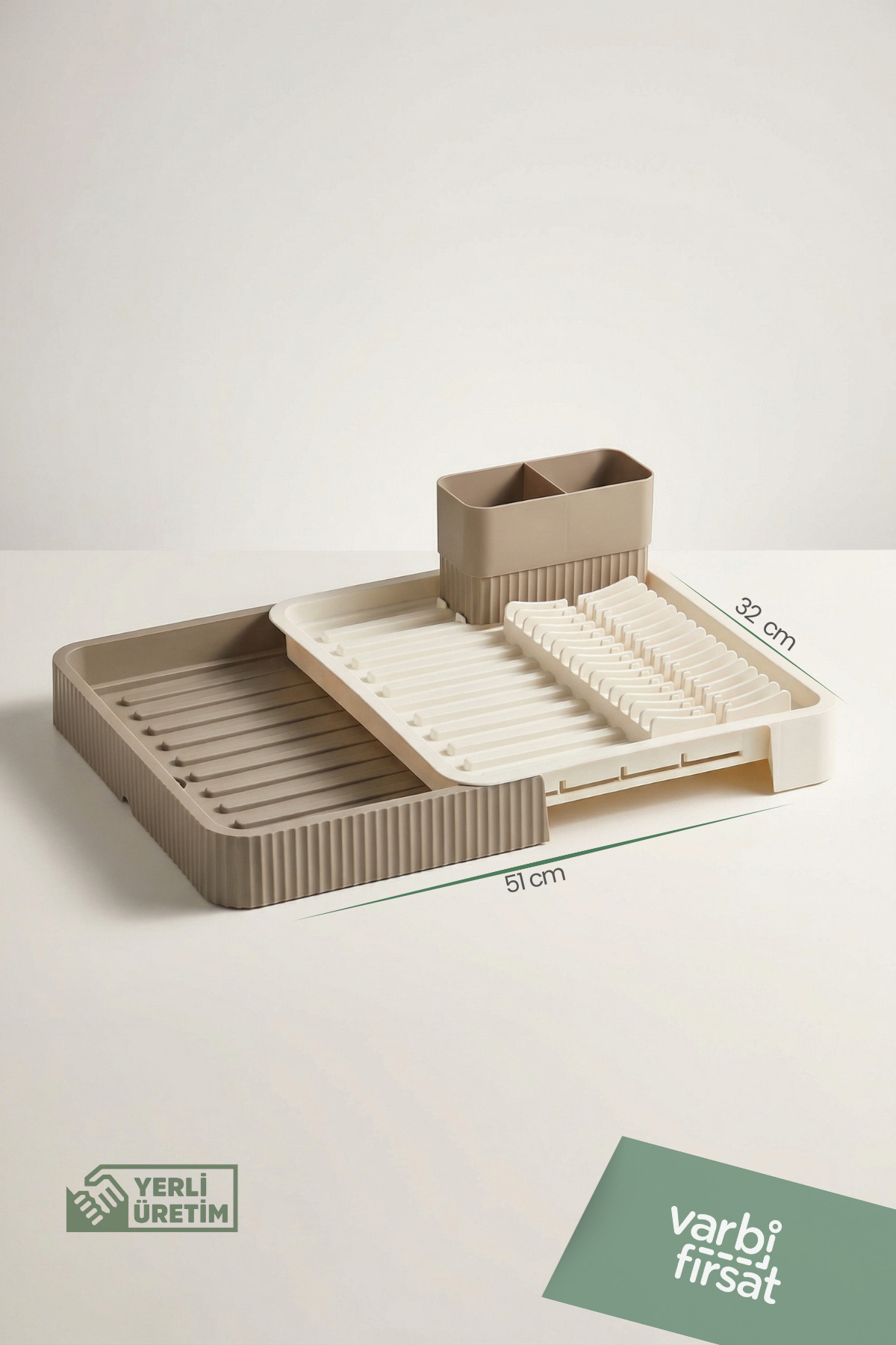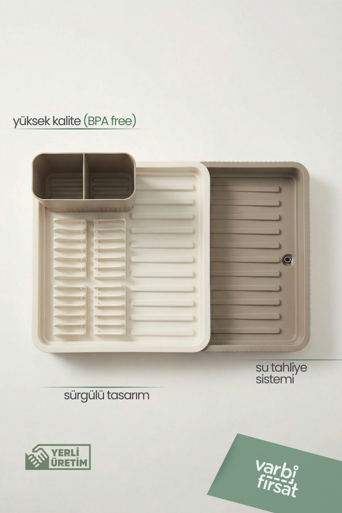 Adjustable use thanks to its retractable sliding plate design • Ideal for countertop use, saves space in the kitchen • Helps to dry plates upright and evenly • Offers large drying area for cups, bowls and pot lids • Dries forks, spoons and knives hygienically with separate spoon section • Durable plastic material, does not rust and tarnish • Latte color adapts to modern and simple kitchen decor • Suitable for daily use and crowded dishes Varbifırsat retractable sliding plate dish basket stands out with its functional design that prioritizes order and space saving in the kitchen.