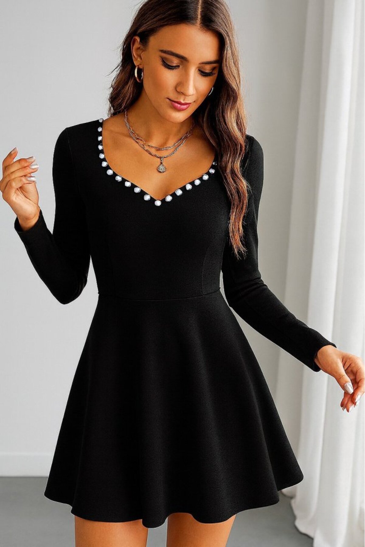 Welcome to Women's Long Sleeve Pearl Collar Short Imported Crepe Dress Fashion Shaping Women's Clothing Brand Viyamo!Viamo is a brand that allows women to express their style and take a strong stance.
