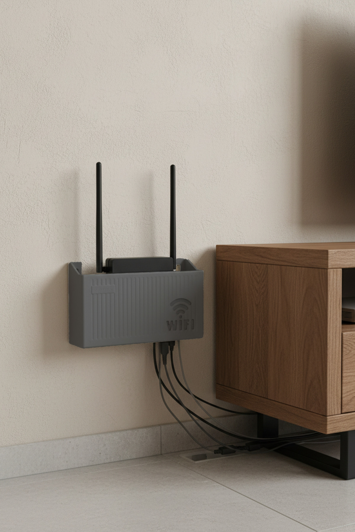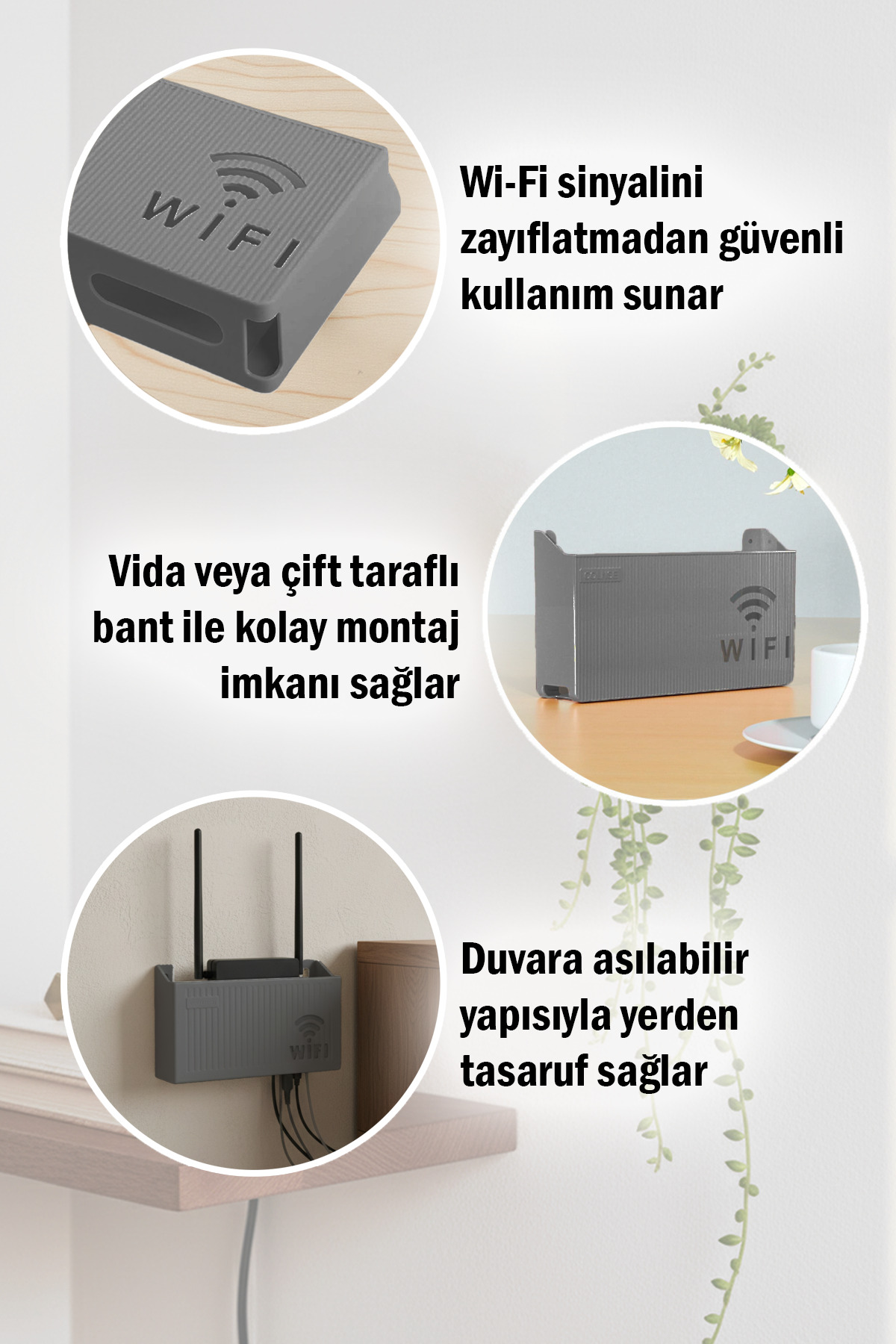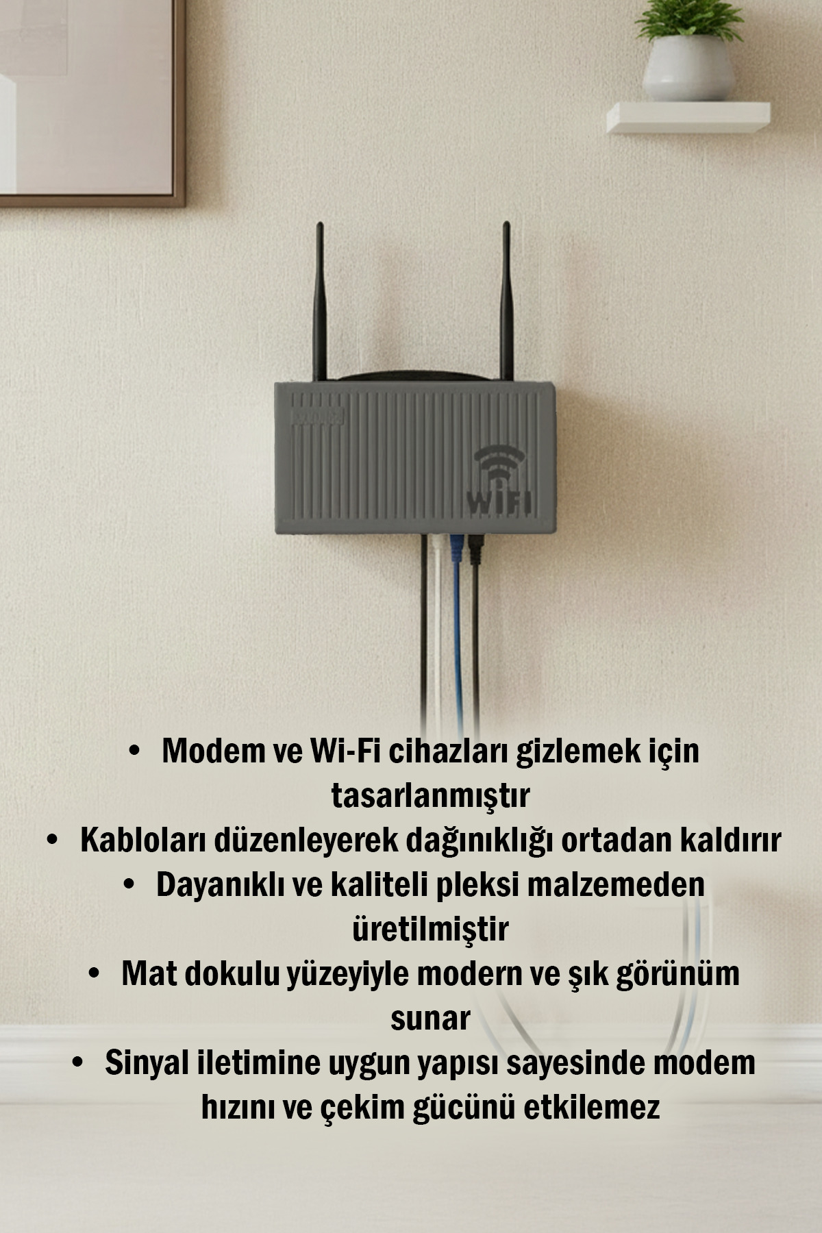 This apparatus, made of durable plexi material, both protects your modem and gives it a modern look with its elegant lines. You provide a perfect layout by passing your cables through hidden openings at the back and bottom. Mount it next to your TV unit, on your desk, or on your workout