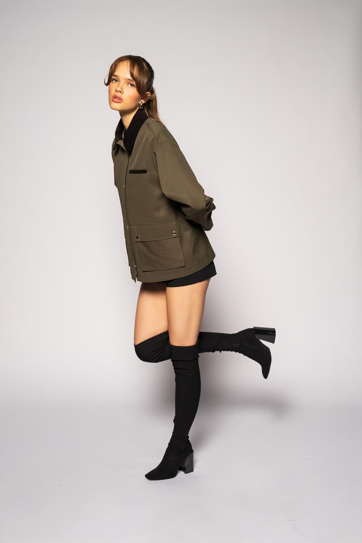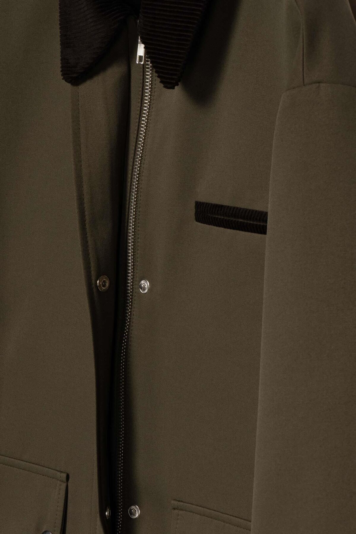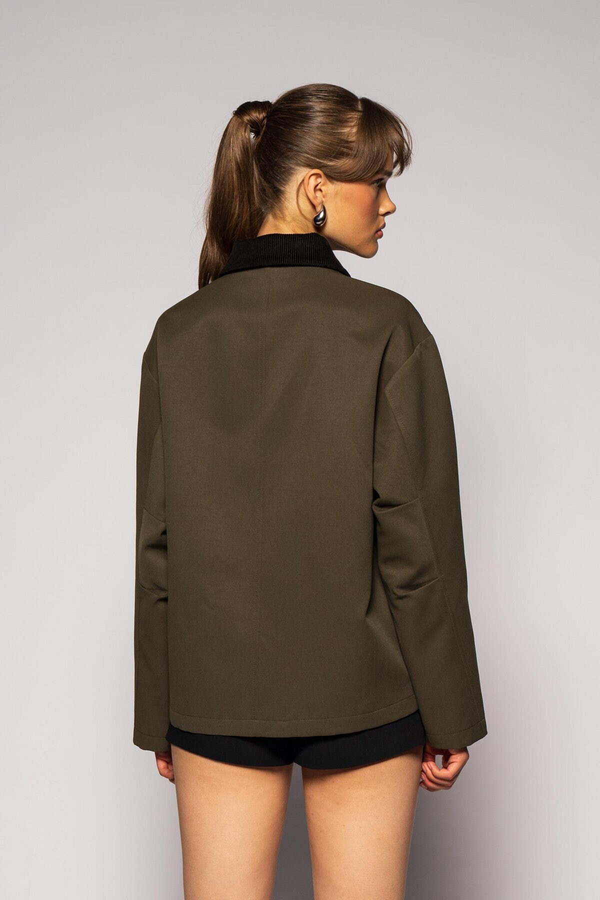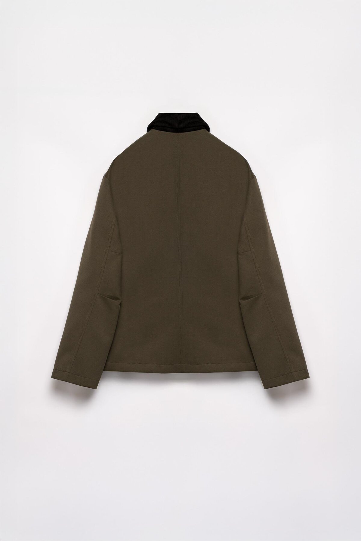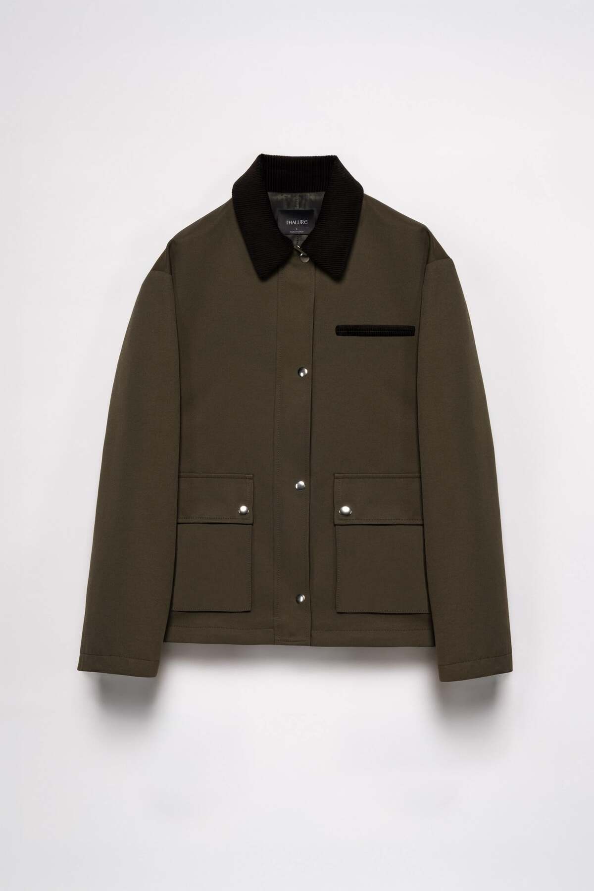Gabardine Jacket with Khaki Velvet Collar Fleece Pockets Stylish and functional outerwear in urban style with durable gabardine texture and velvet collar contrast.