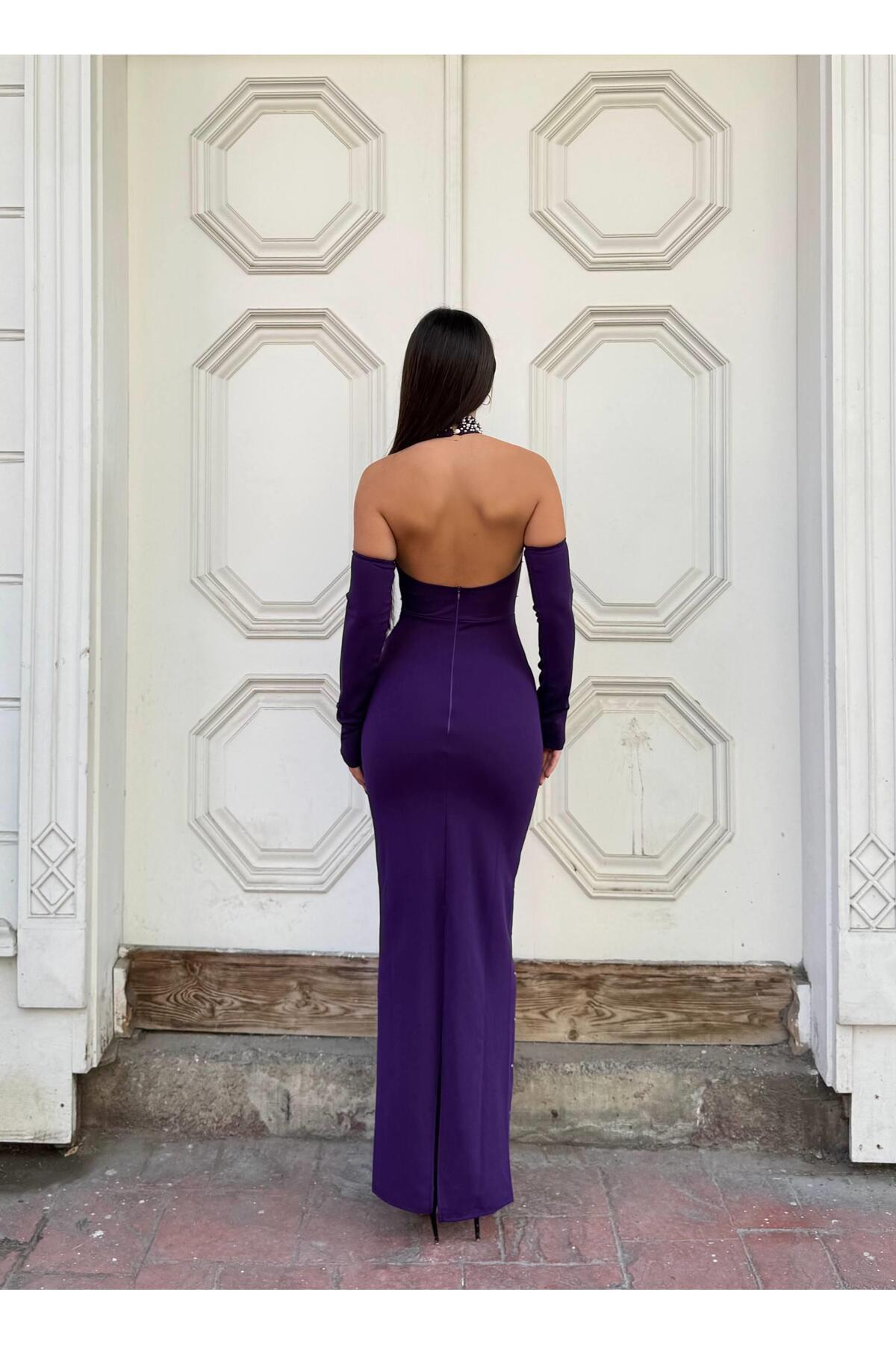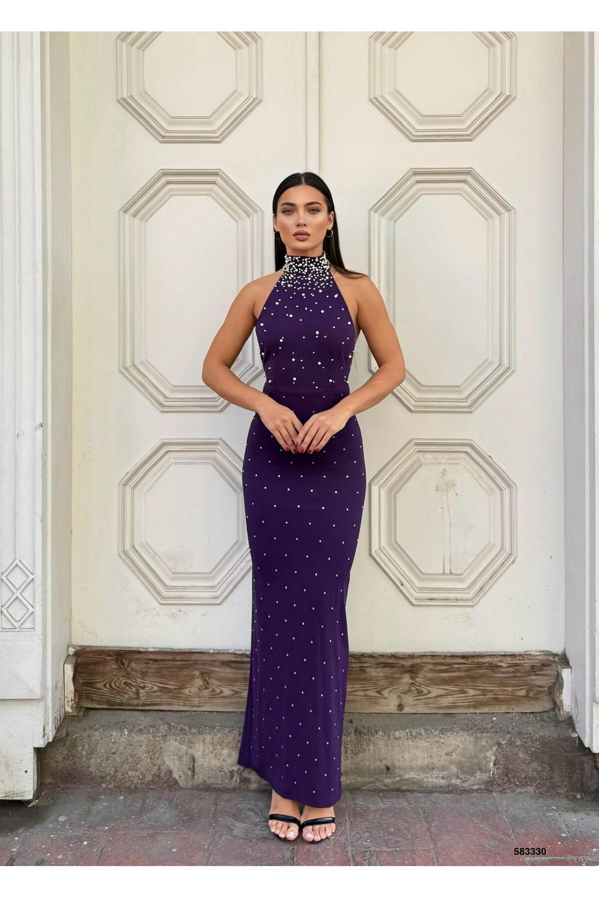 Modafeminen Crepe Stretch Fabric Long Sleeve Turtleneck Stone and Pearl Detailed Evening Dress 583330 PURPLE | ByTR