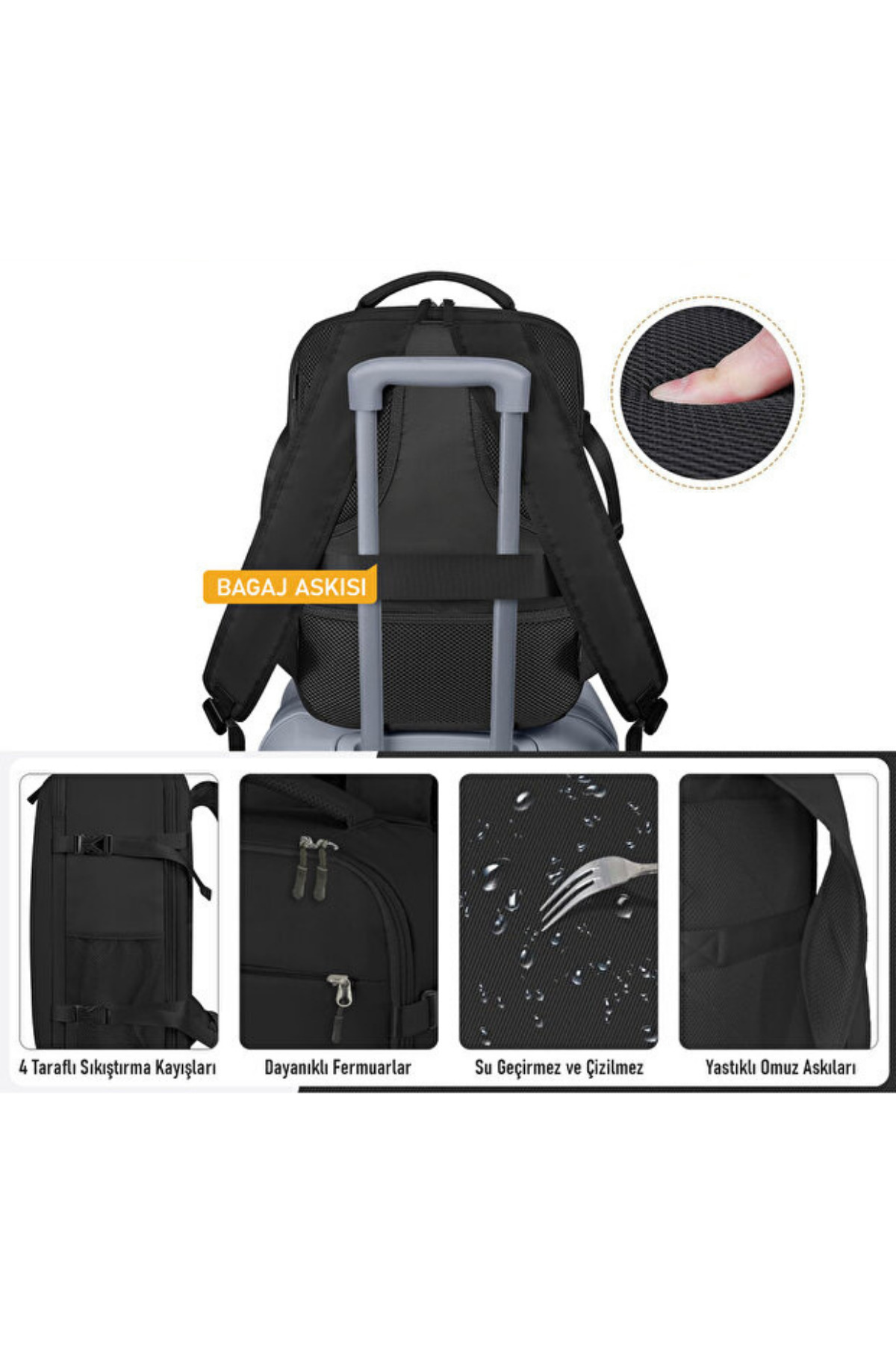 Black travel backpack that attracts attention with its light and stylish design that offers comfort during your travels.
