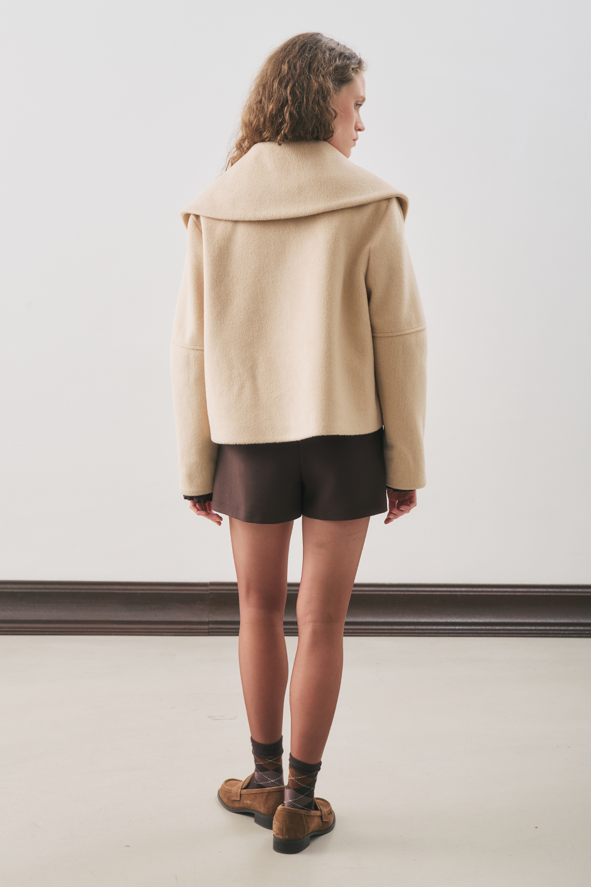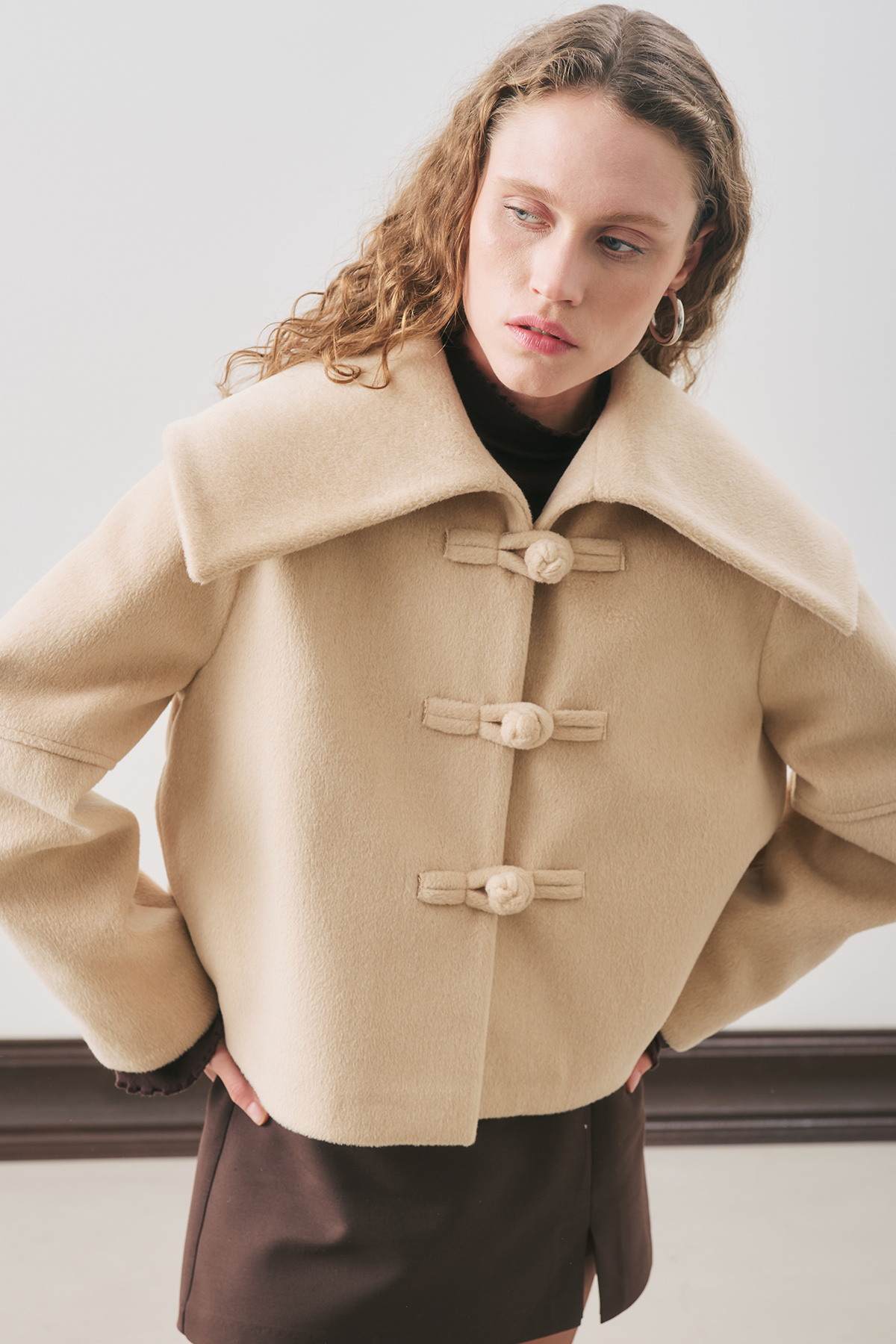 Normal mold, wide collar, long sleeve, collar and button detail, crop size, button closure.
