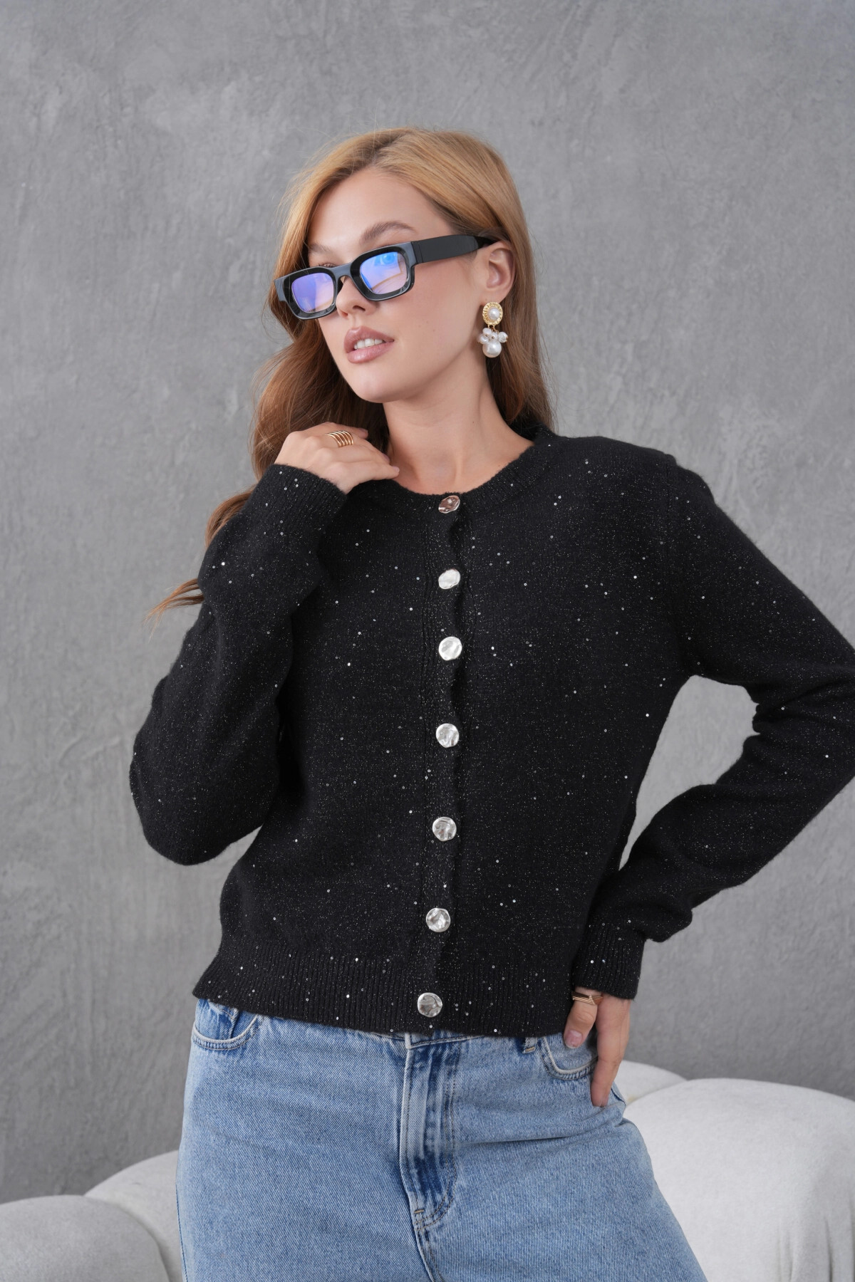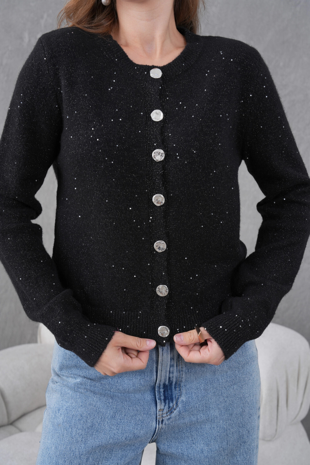 Park Karon Women's Black Crew Neck Button Detail Soft Textured Knitwear Cardigan | ByTR