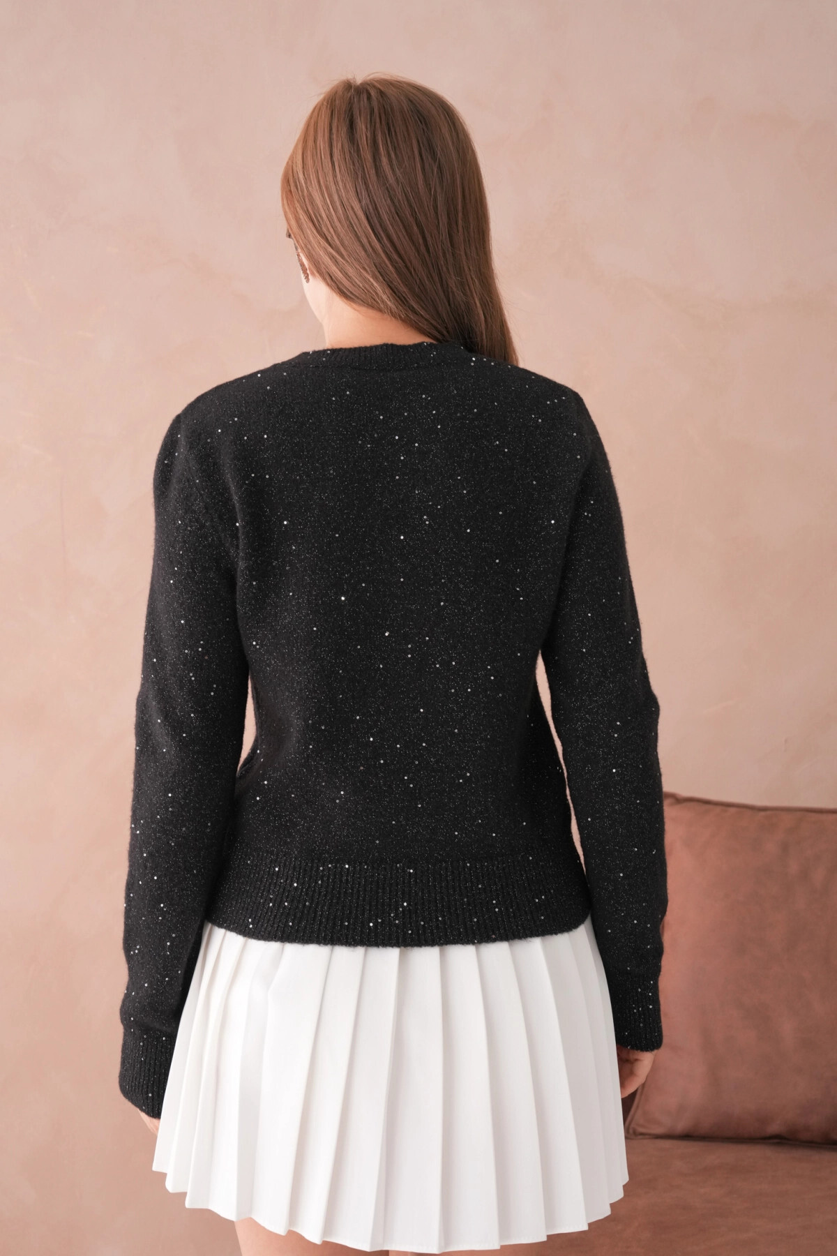 Park Karon Women's Black Crew Neck Glitter Soft Textured Knitwear Sweater | ByTR