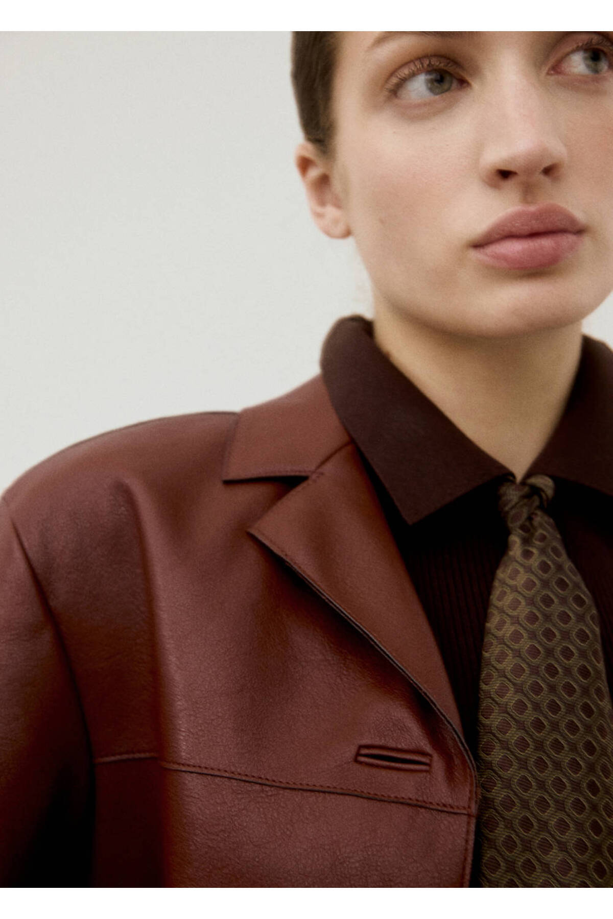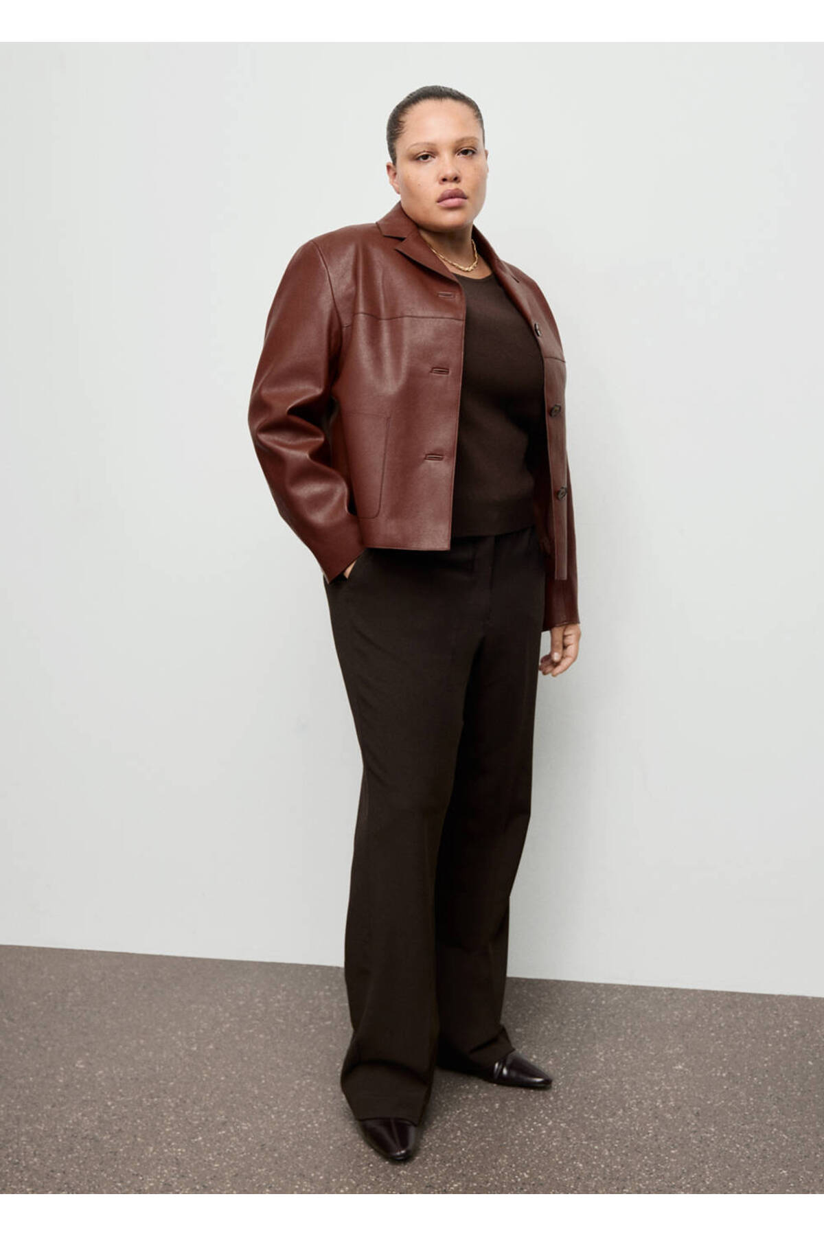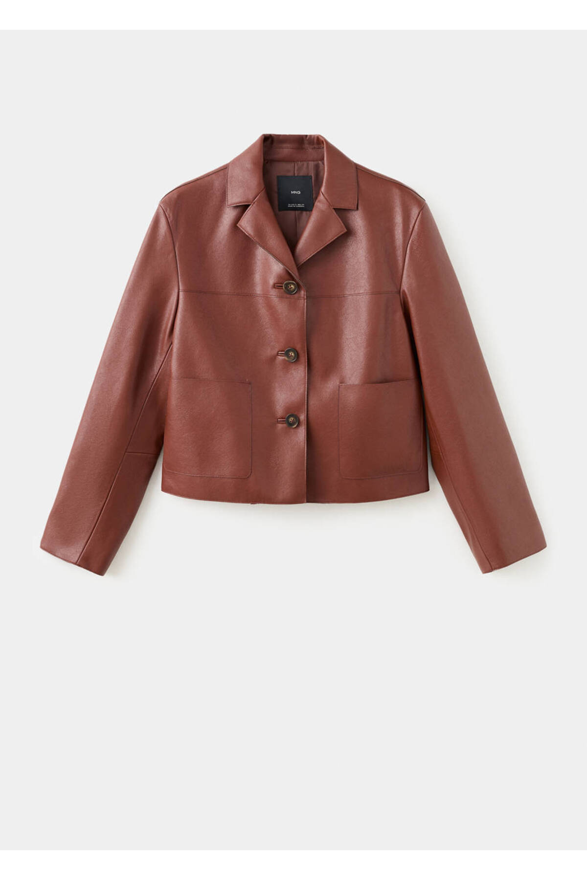 Leather effect, Flat design, V-cut collar, Notched solapas, Long sleeves, Two patch pockets on the front, Front button closure, Inner lining, Disponible Plus.