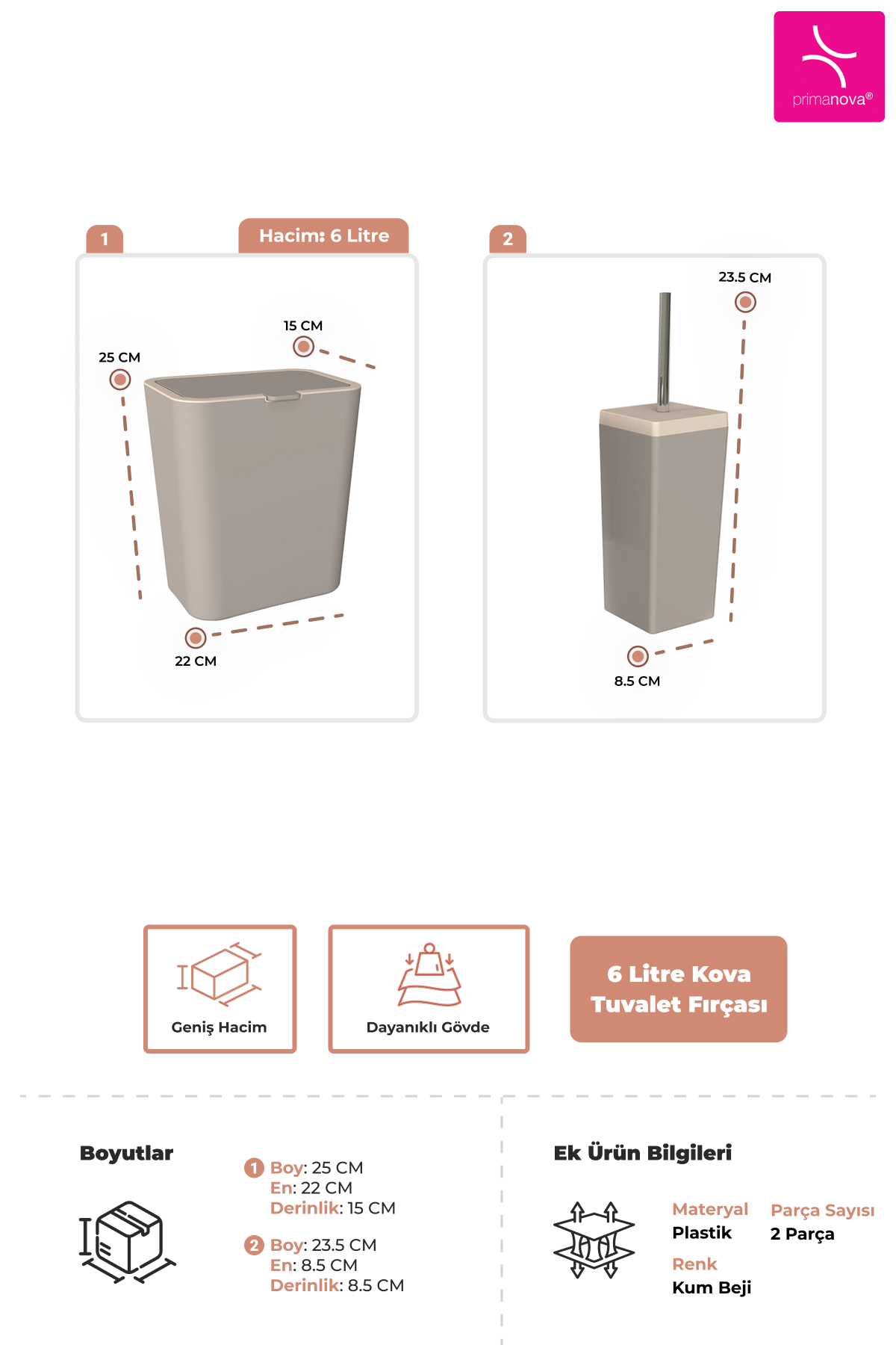 Product Information Material: Plastic Color: Sand Beige Number of Pieces: 1 Bucket + 1 Toilet Brush Bucket Volume: 6 Liter Bucket Dimensions: Height: 25 cm Width: 22 cm Depth: 15 cm Brush Dimensions: Height: 23.5 cm Width: 8.5 cm Depth: 8.5 cm