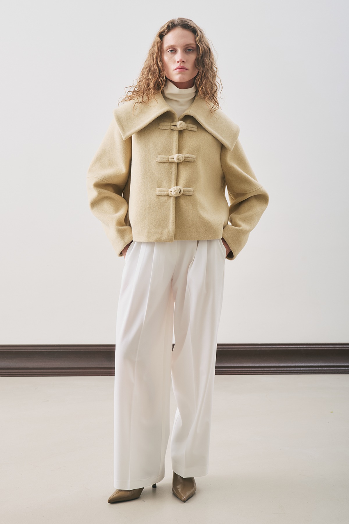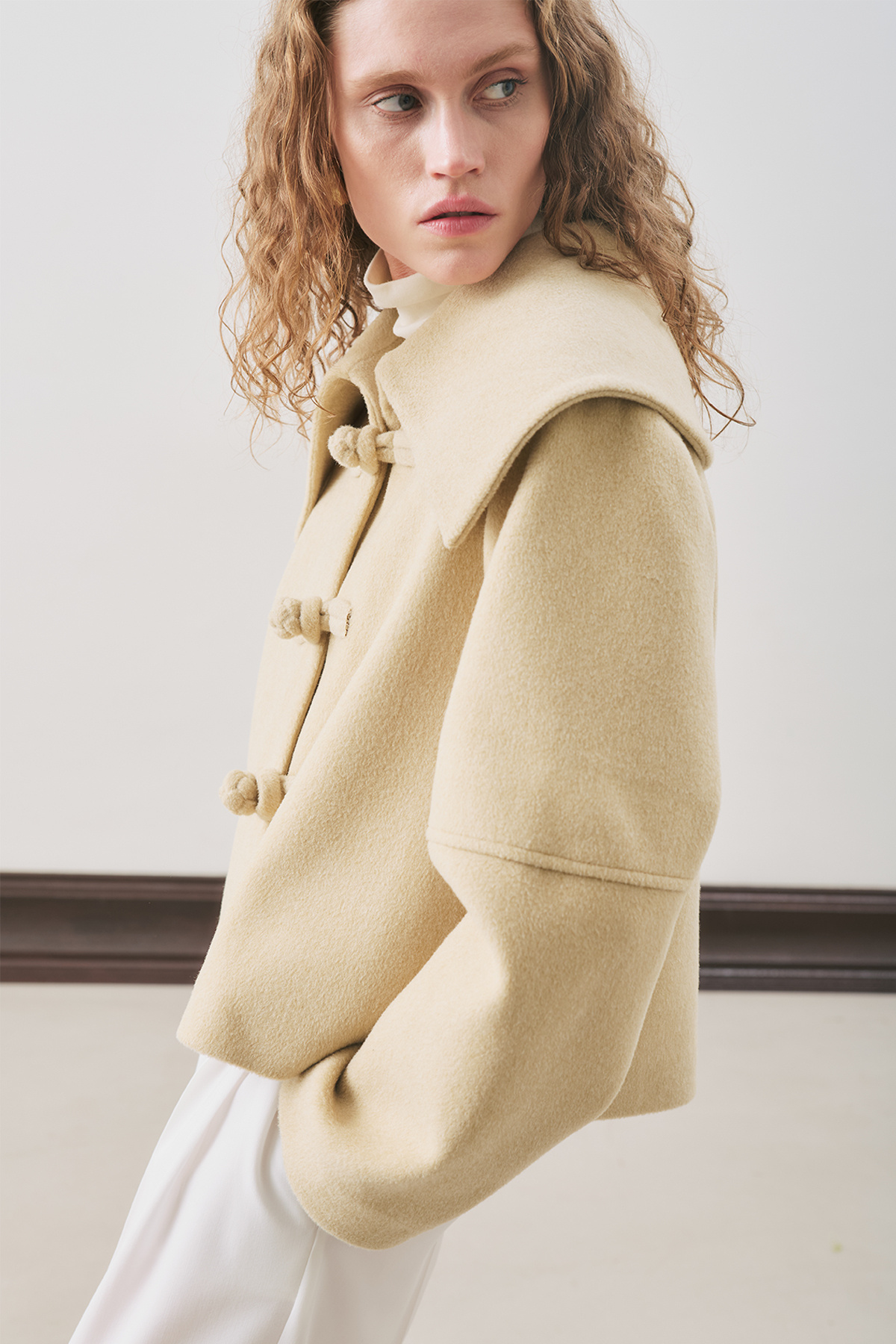 Normal mold, wide collar, long sleeve, collar and button detail, crop size, button closure.