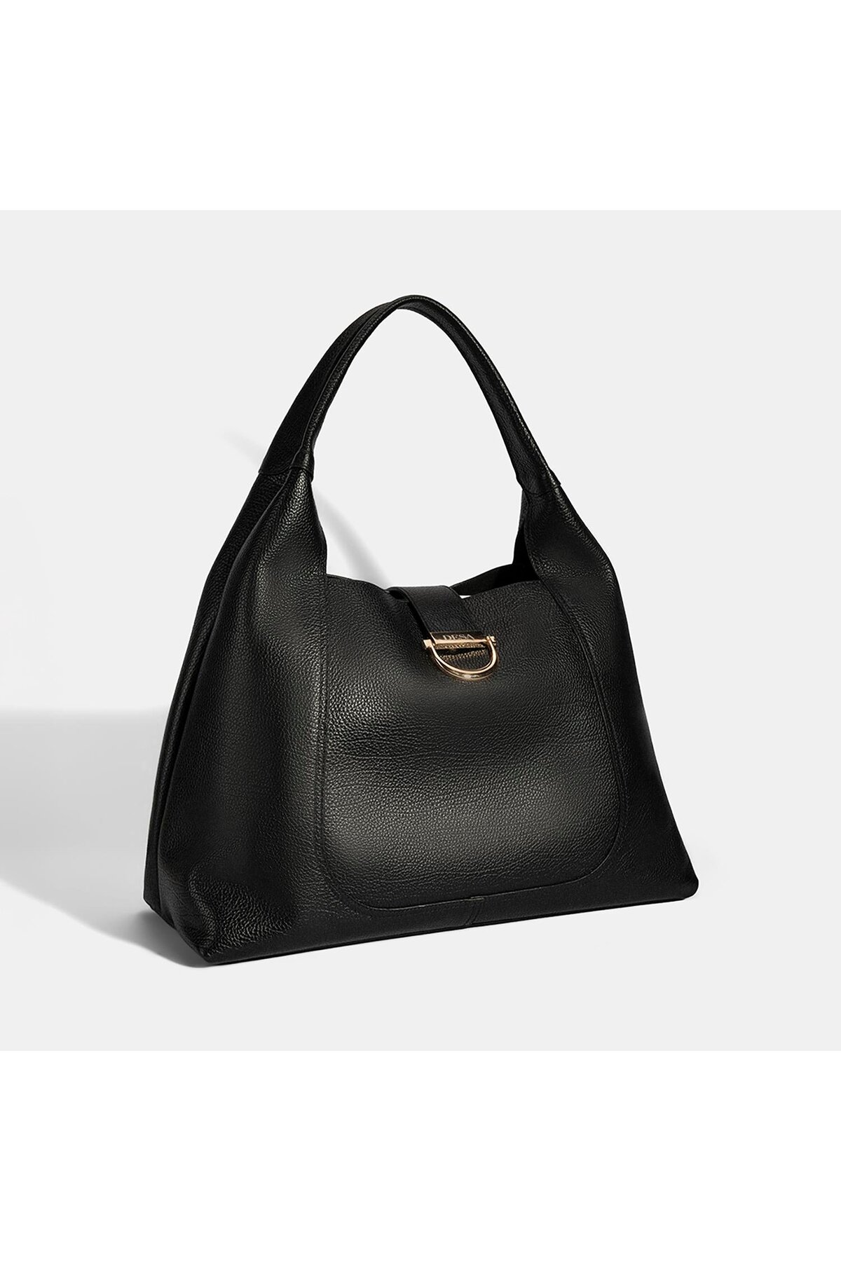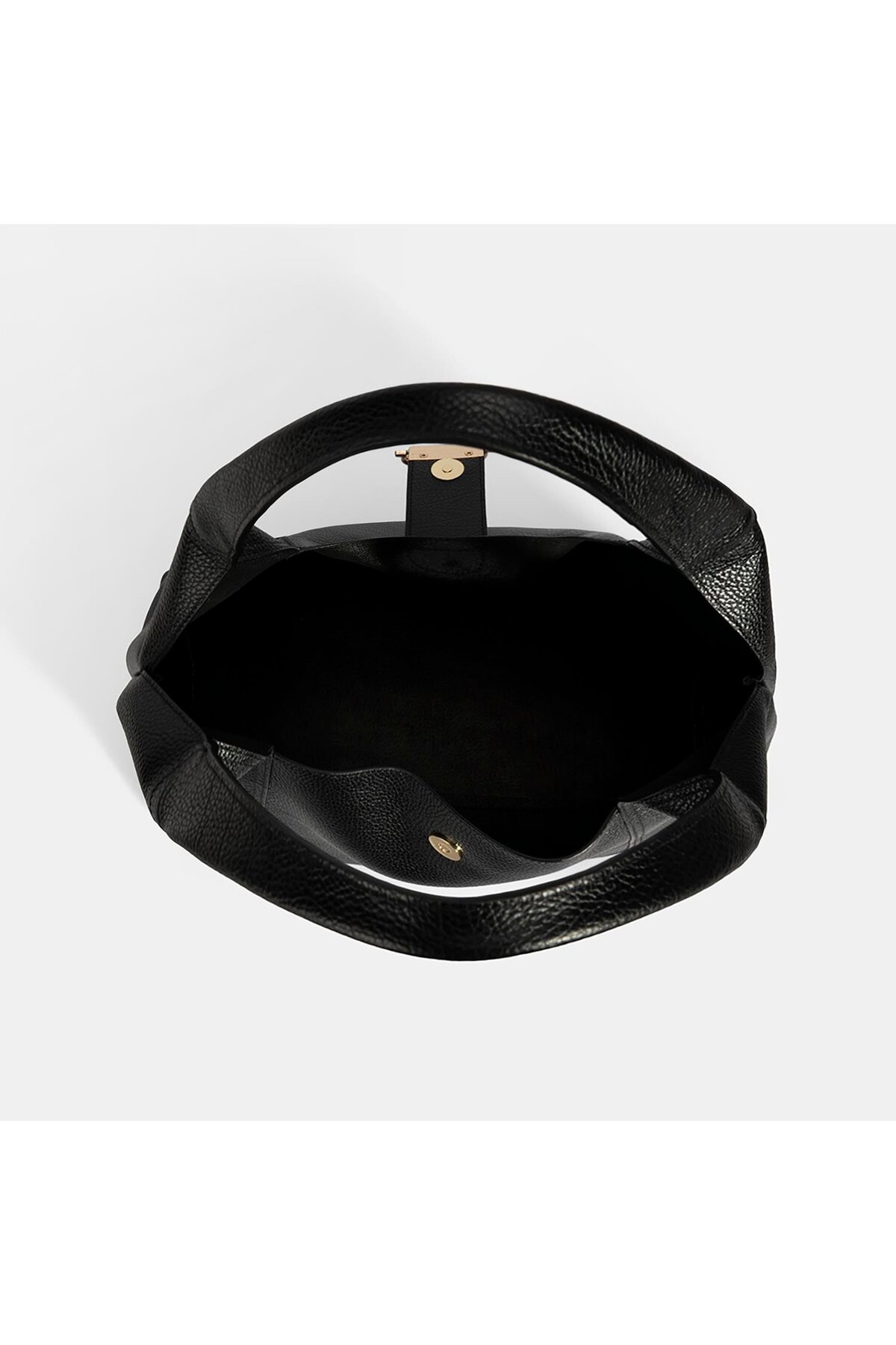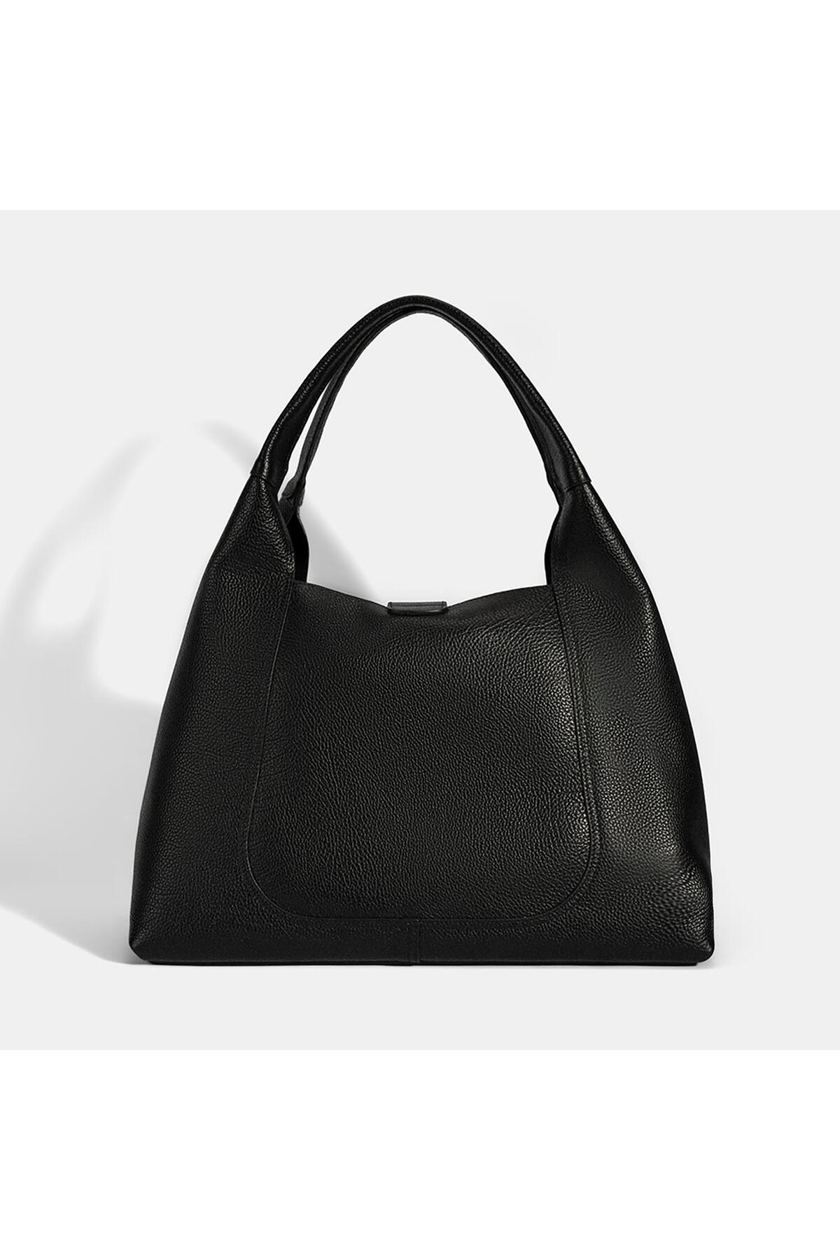 U-shaped parts on the front and rear body add form and volume to the bag, while the machine stitch to combine these parts adds a decorative effect with its curved lines.