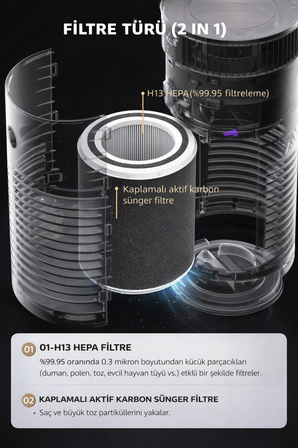 H13 grade HEPA filter provides effective filtration by capturing 99.95% of dust, pollen, allergens and fine particles up to 0.3 microns.