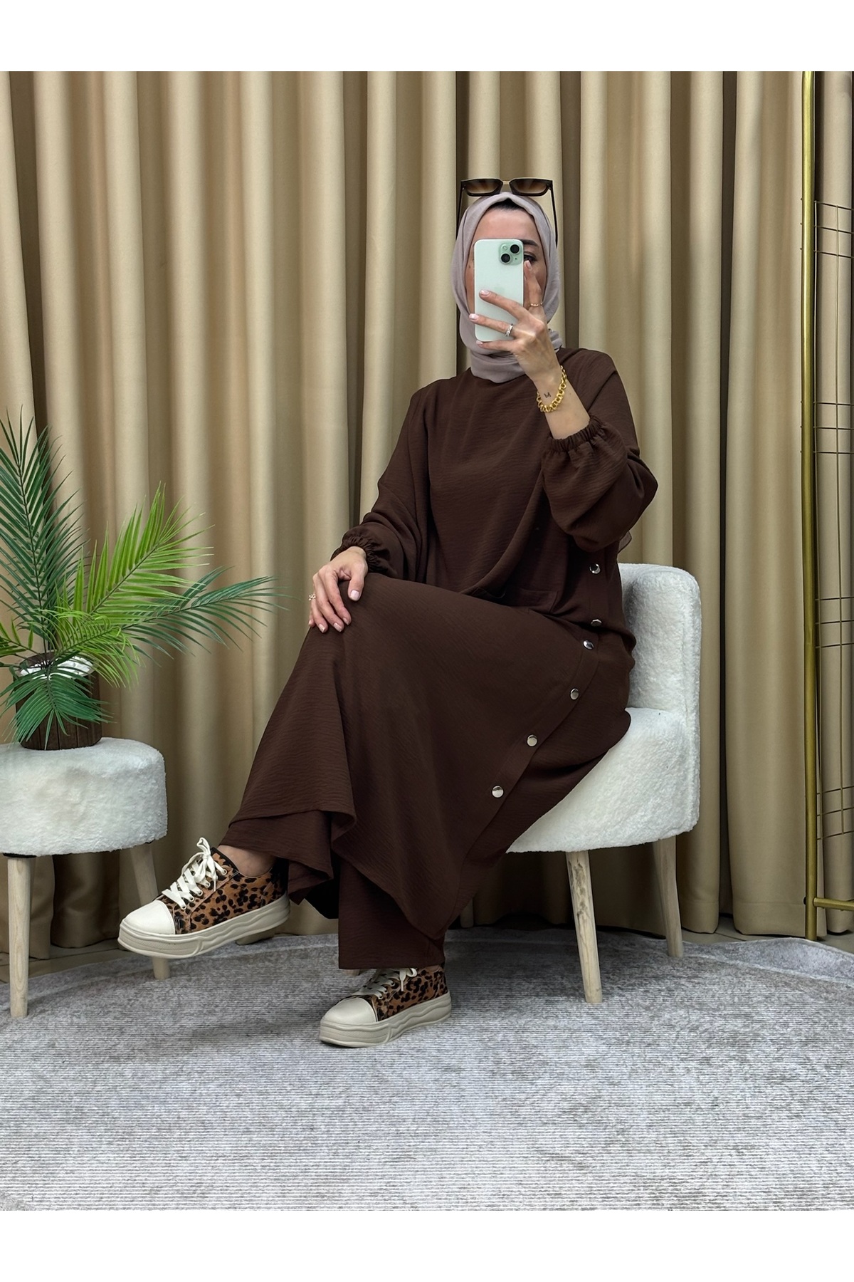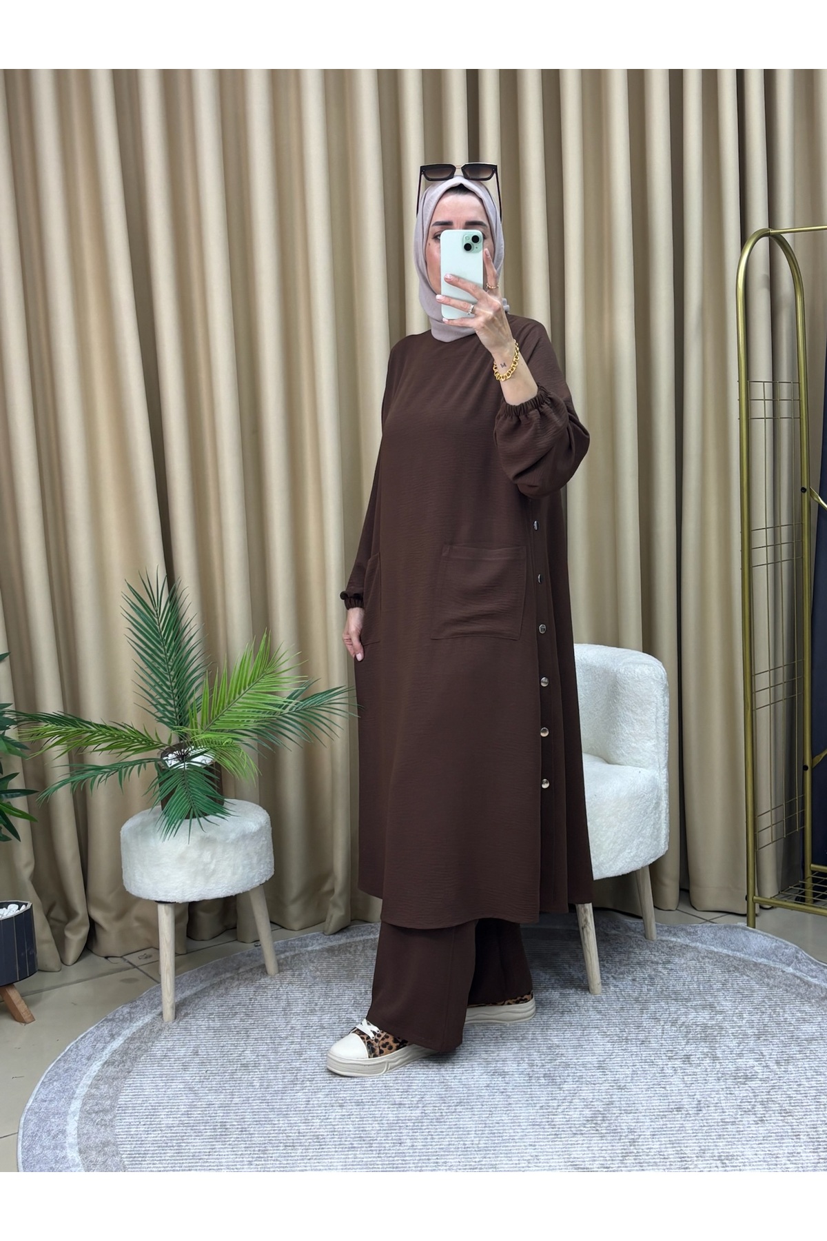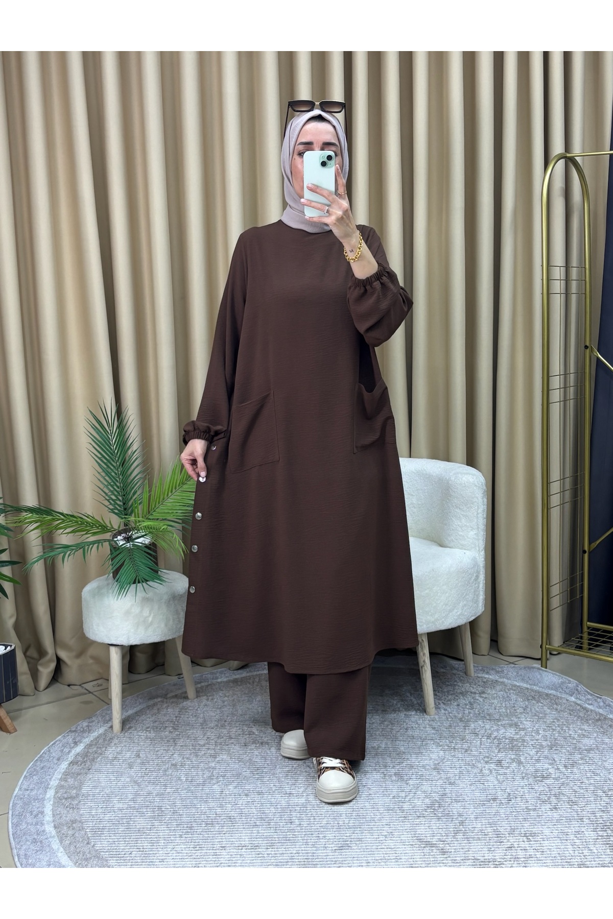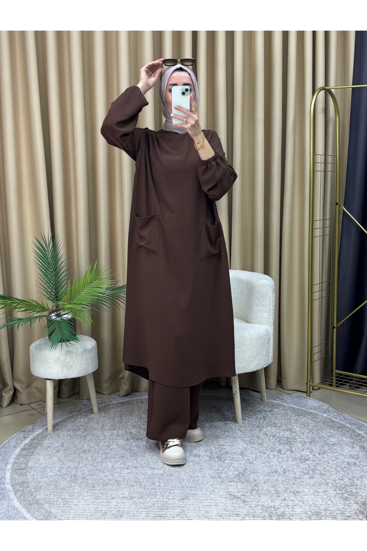 The tunic pantsuit, which combines a bitter brown tone with elegance and comfort, is ideal for daily use.