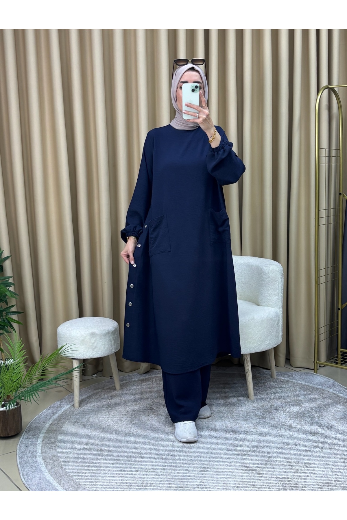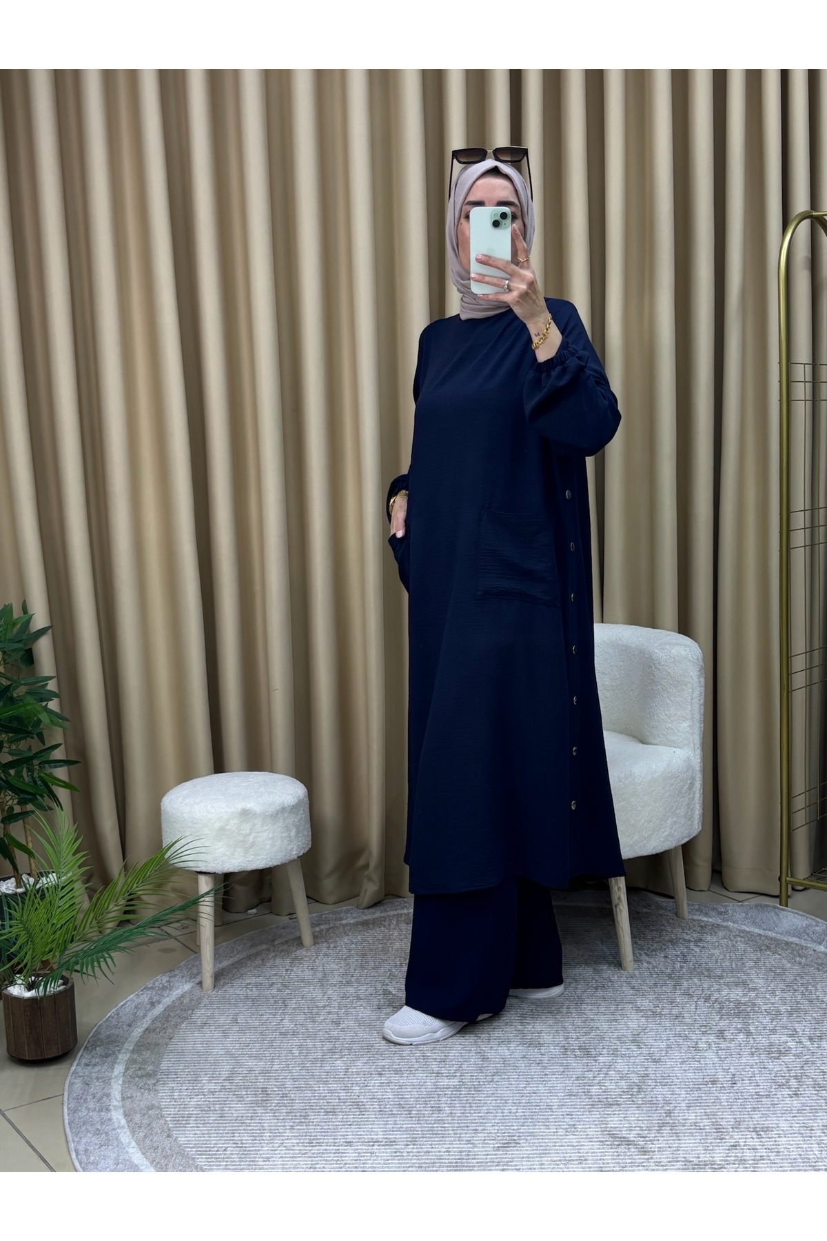 Tunic pants suit, which offers elegance and comfort together with its navy blue color, can be preferred in all seasons.
