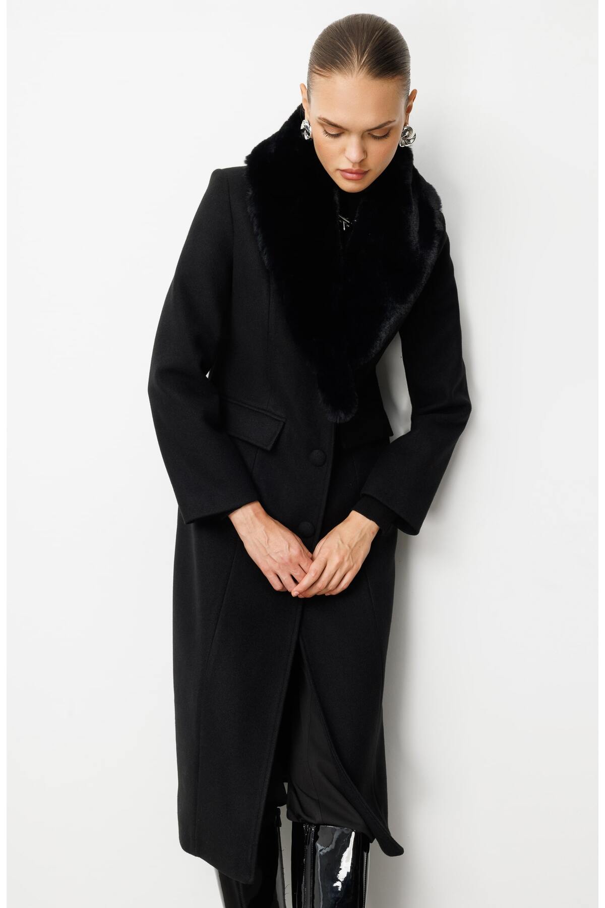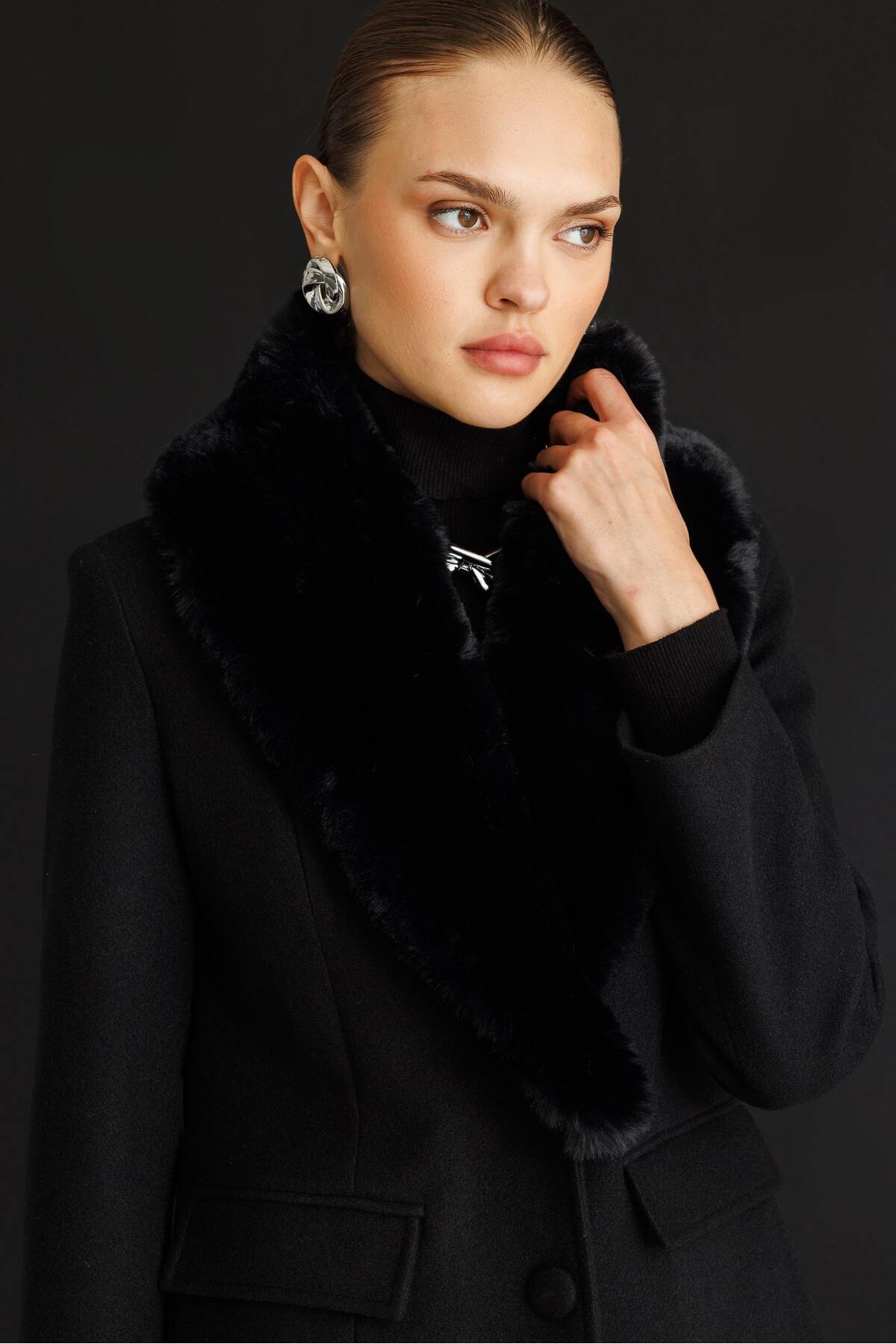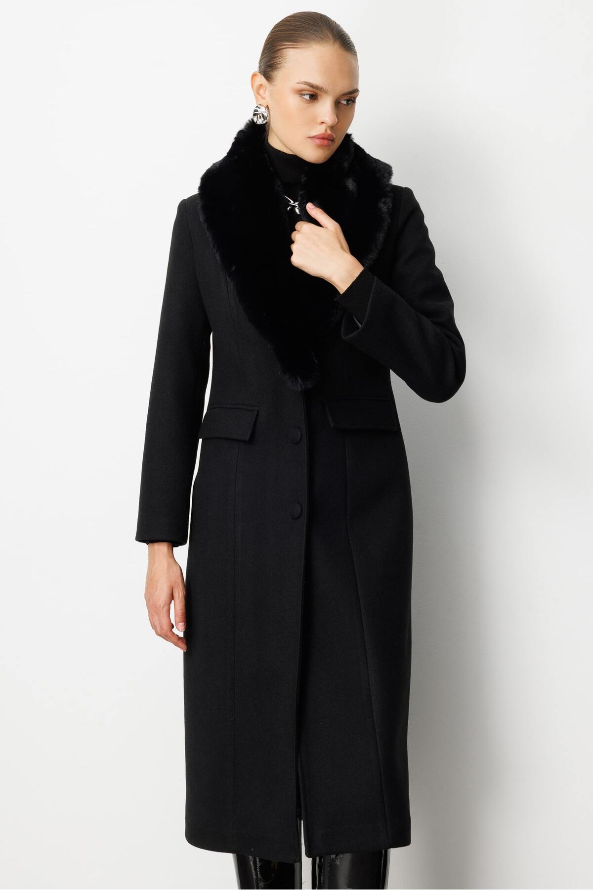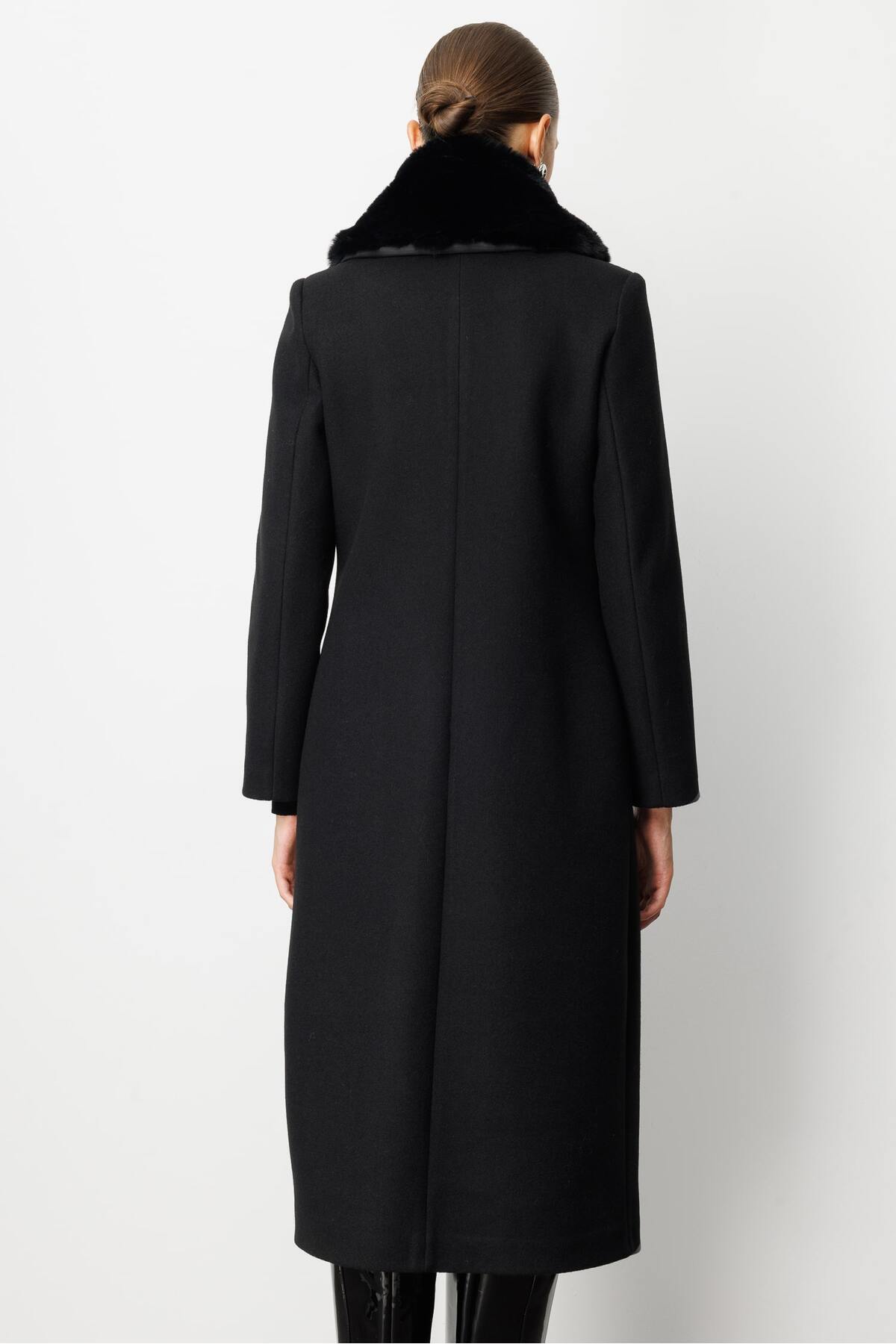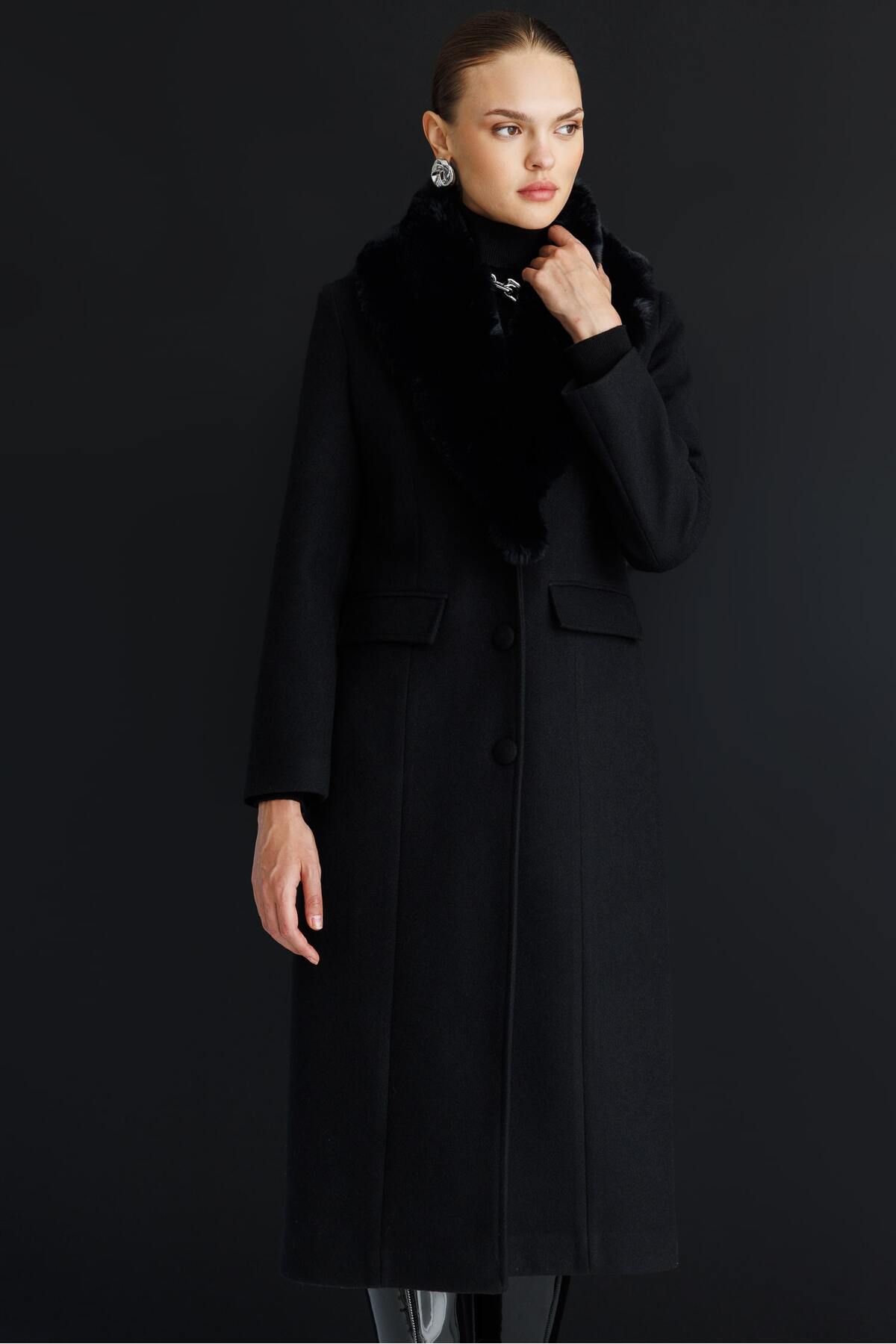 Mizalle Fur Neck Long Black Woolen Cachet Coat It is designed for those who are looking for both maximum temperature and dazzling elegance in winter.