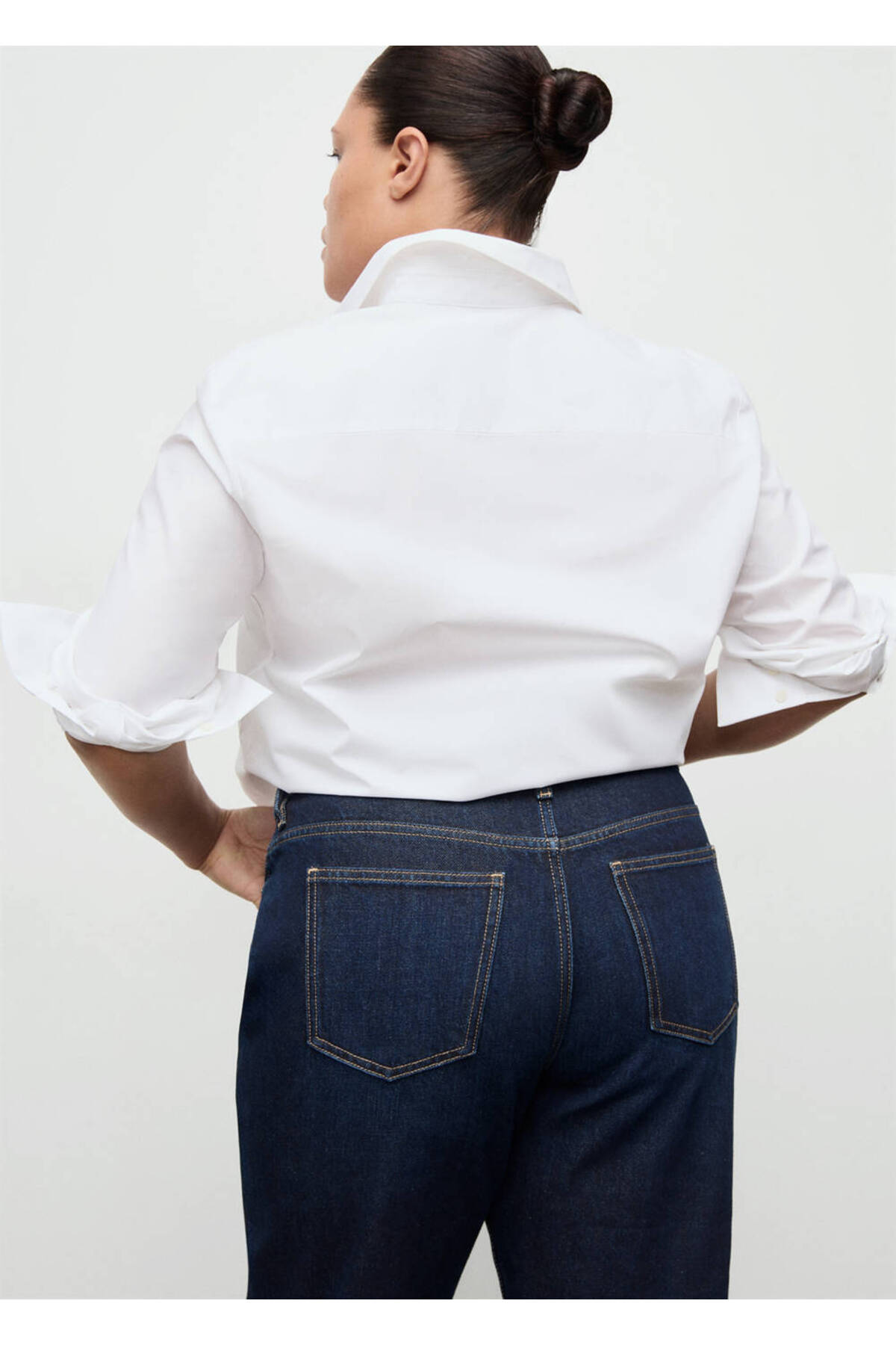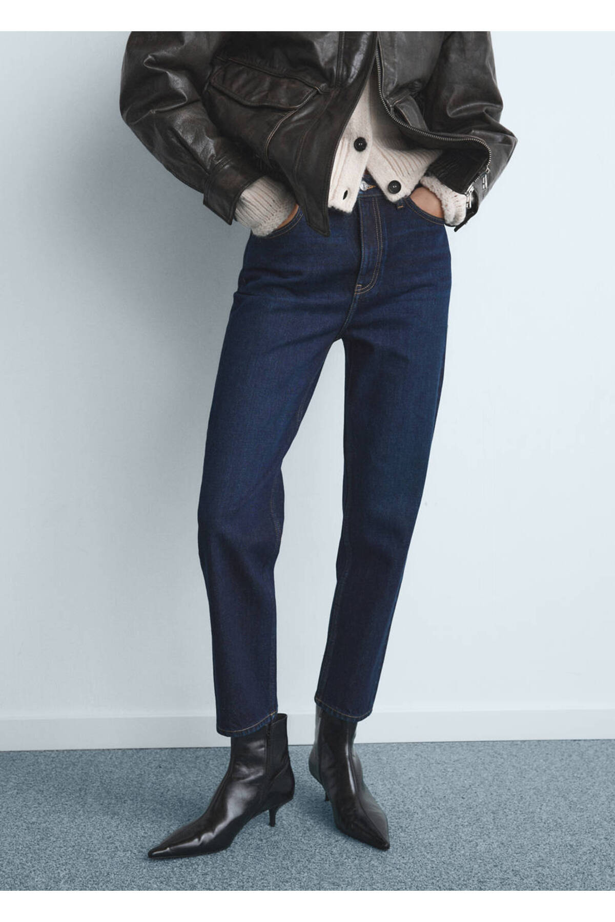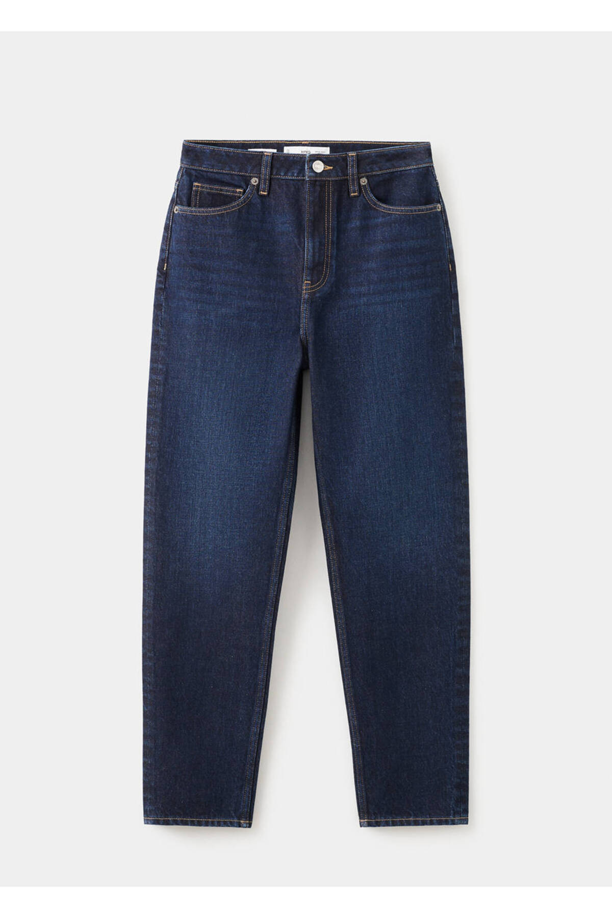 Jean style cotton fabric, Mom cut, Long design, Crop design, High waist, Belt rings, Five pockets, Front zipper and button closure, Disponible Plus, Online only.