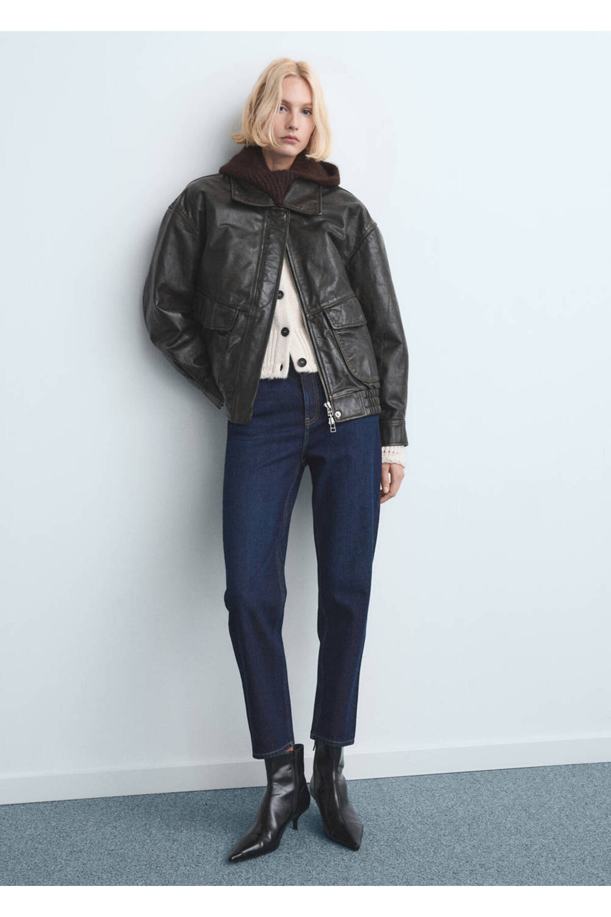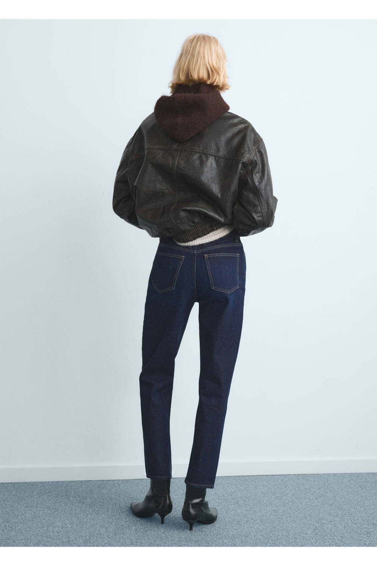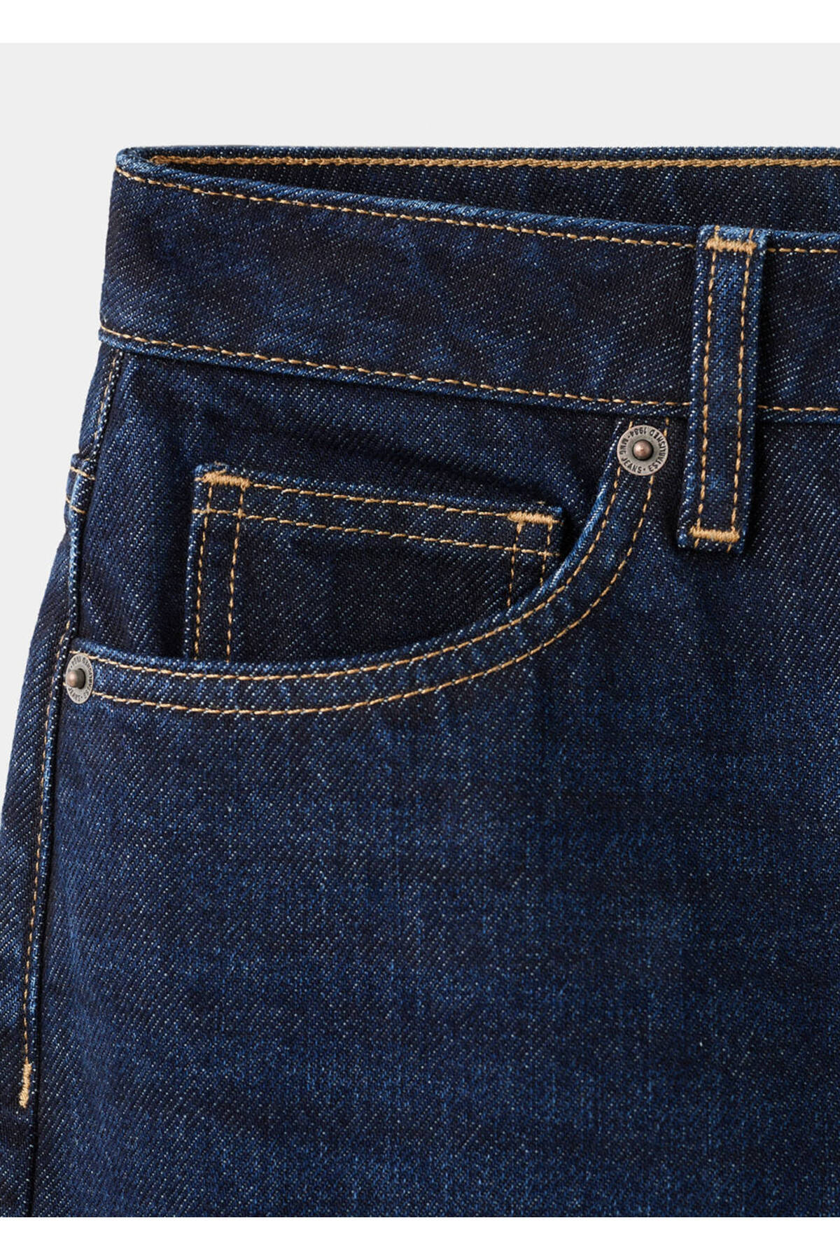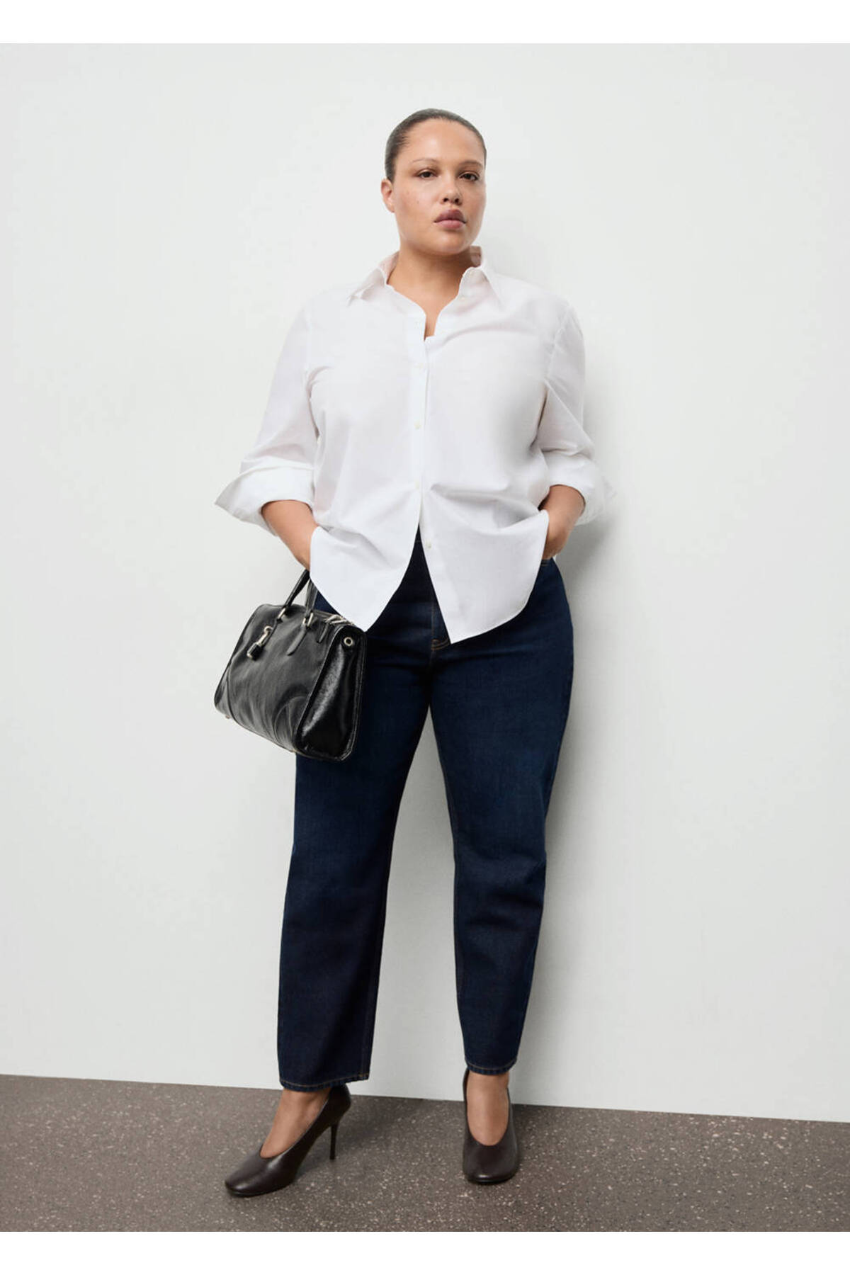 Jean style cotton fabric, Mom cut, Long design, Crop design, High waist, Belt rings, Five pockets, Front zipper and button closure, Disponible Plus, Online only.