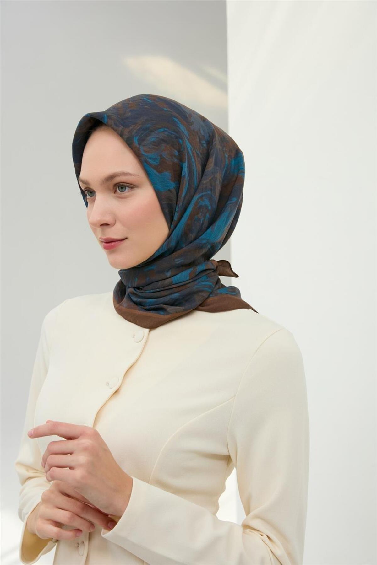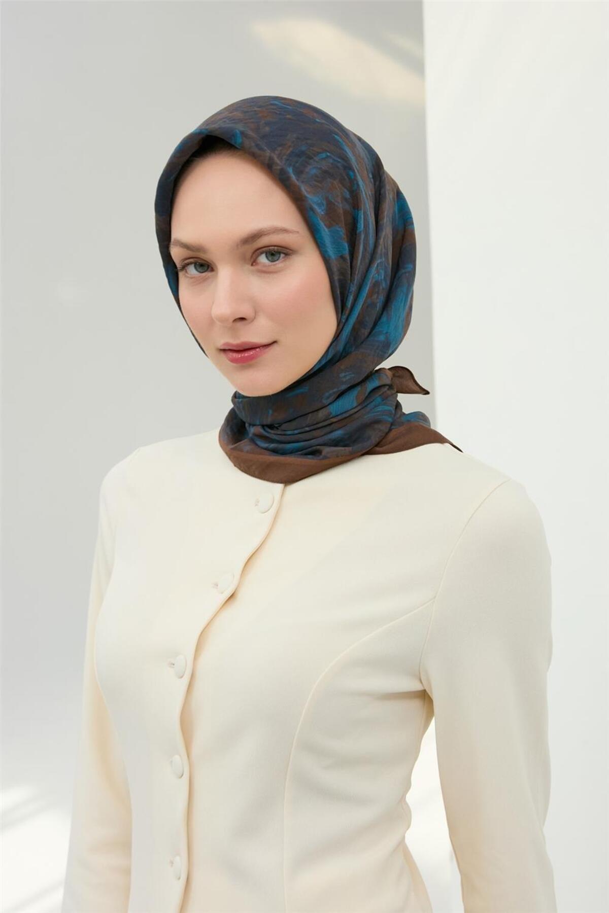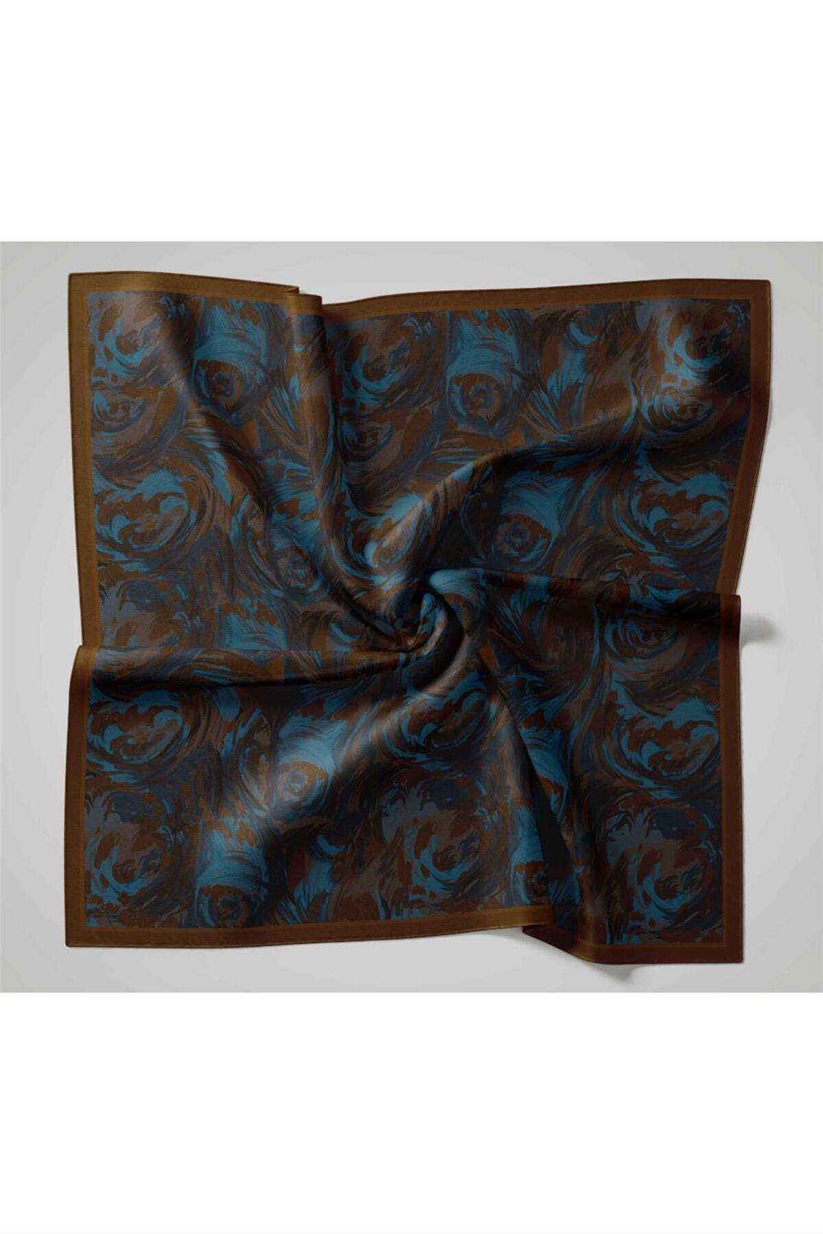 Silk Home Viscose Velora Scarf Brown Navy Sky Blue Pattern Soft Textured Full Posture 90x90 | ByTR