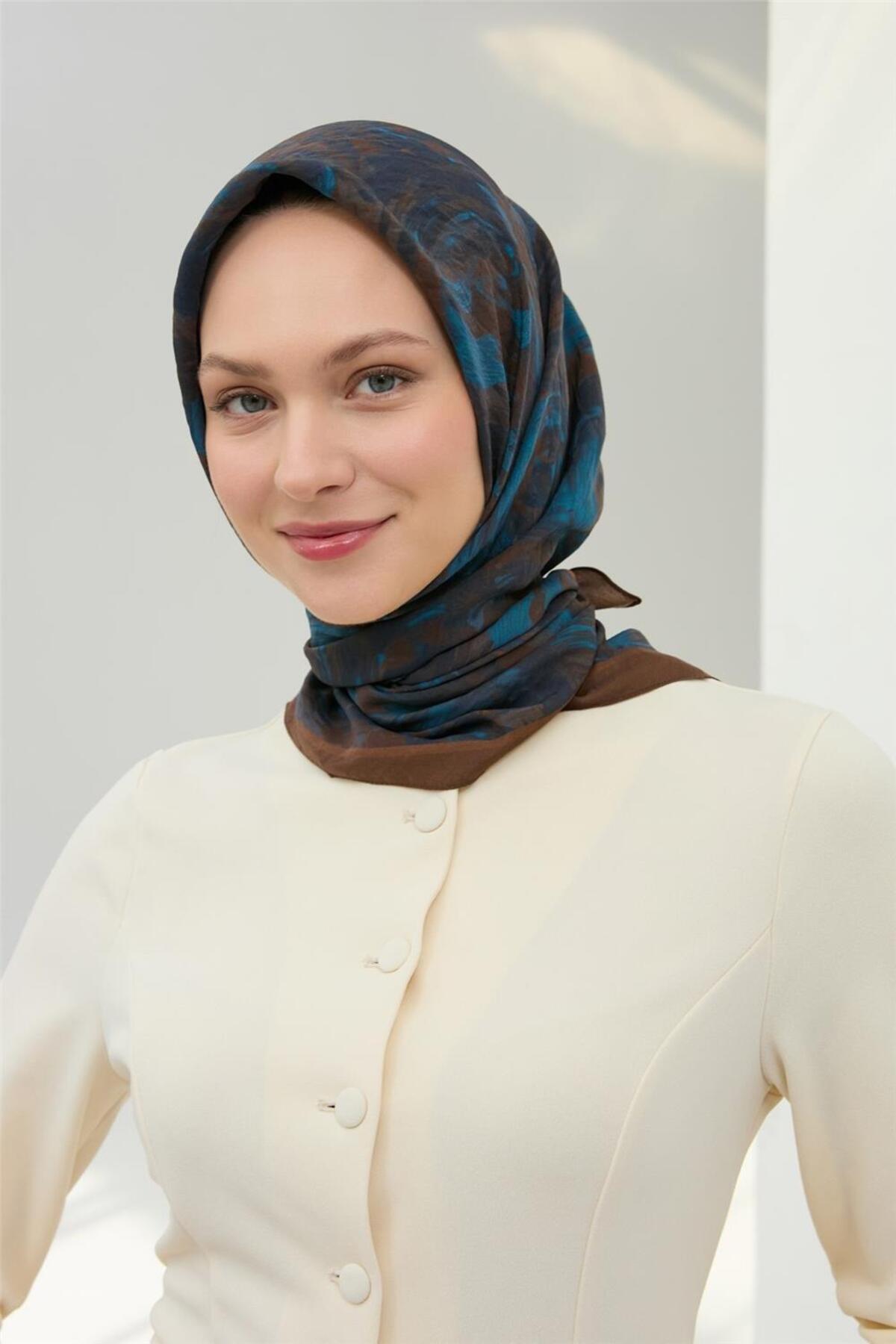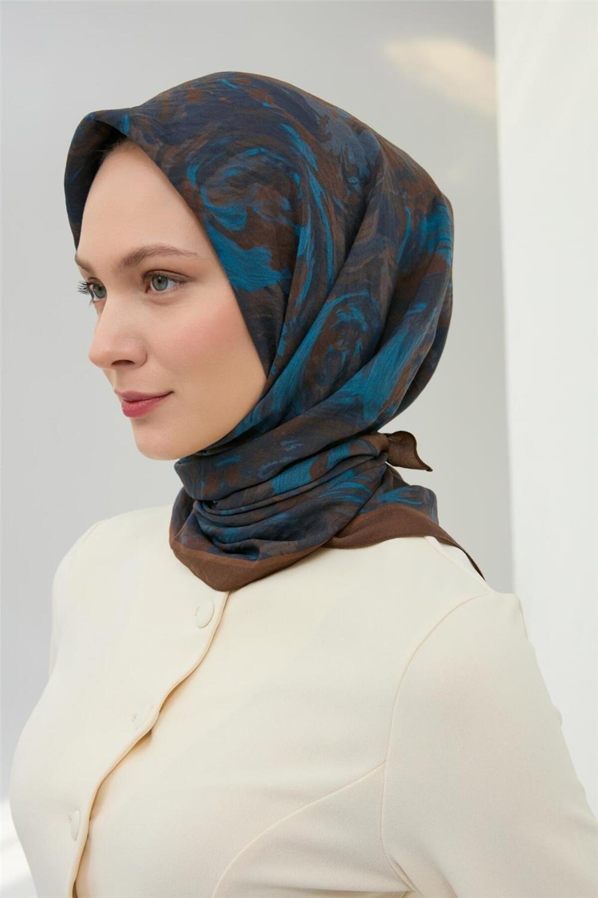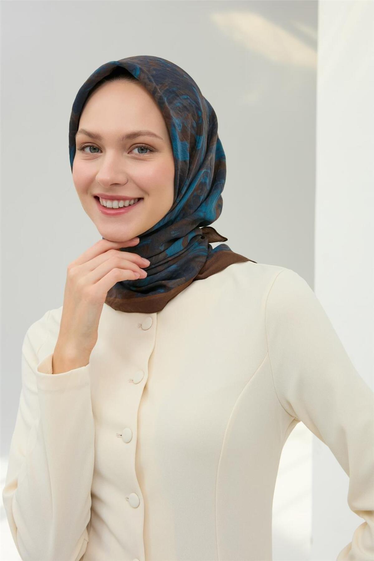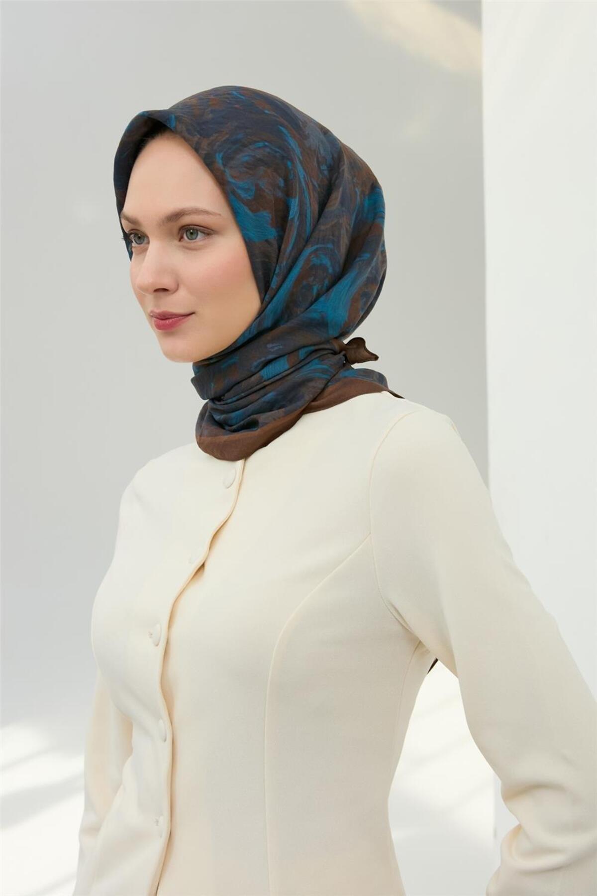 Silk Home Viscose Velora Scarf Brown Navy Sky Blue Pattern Soft Textured Full Posture 90x90 | ByTR
