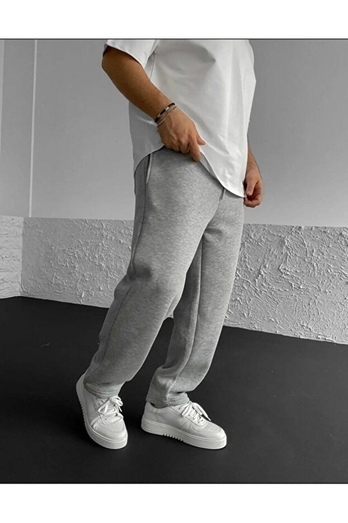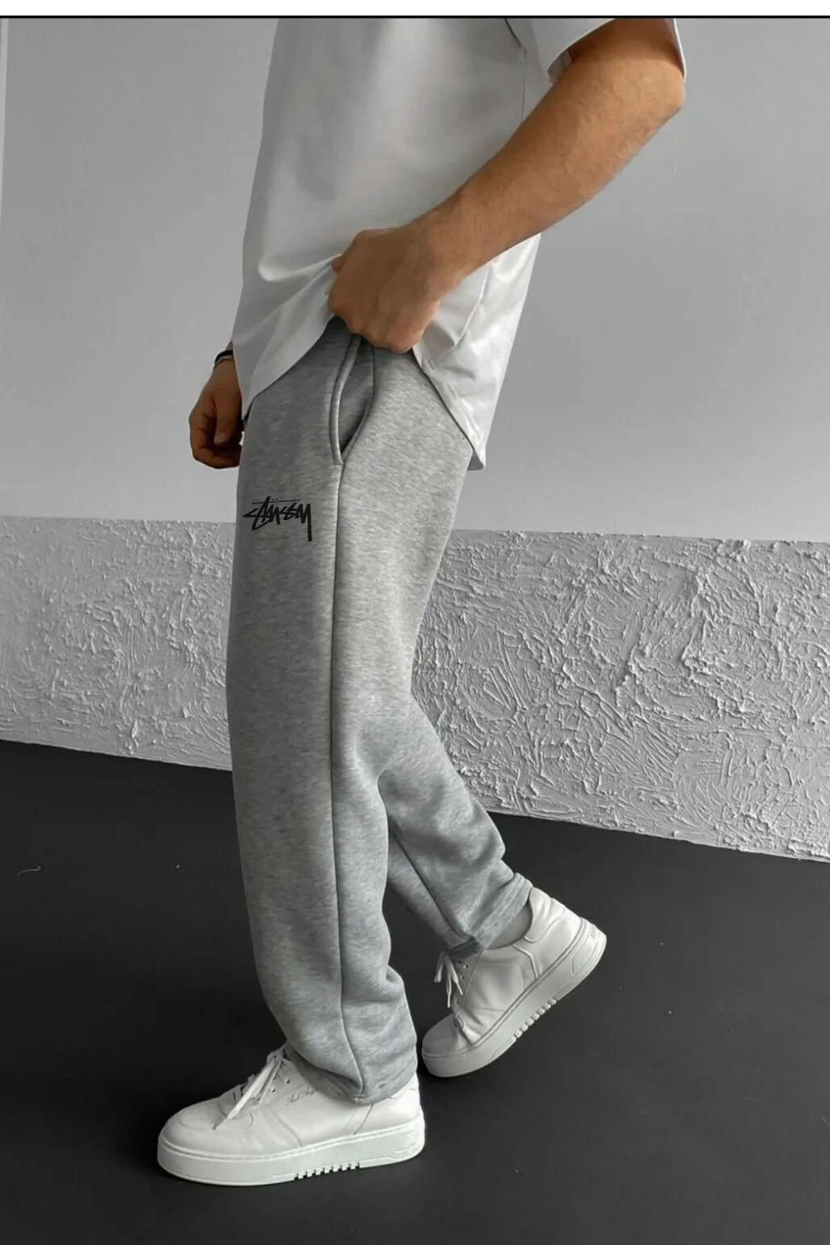 Printed grey 3-thread baggy sweatpants that stand out with their comfortable and stylish design, ideal for daily use.