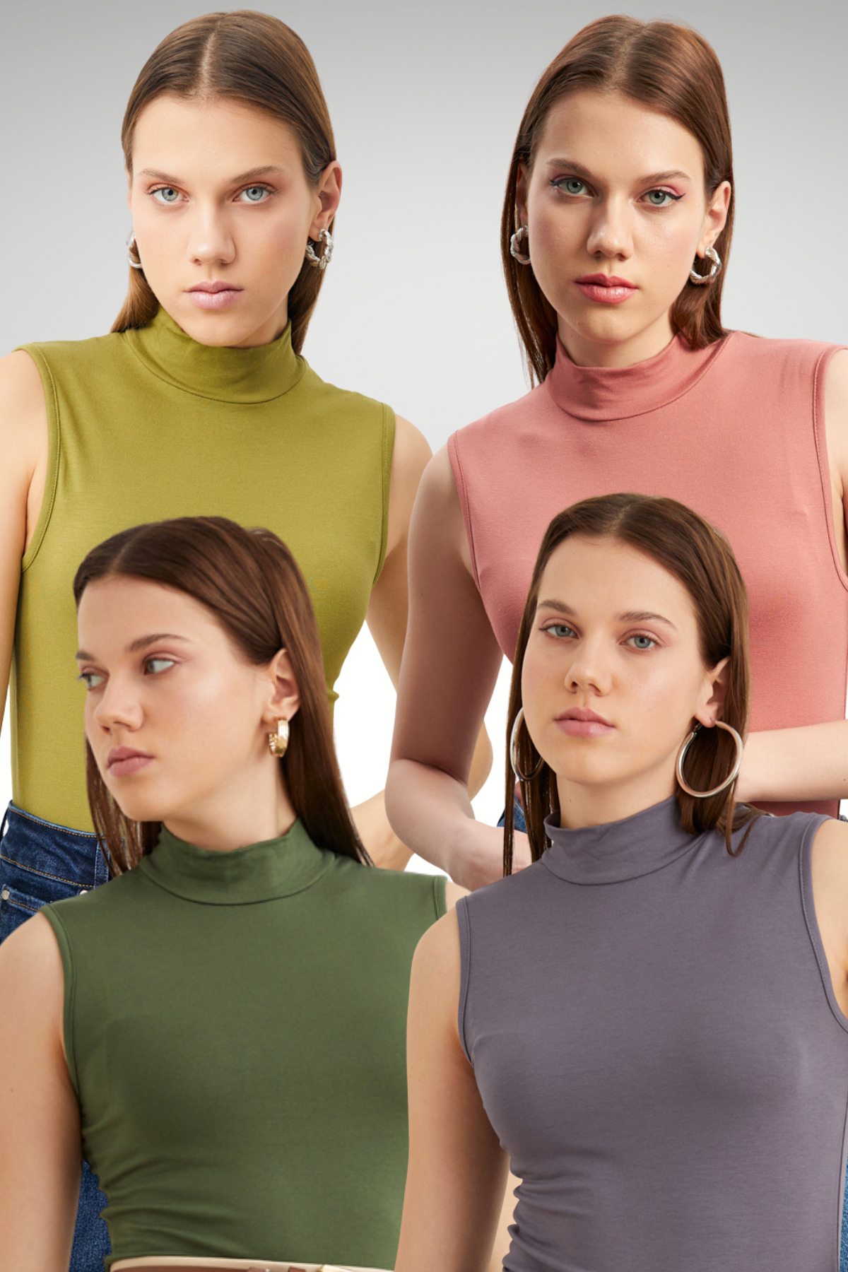 While offering a modern look with its half turtleneck detail, it highlights simple elegance with its flat cut.
