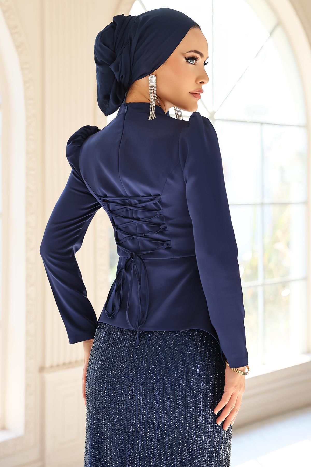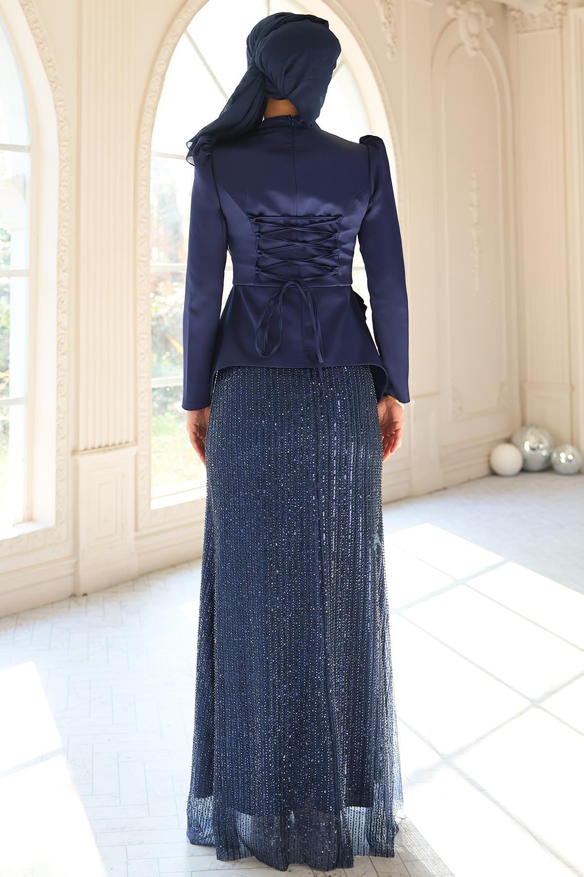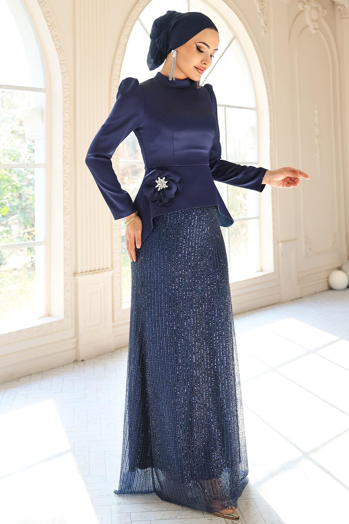 Olcay Floral Brooch Laced Back Satin and Sequined Modest Evening Dress Set NAVY BLUE 1683 | ByTR
