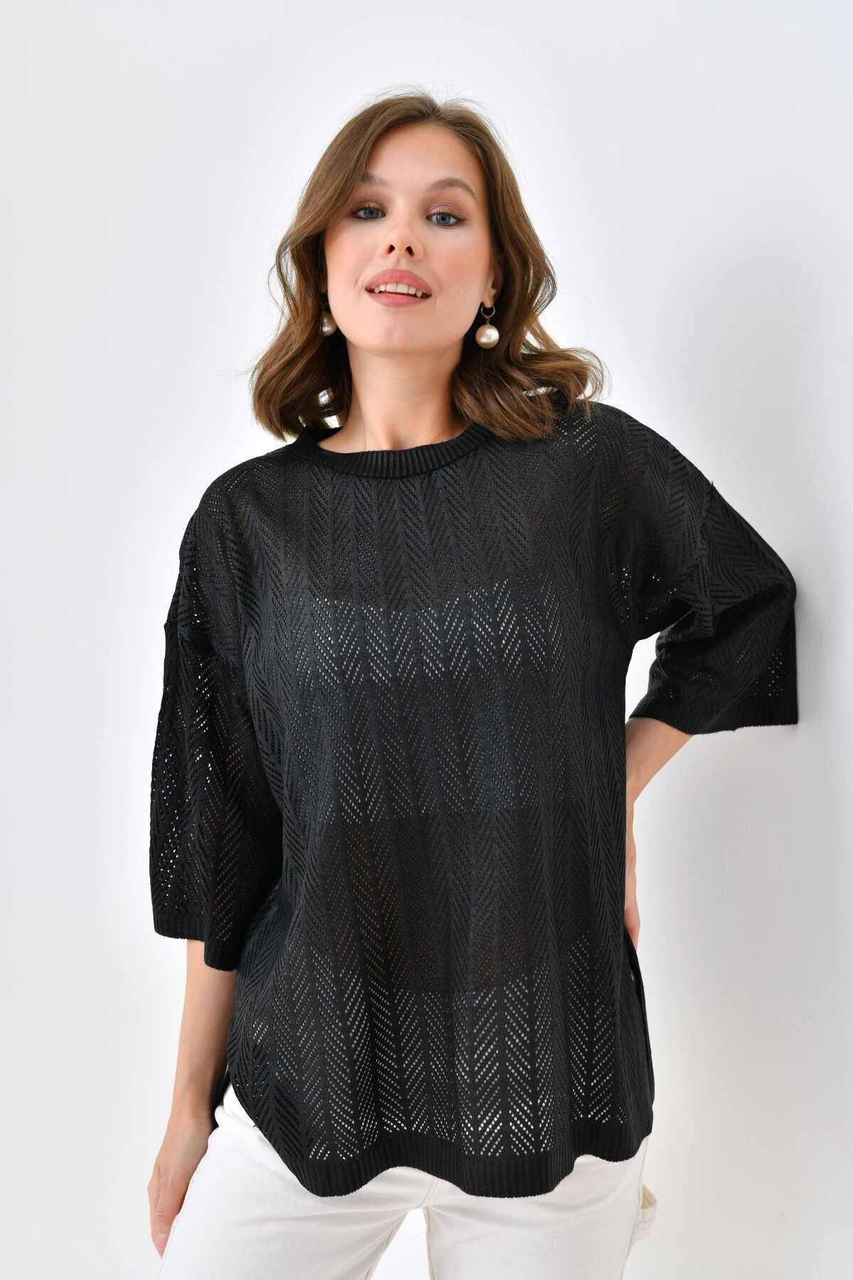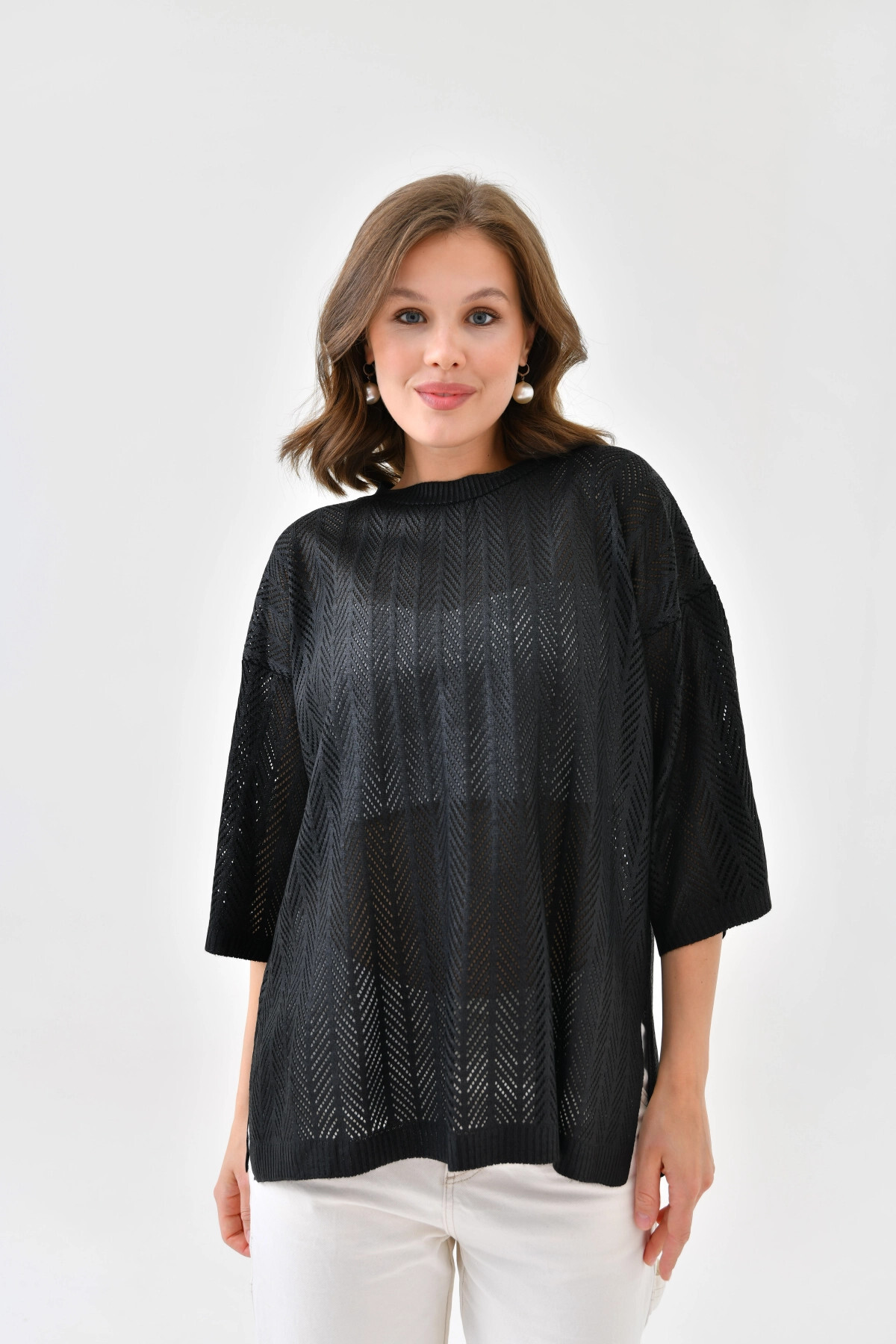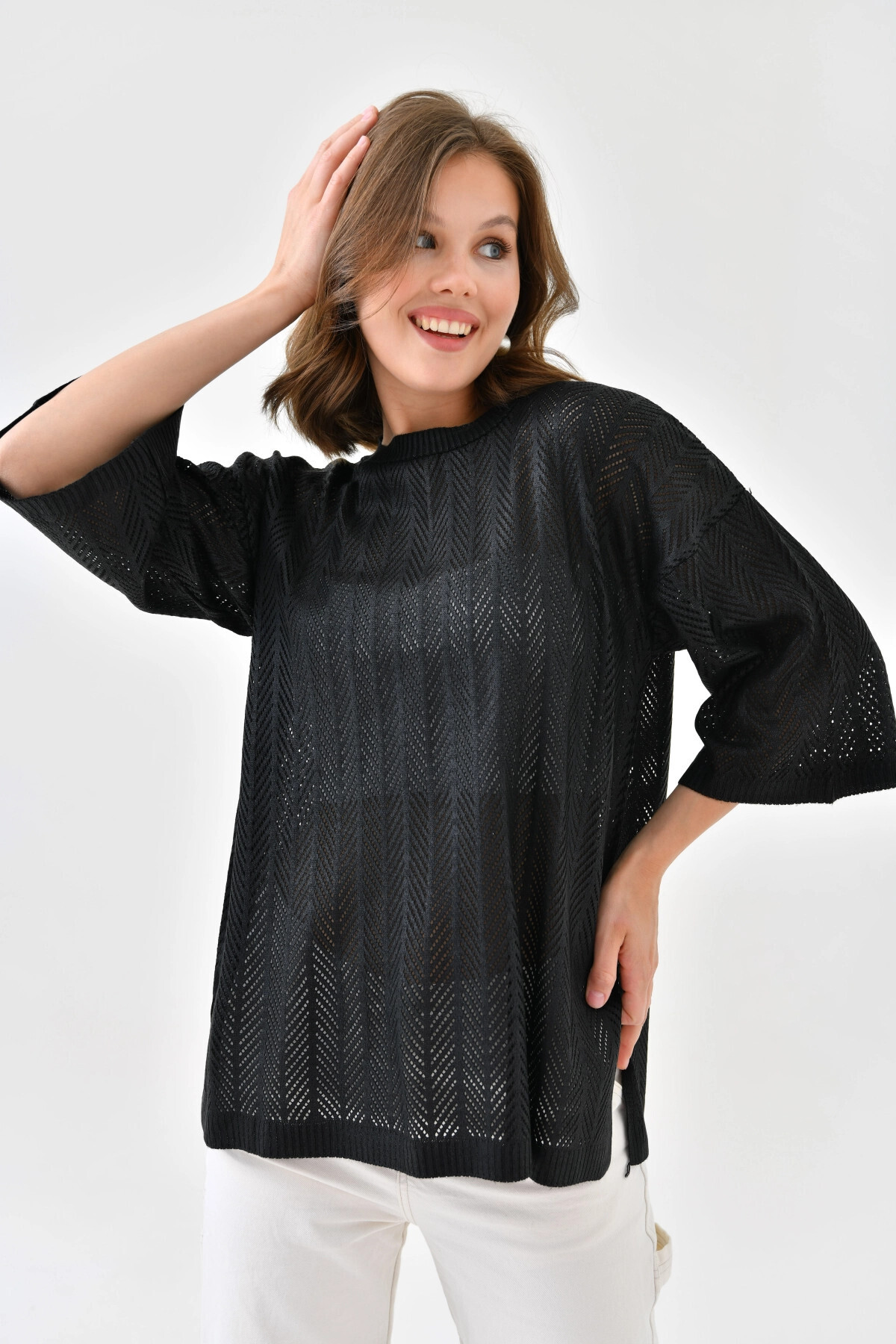 Women's Crew Neck Knit Detail Openwork Oversize Knitwear Sweater 10762