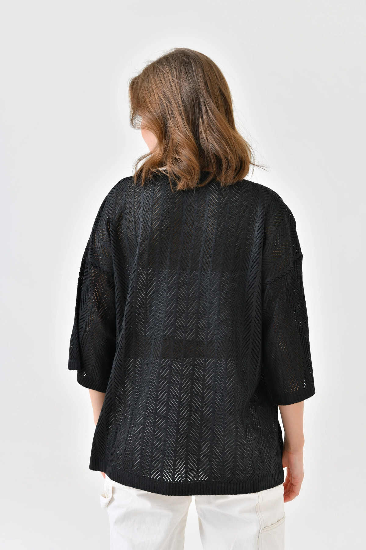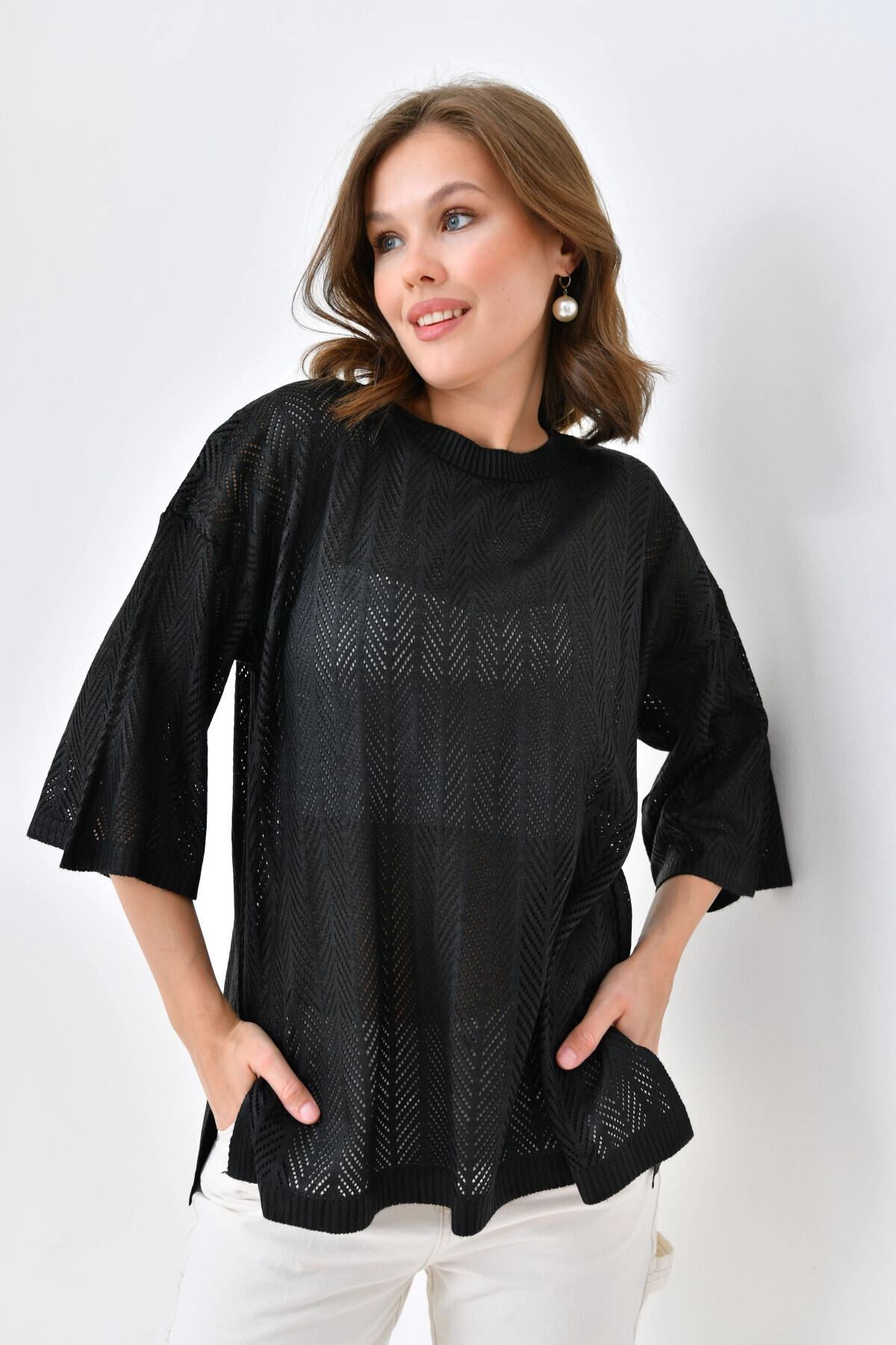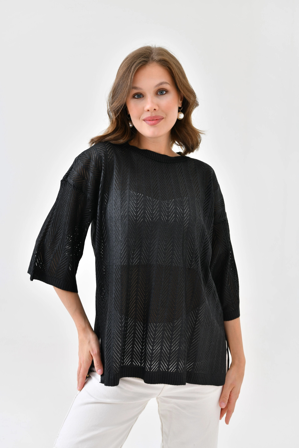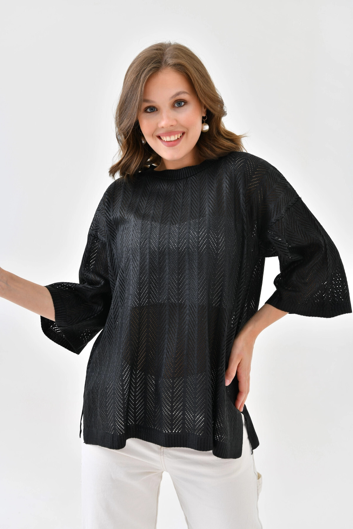 Women's Crew Neck Knit Detail Openwork Oversize Knitwear Sweater 10762