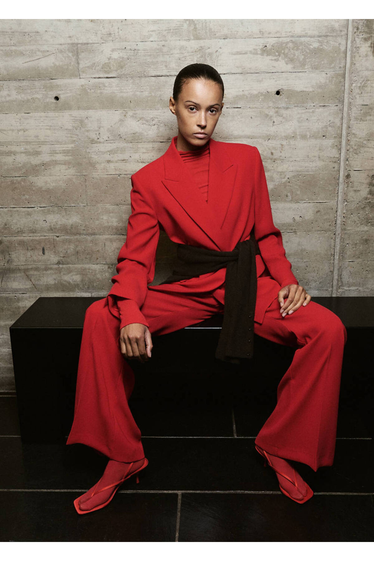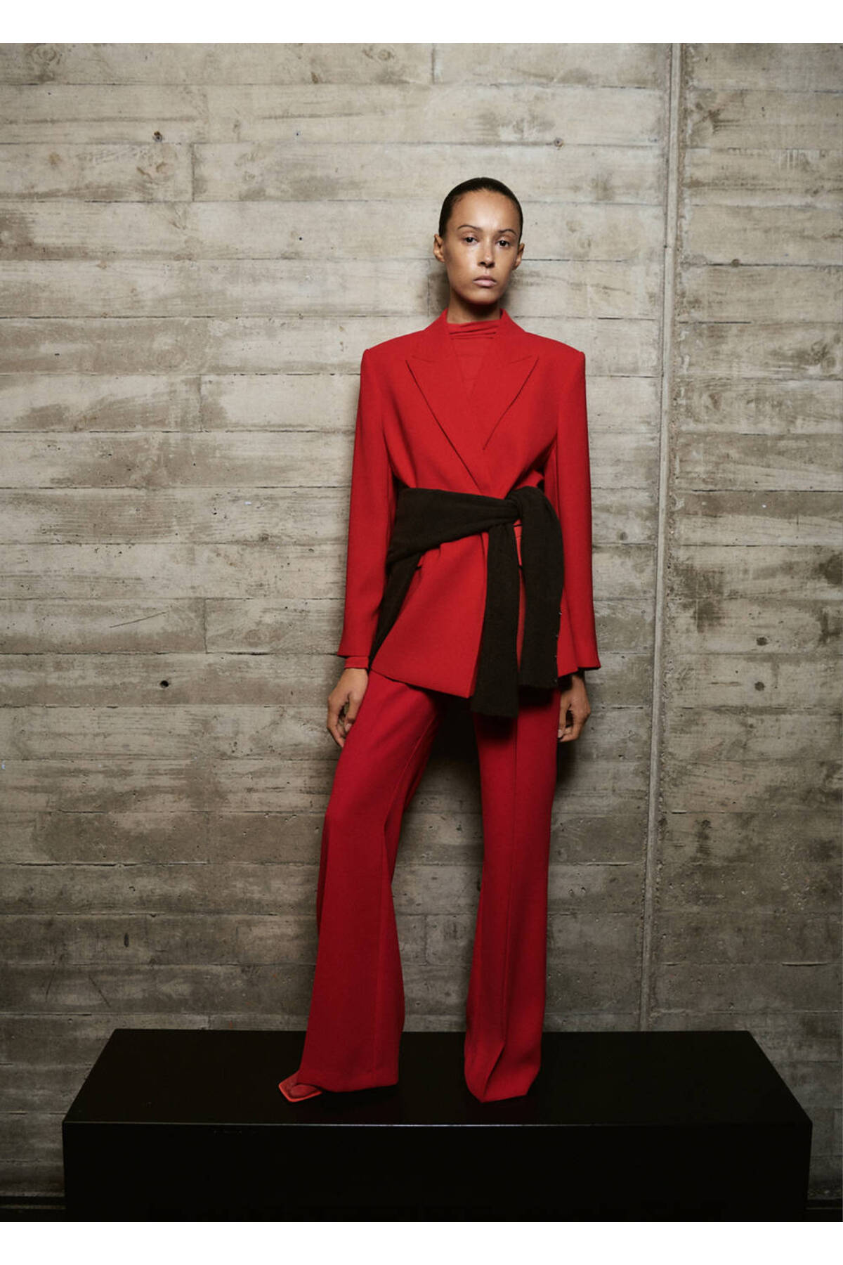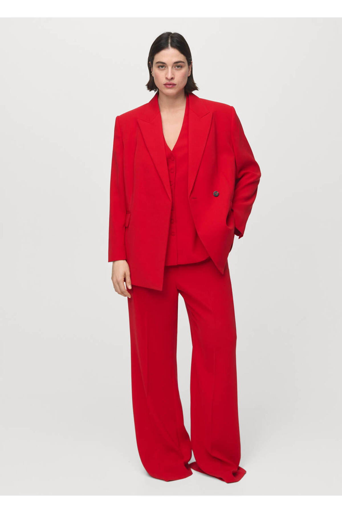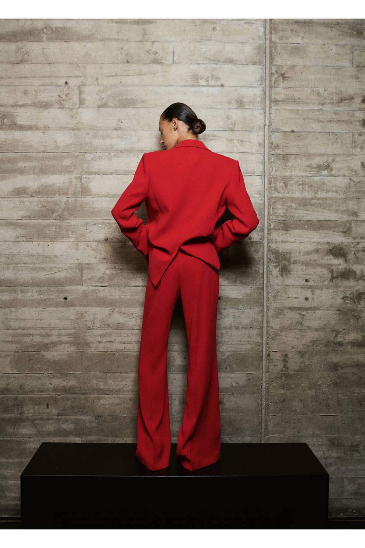 Suit style, Long design, Flare style, High waist, Side zipper closure, Total look.