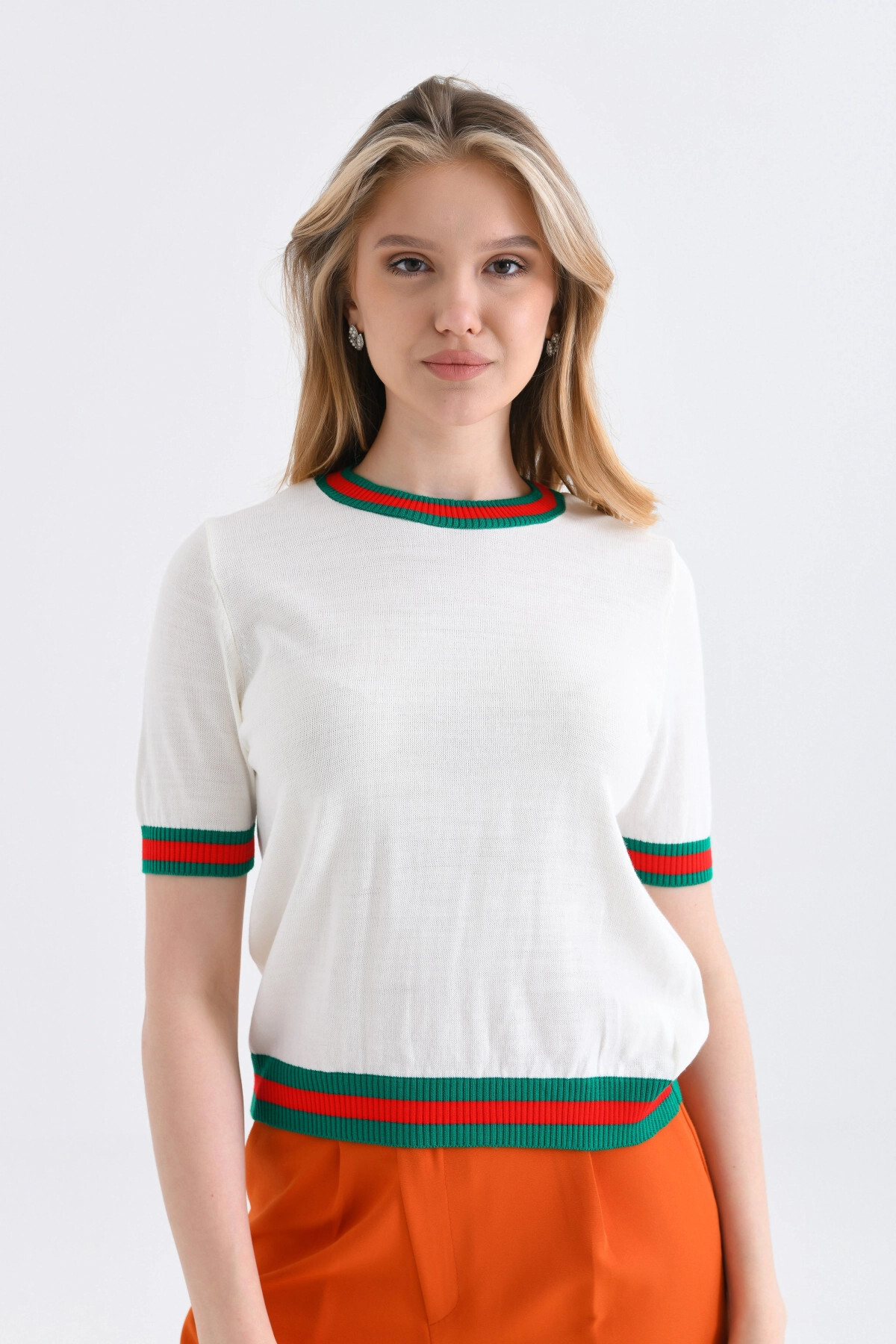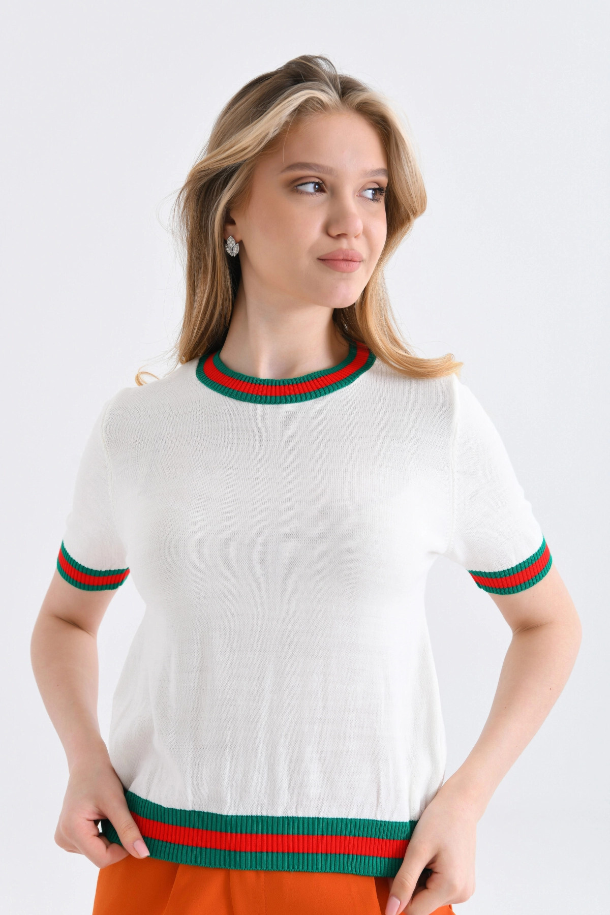 Women's Crew Neck Short Sleeve Striped Knitwear Sweater 10216