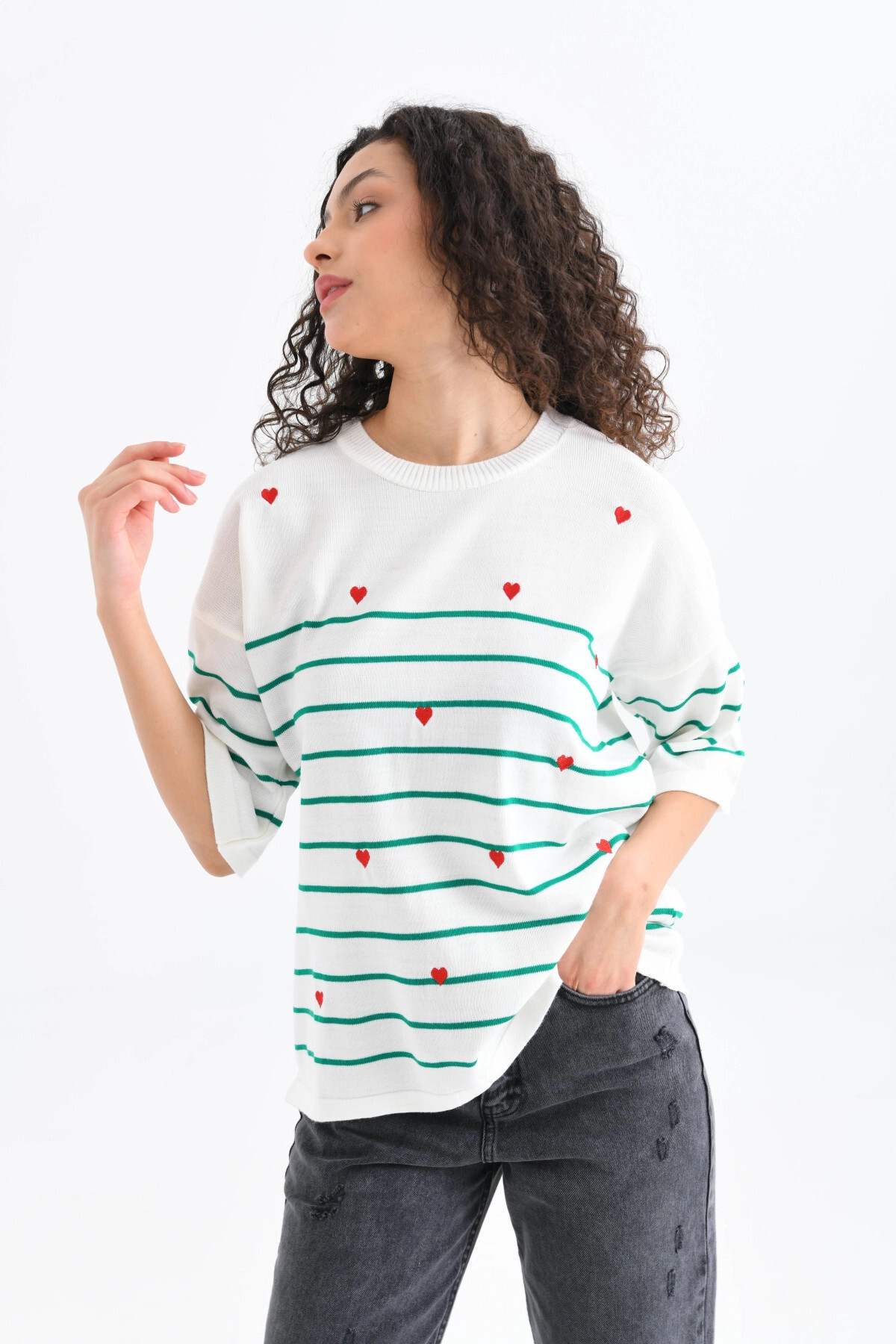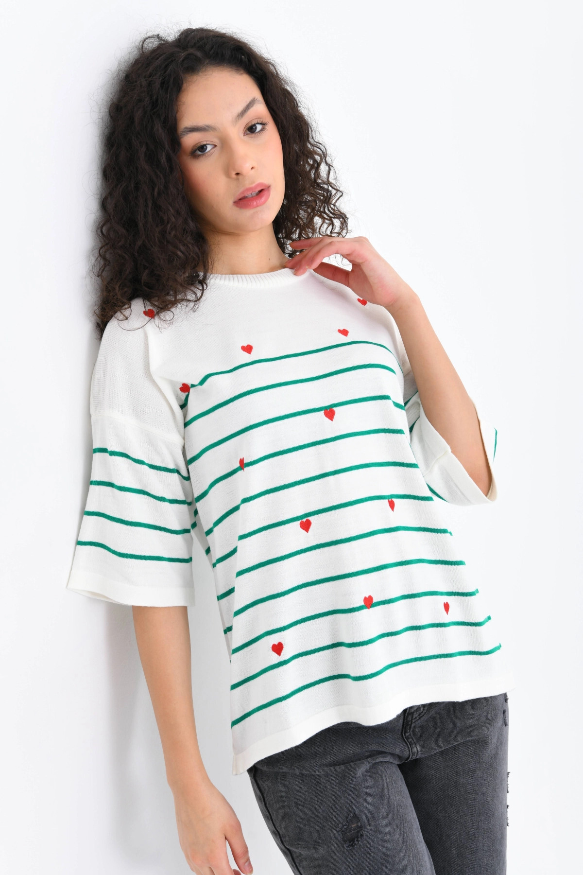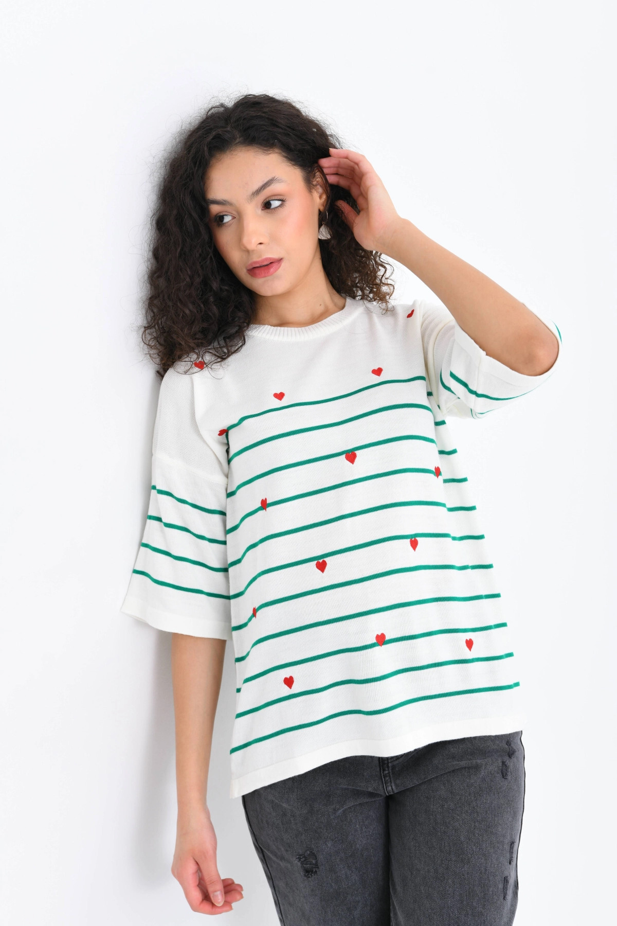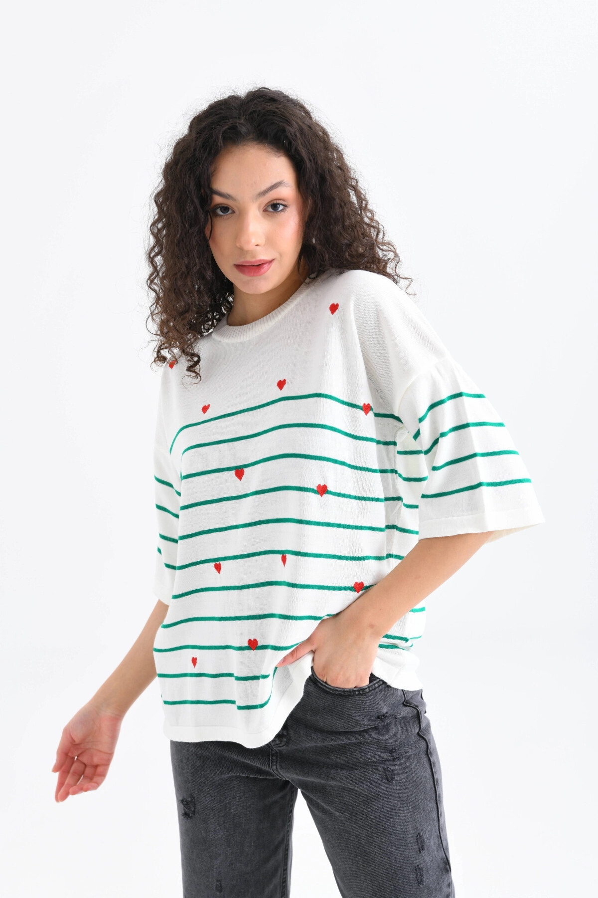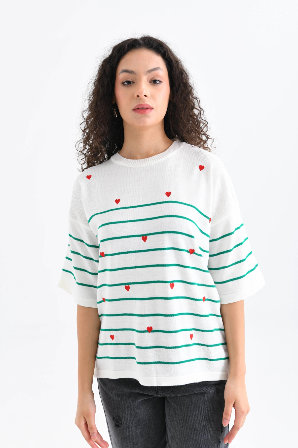 Women's Crew Neck Short Sleeve Striped Heart Embroidered Knitwear Sweater 10163