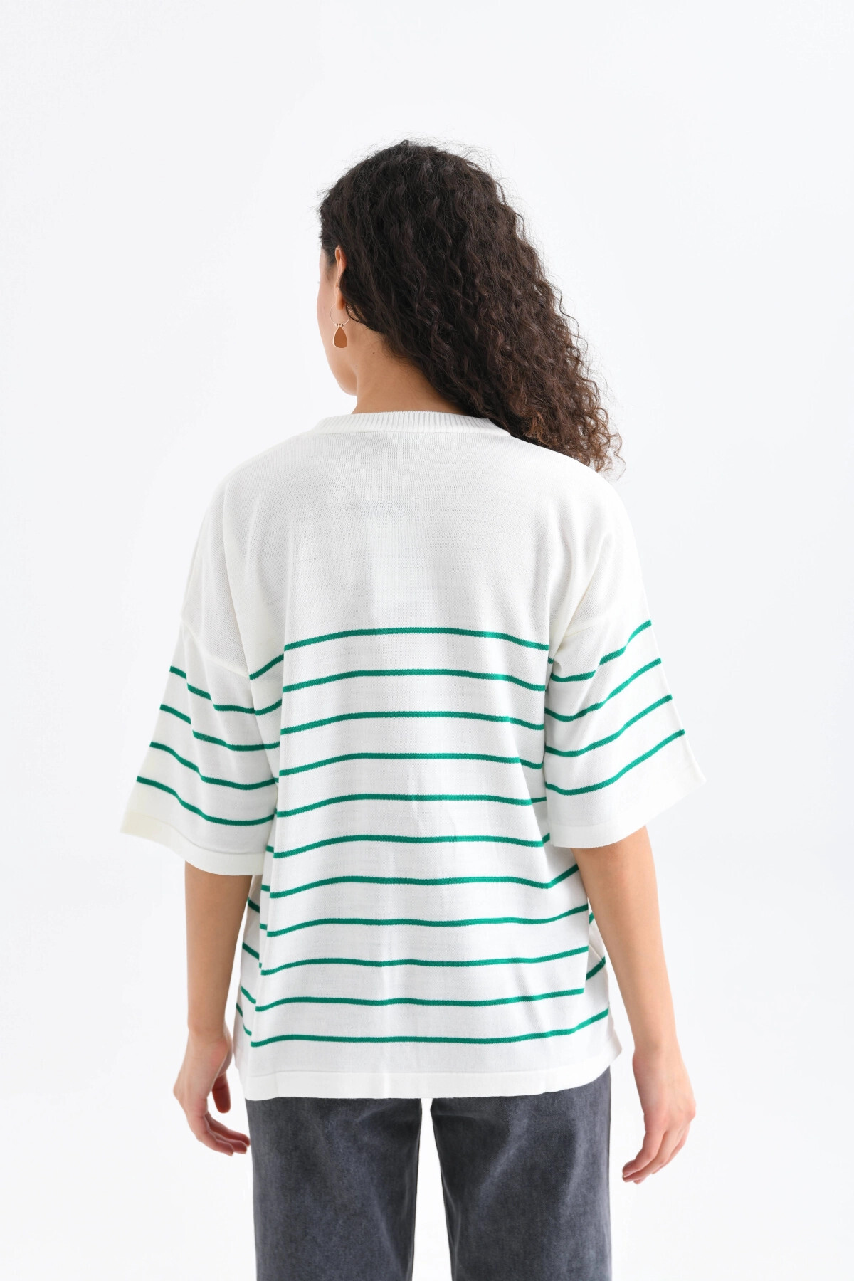 Park Karon Women's Crew Neck Short Sleeve Striped Heart Embroidered Knitwear Sweater 10163 | ByTR