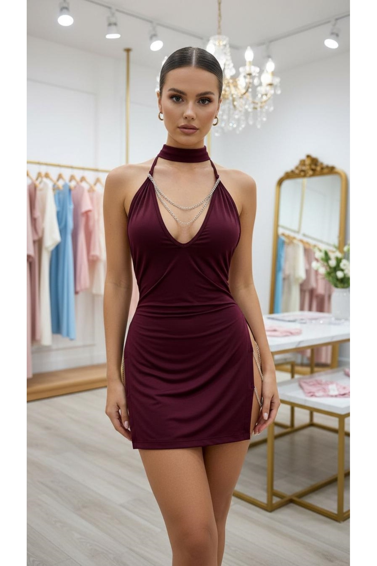 SİA LESS Women's Claret Red Chain Detailed Romantic Neckline Collar Mini Tie Neck Dress | ByTR