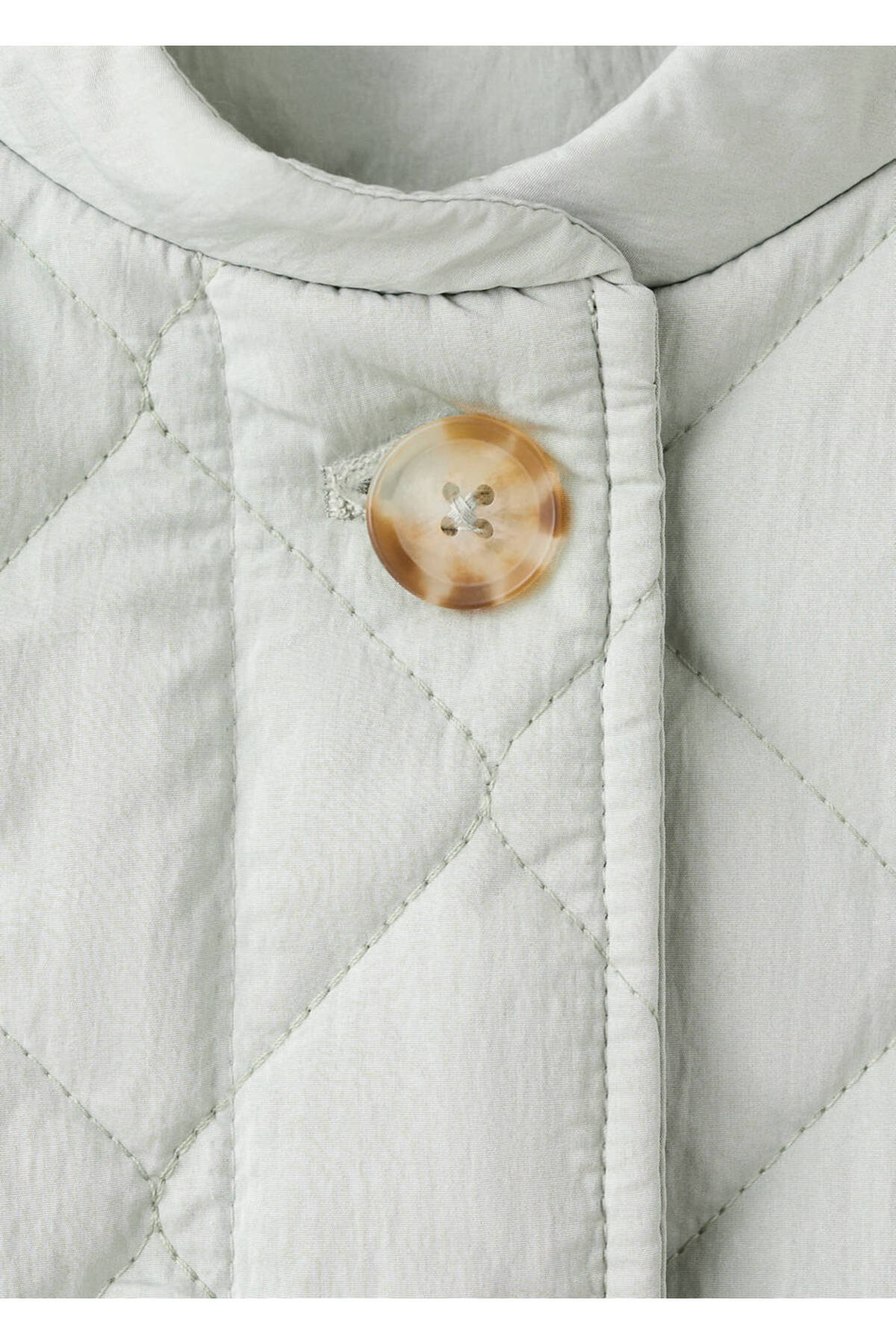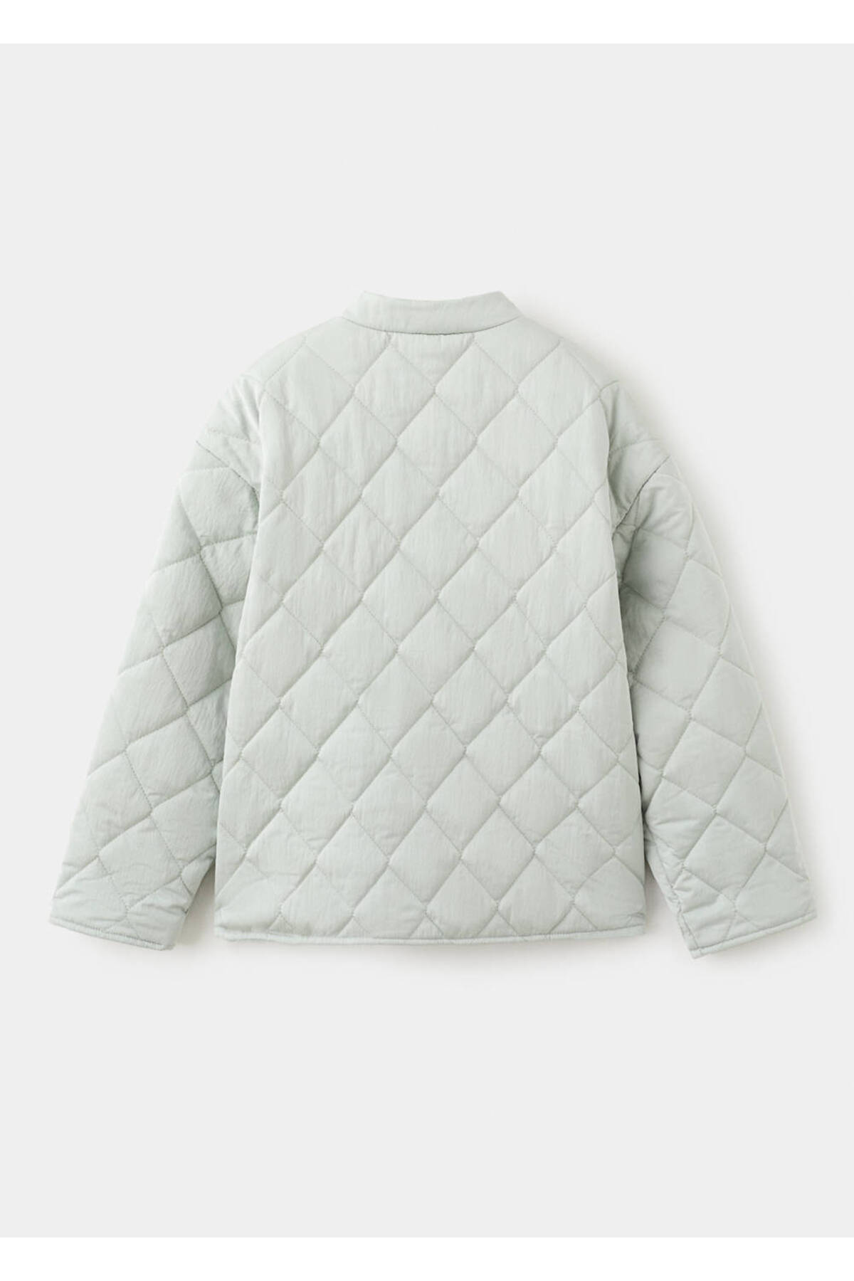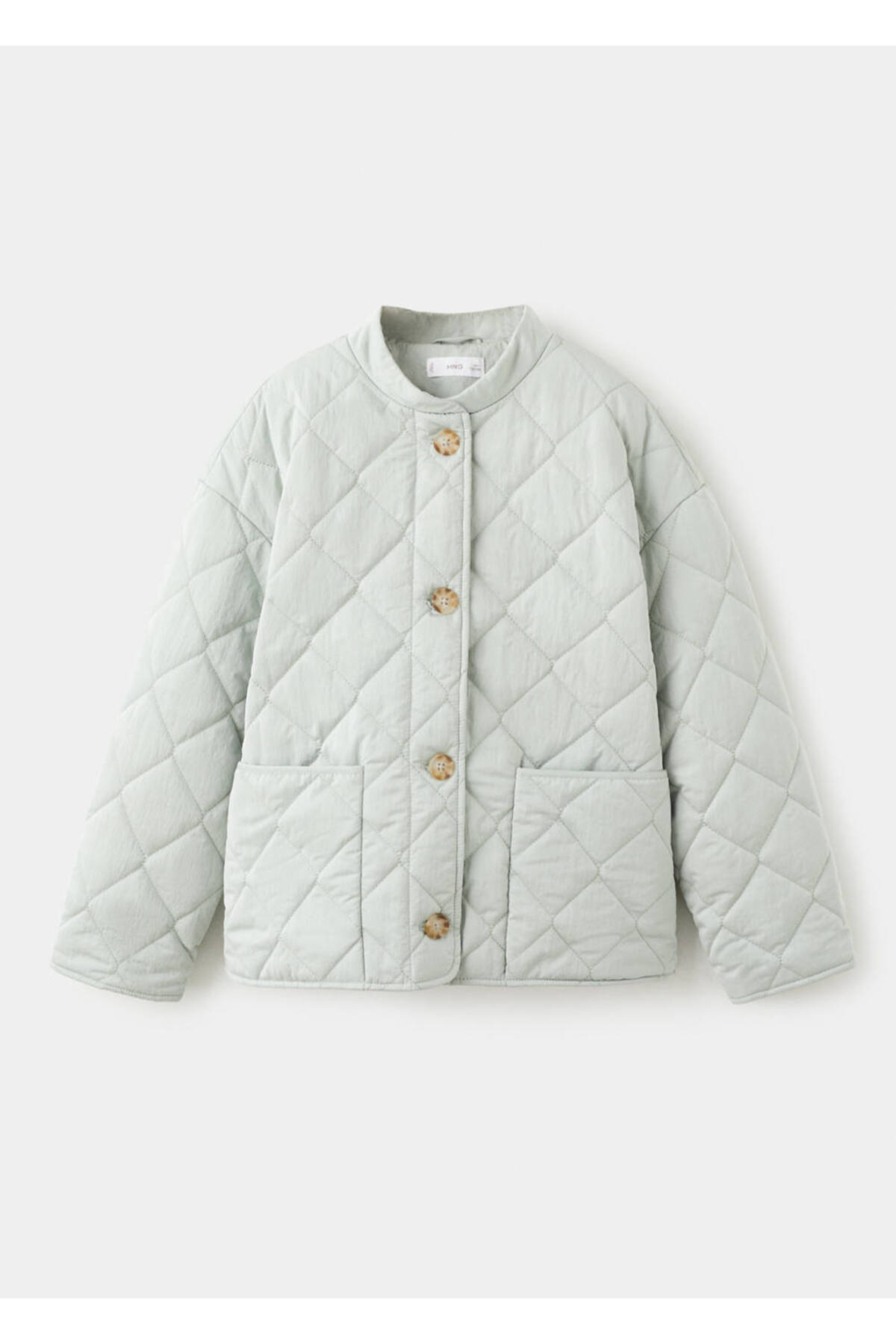 Quilted fabric, Plain Design, Diamond patterned, Funnel collar, Long sleeves, Front button closure, Two patch pockets on the front.