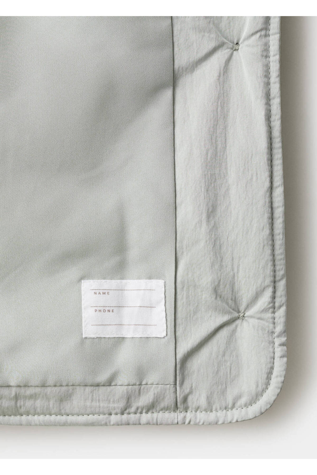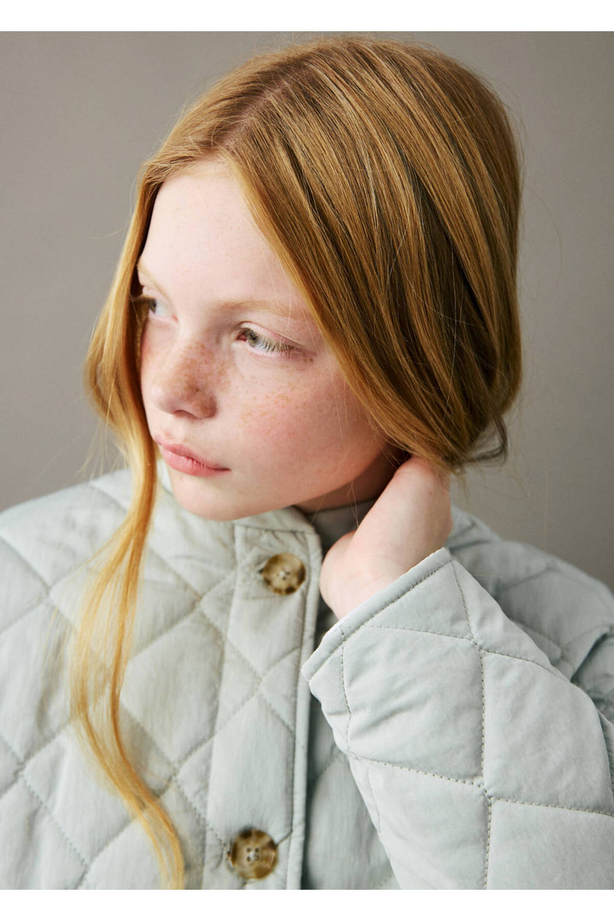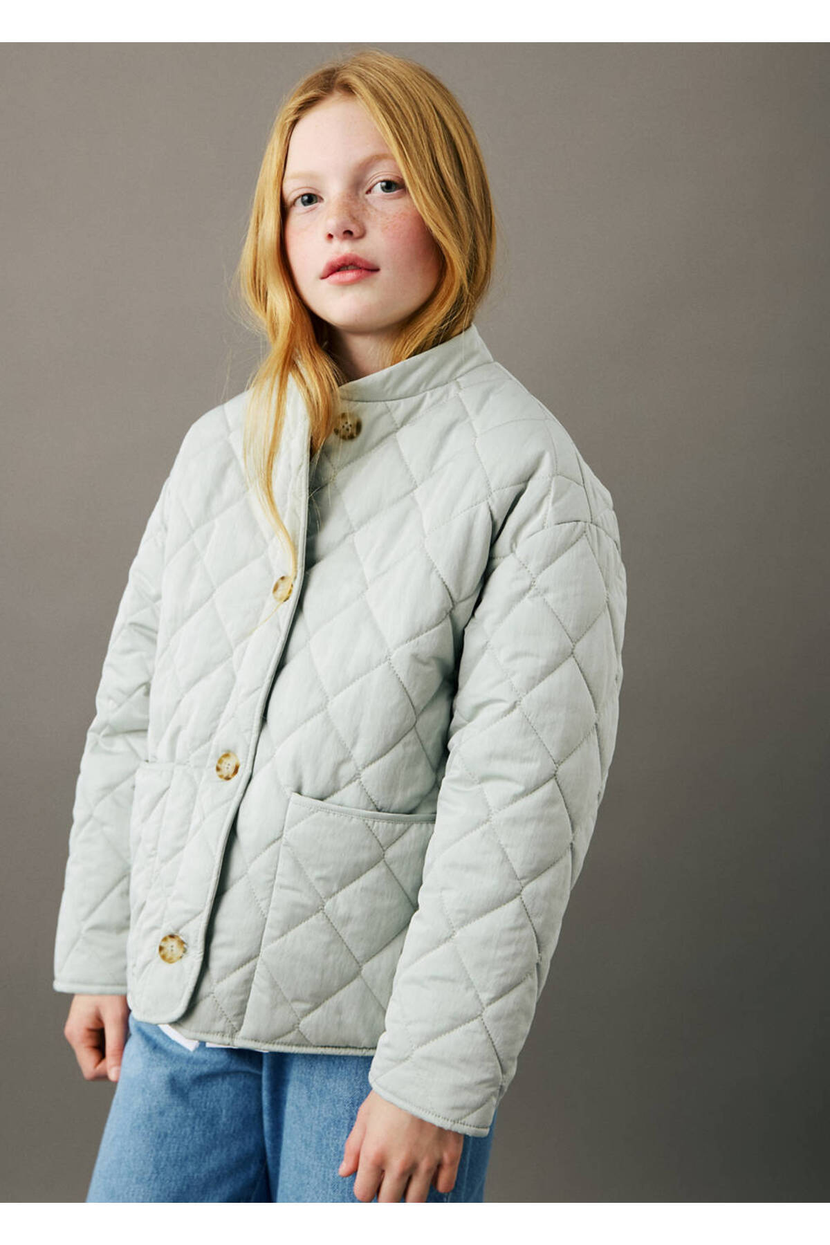 Quilted fabric, Plain Design, Diamond patterned, Funnel collar, Long sleeves, Front button closure, Two patch pockets on the front.