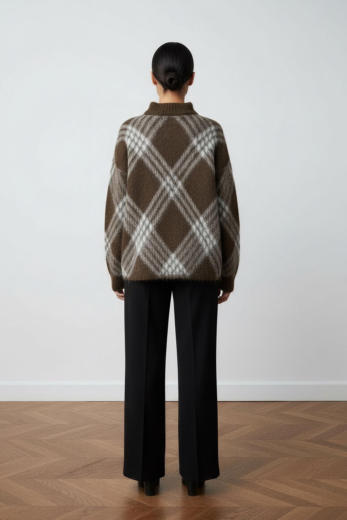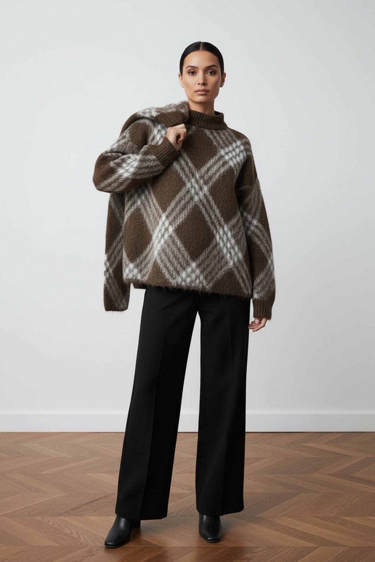 Coffee Plaid Oversized Knitwear Sweater