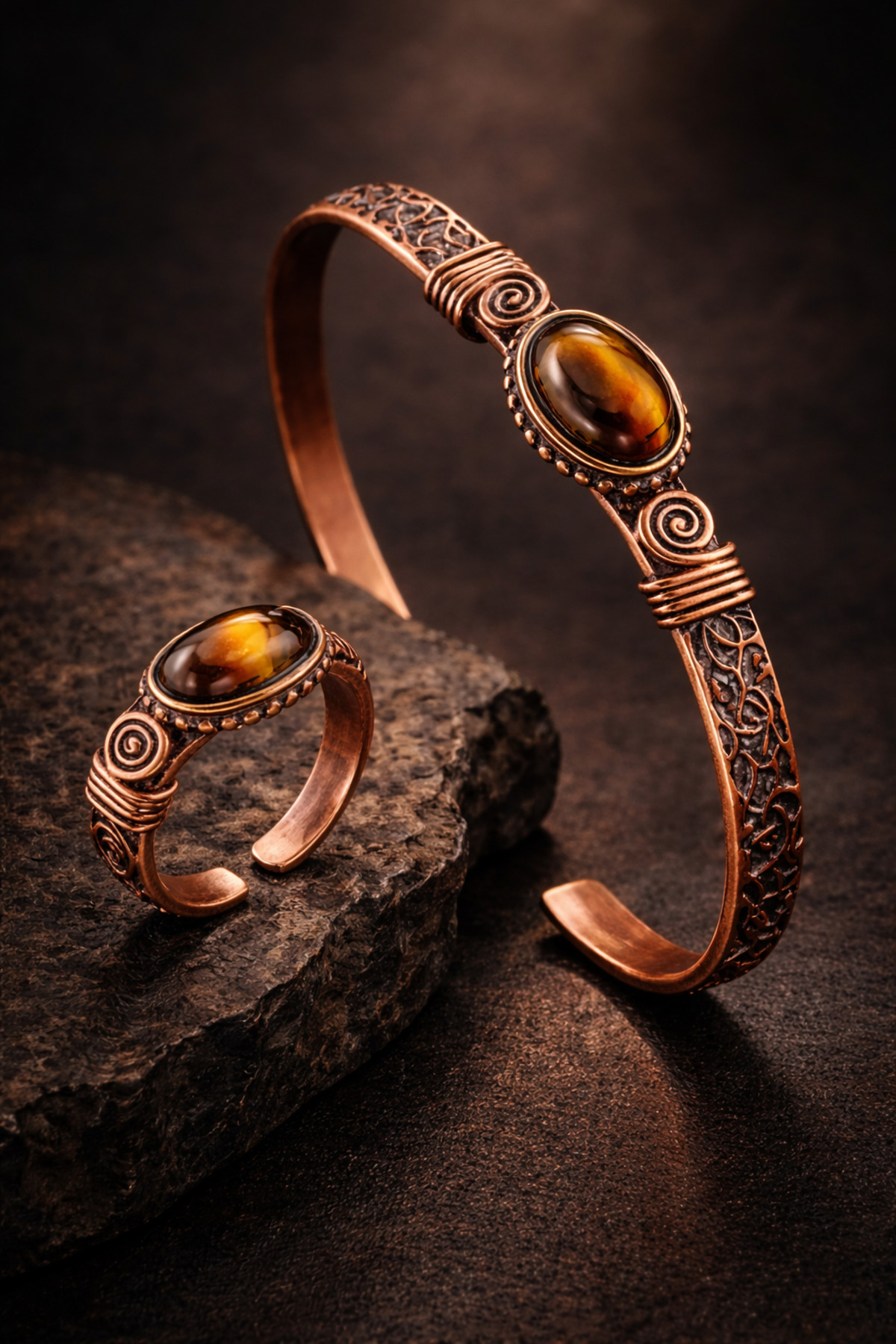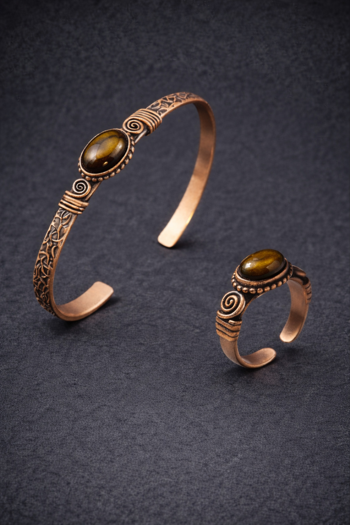 Combining the power of natural stone and the elegance of handcraft, the Tiger Eye Copper Set completes your style with its authentic and stylish design.